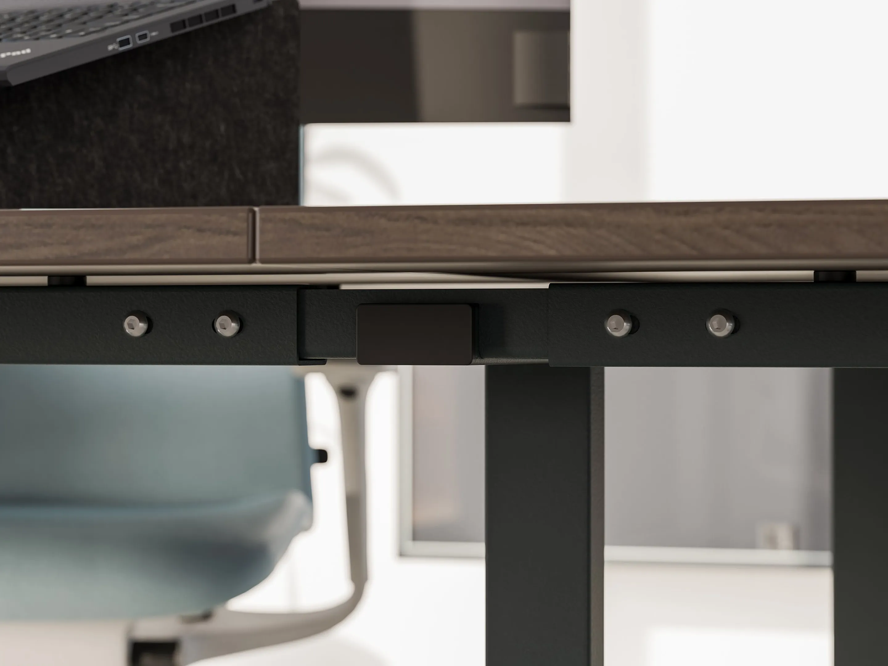 Bureau met 2 poten (hoogte instelbaar tussen 680-820mm d.m.v. "Easy-Push), waarvan de linker 1000mm diep, de rechter 800mm diep. Bureau heeft een rechte zitzijde, met een ronding in de hoek met een aanbouw zijde van 441mm. Afmeting: 1600 x 1000mm (BxD).