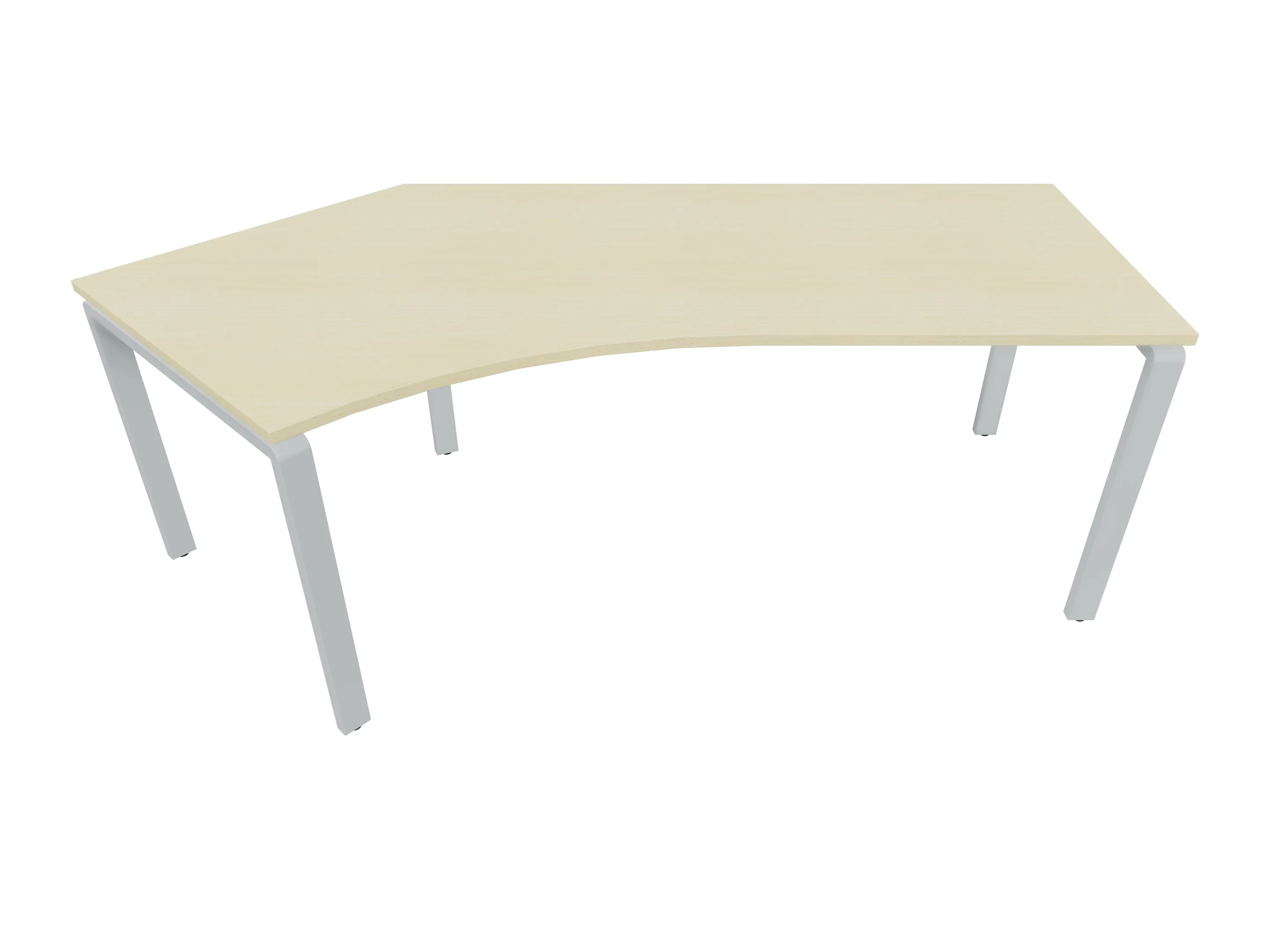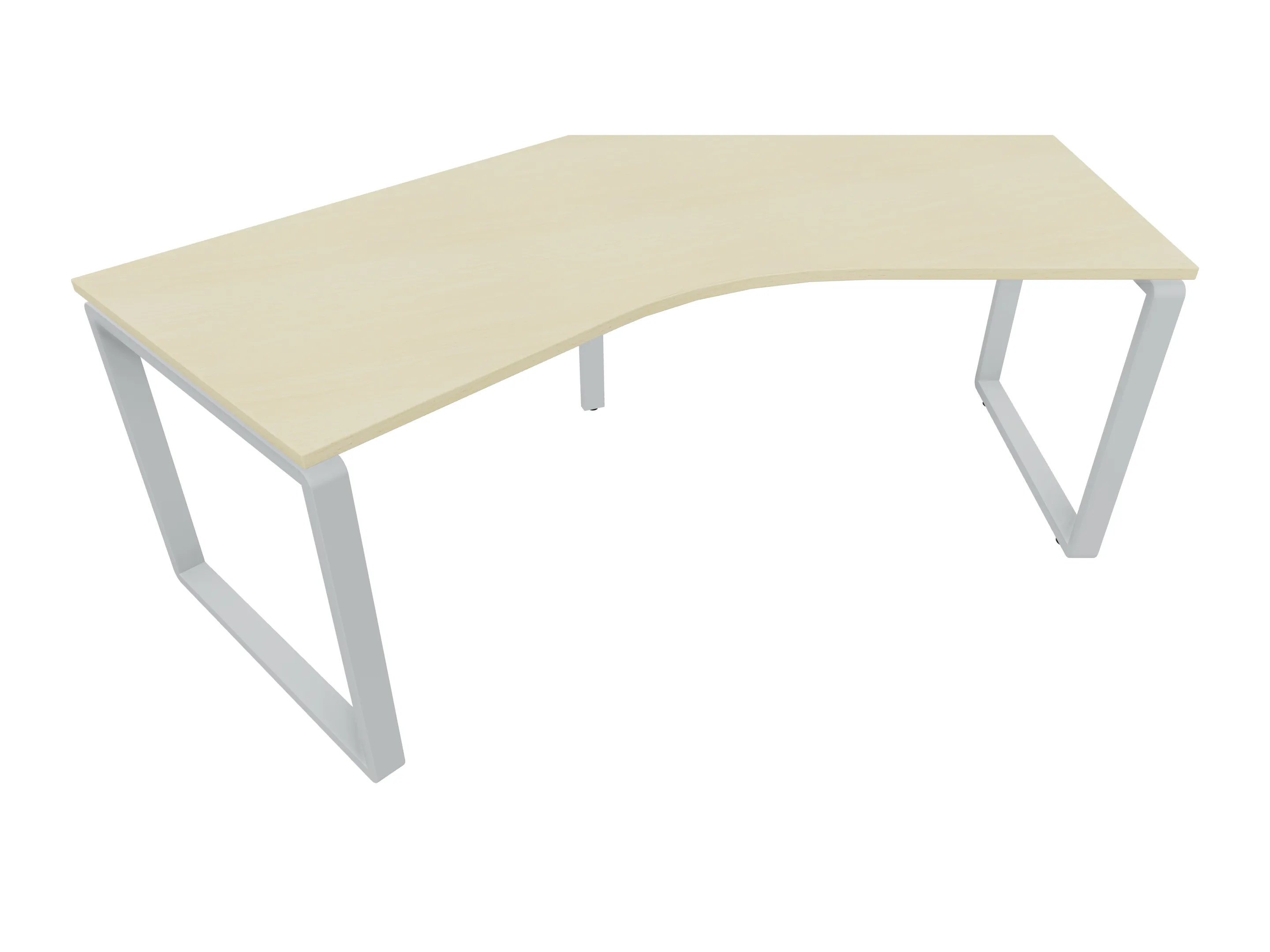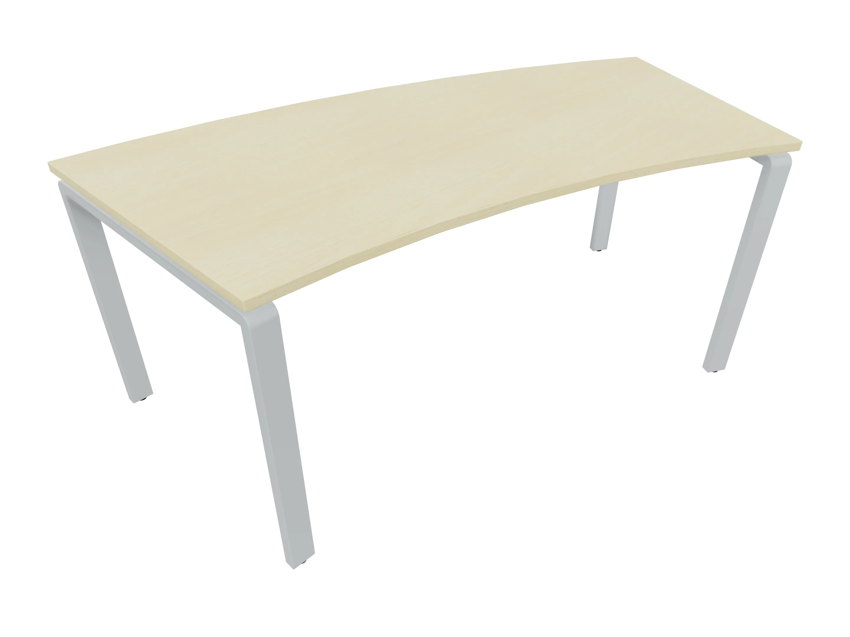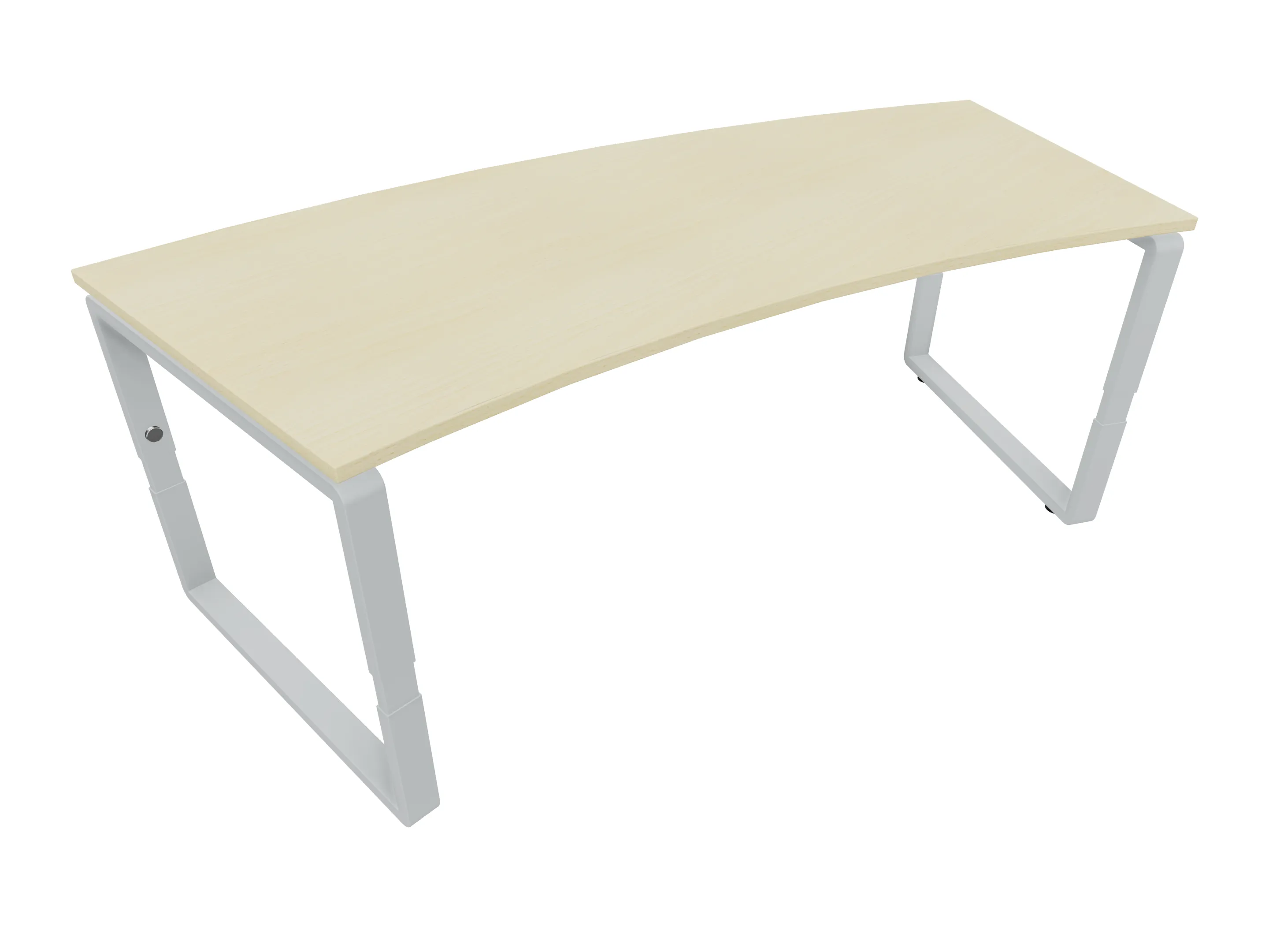 Bureau met 2 poten (vaste hoogte 720mm), waarvan beide 800mm diep. Bureaublad is in een boog geplaatst. Afmeting is 2000 x 800mm.
