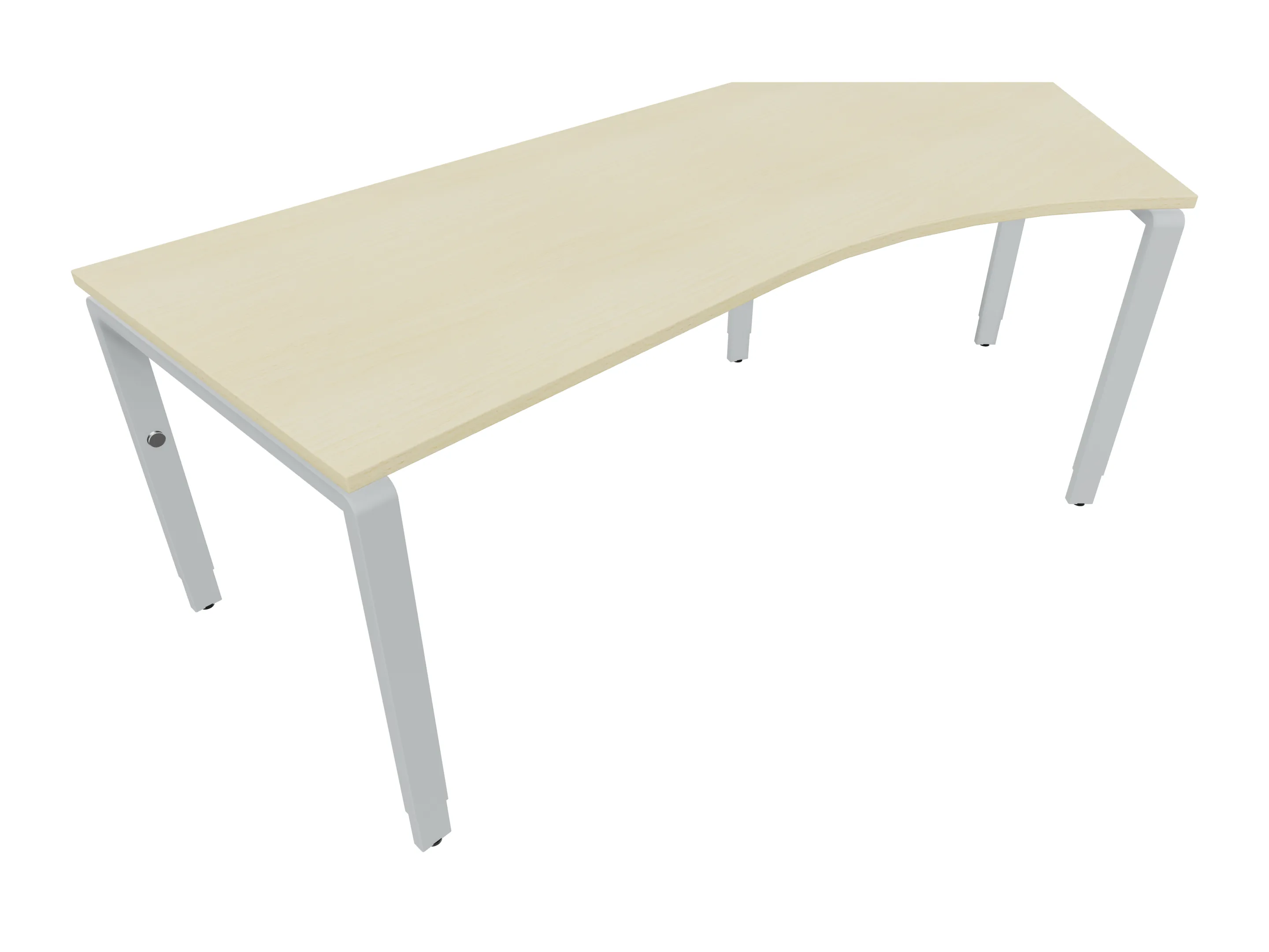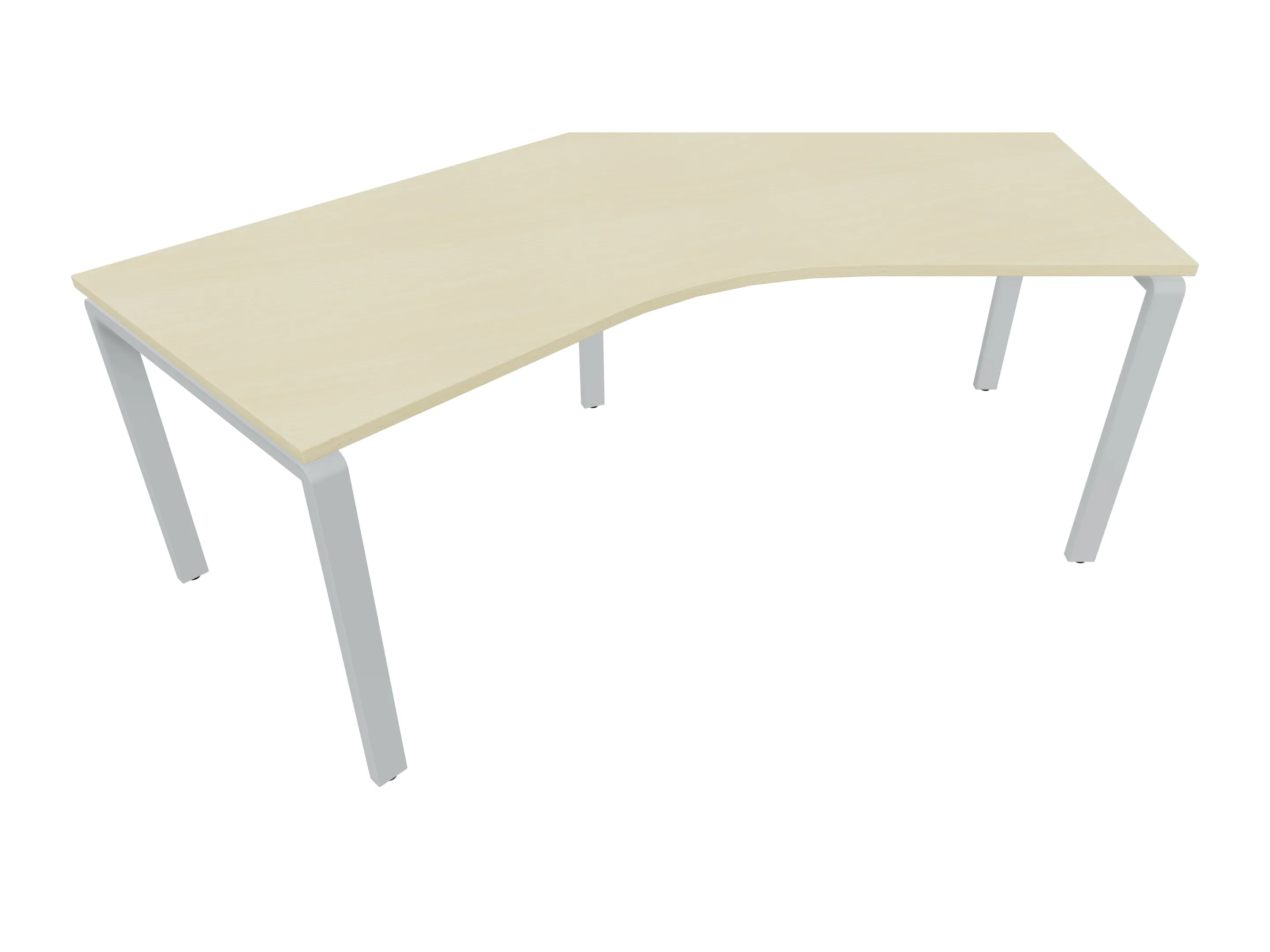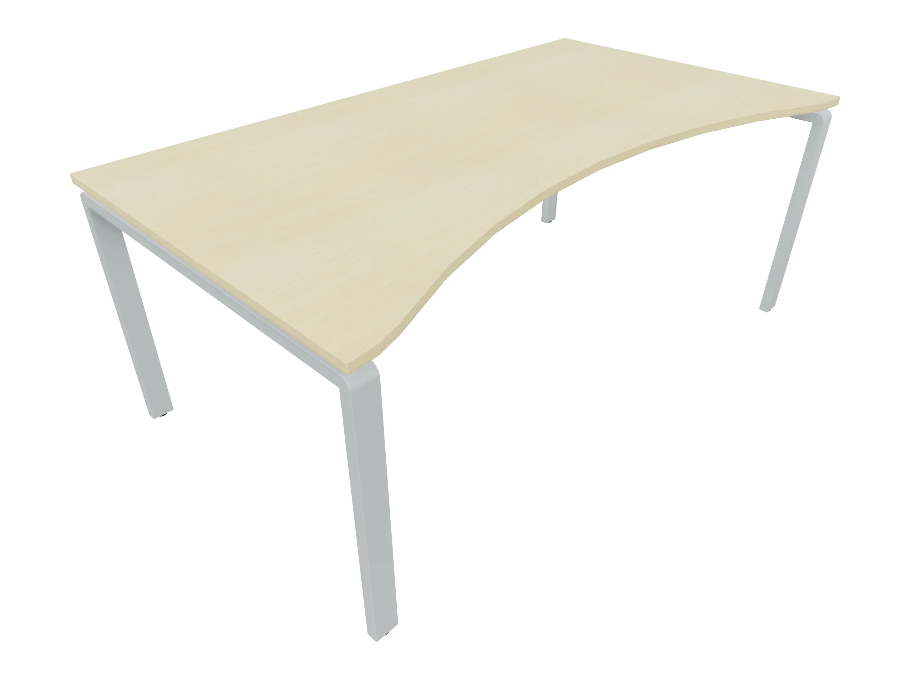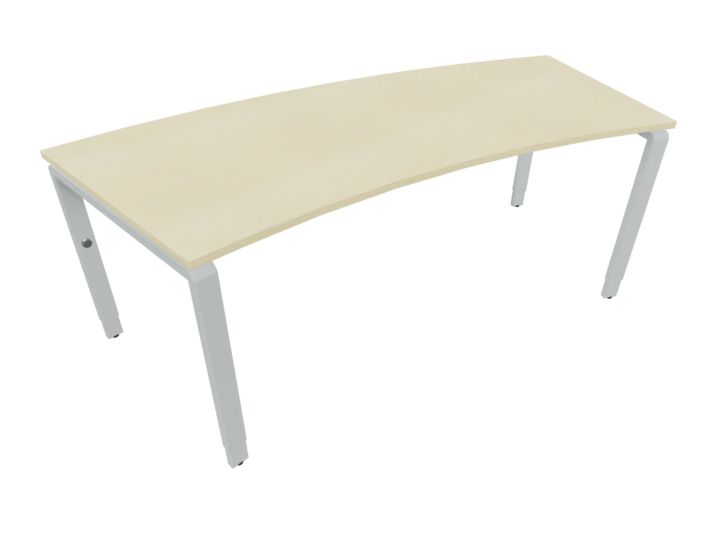 Bureau met 2 poten (vaste hoogte 720mm), waarvan beide 800mm diep. Bureaublad is in een boog geplaatst. Afmeting is 2000 x 800mm.