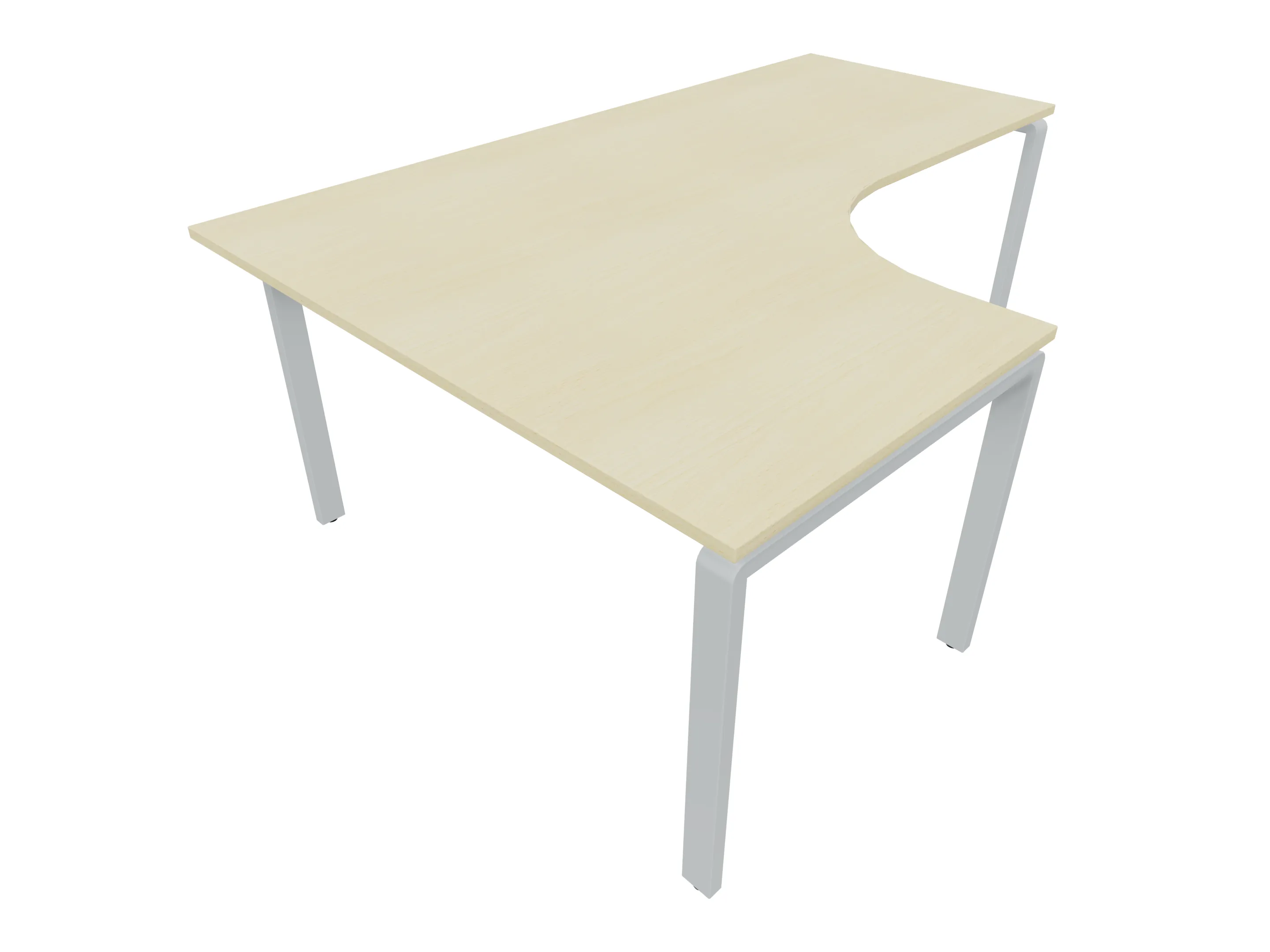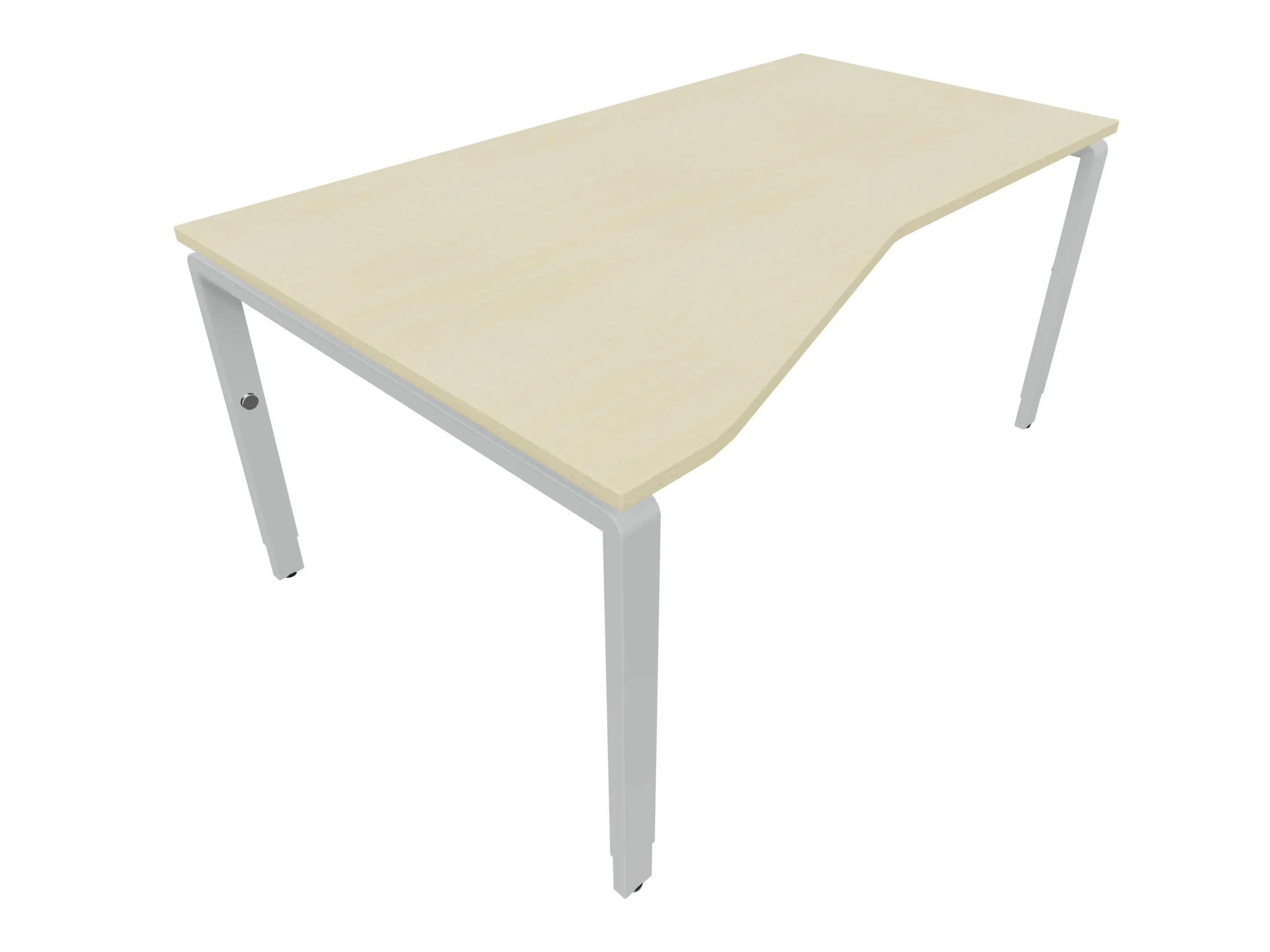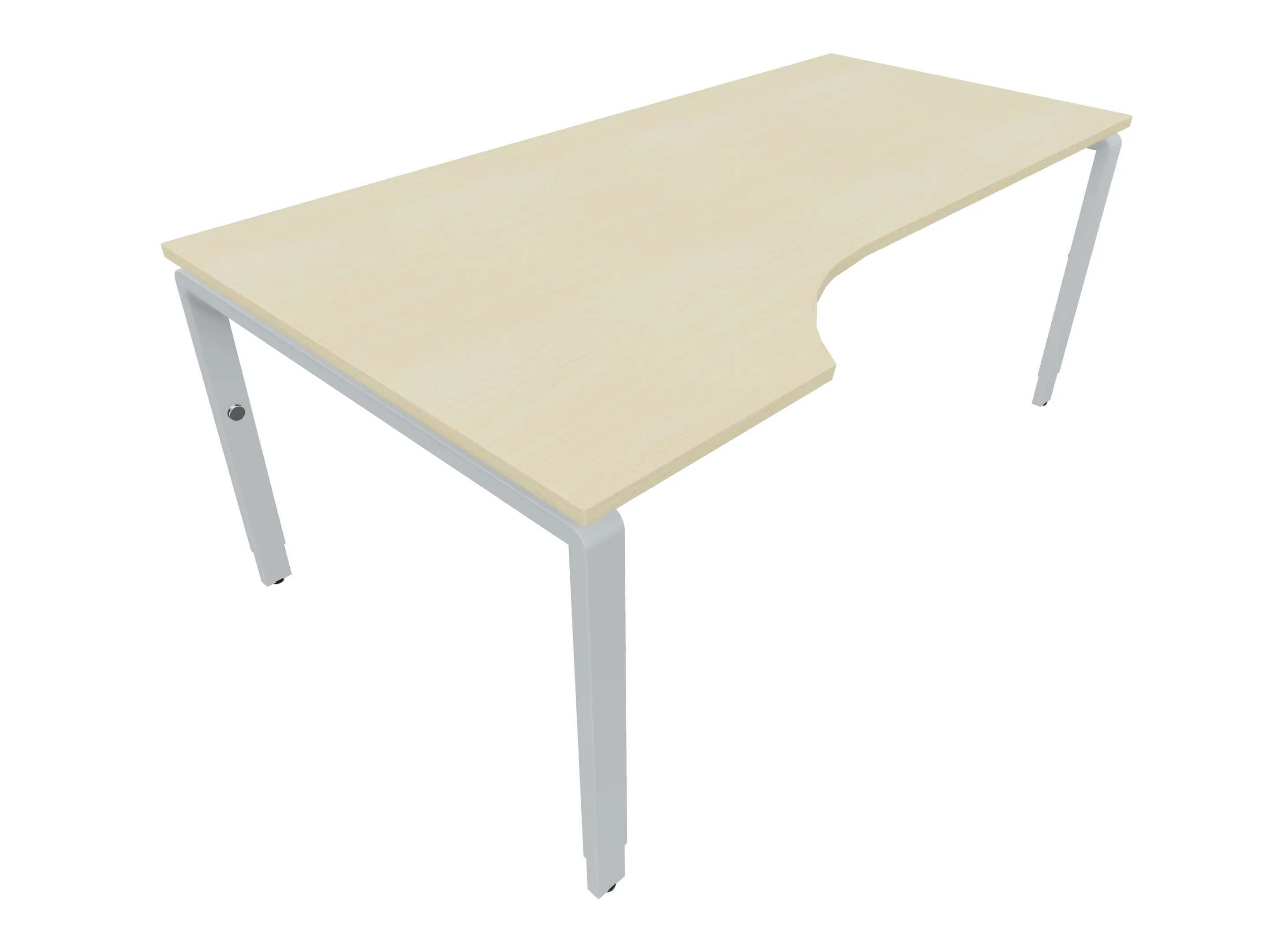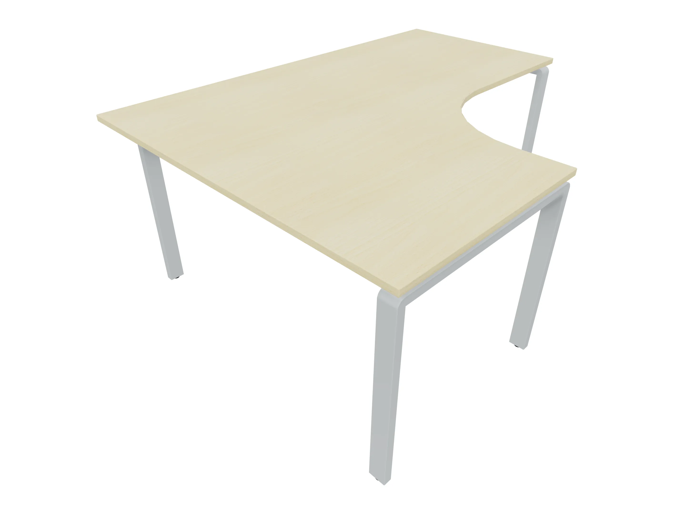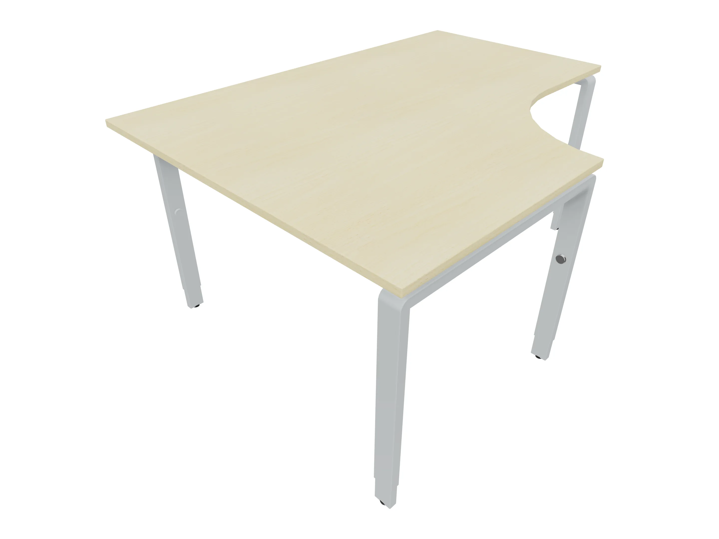 Bureau met 2 poten (vaste hoogte 720mm), waarvan de linker 1000mm diep, de rechter 800mm diep. Bureau heeft een rechte zitzijde, met een ronding in de hoek met een aanbouw zijde van 441mm. Afmeting: 1600 x 1000mm (BxD).