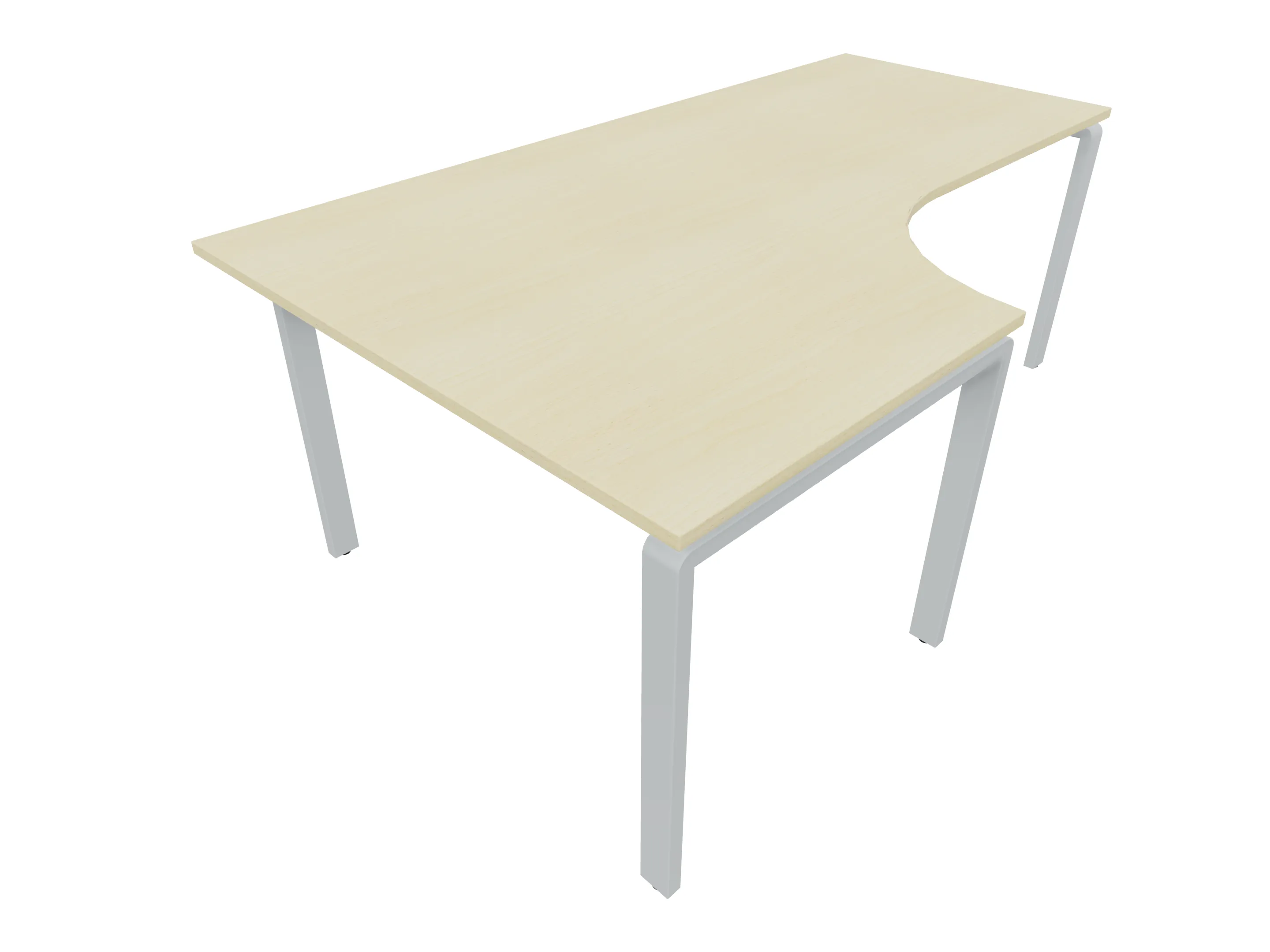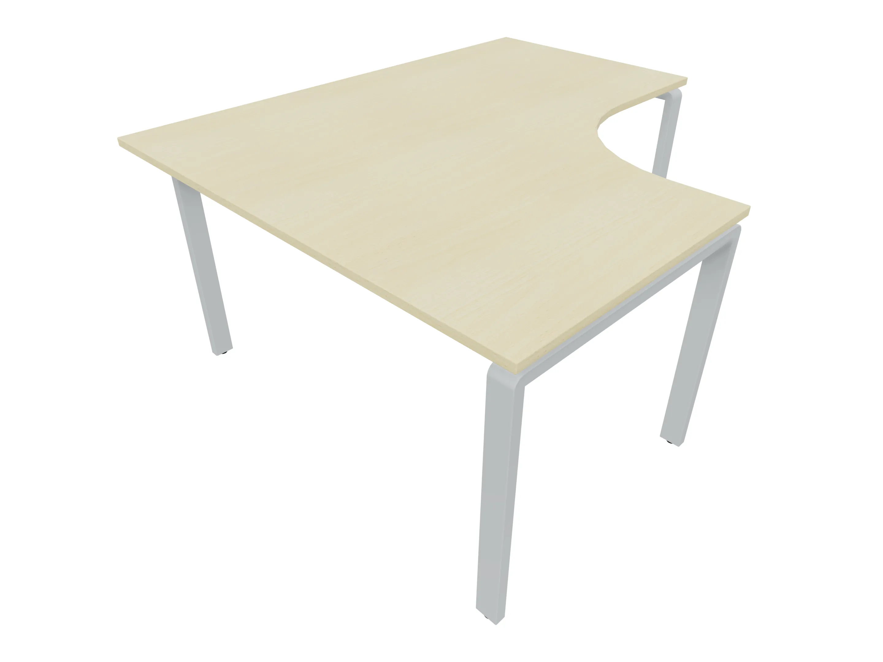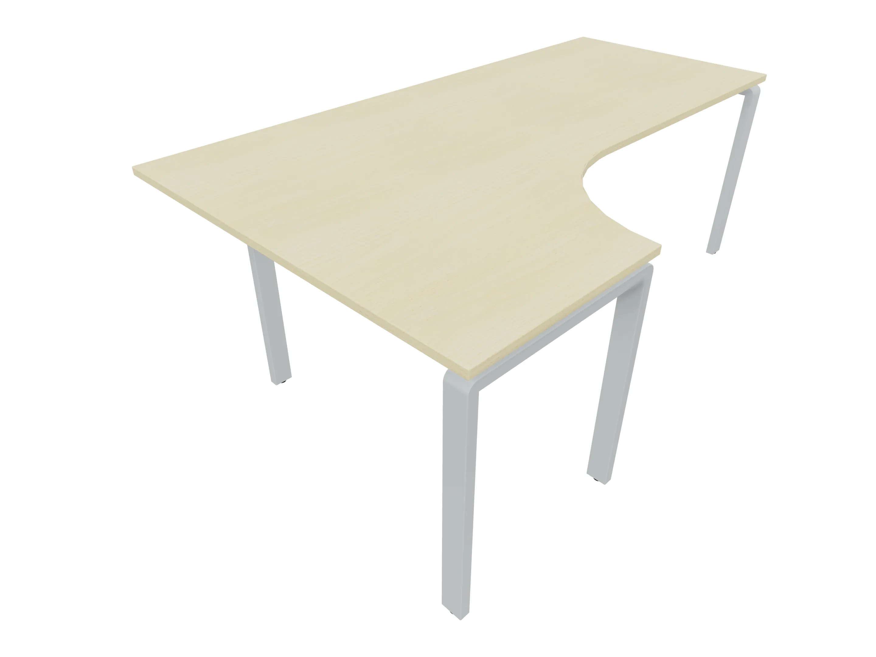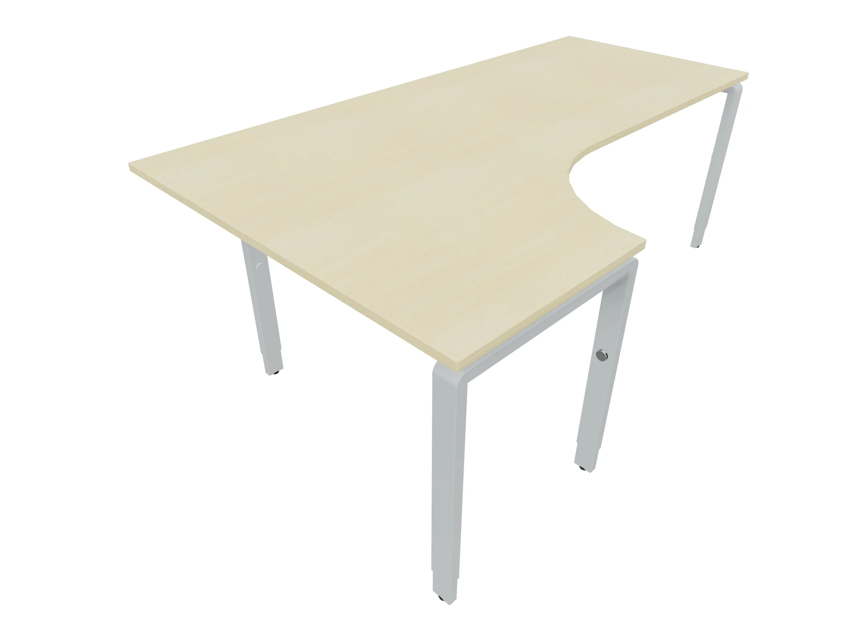Bureau met 2 poten (vaste hoogte 720mm), waarvan de linker 1000mm diep, de rechter 800mm diep. Bureau heeft een rechte zitzijde, met een ronding in de hoek met een aanbouw zijde van 441mm. Afmeting: 1600 x 1000mm (BxD).