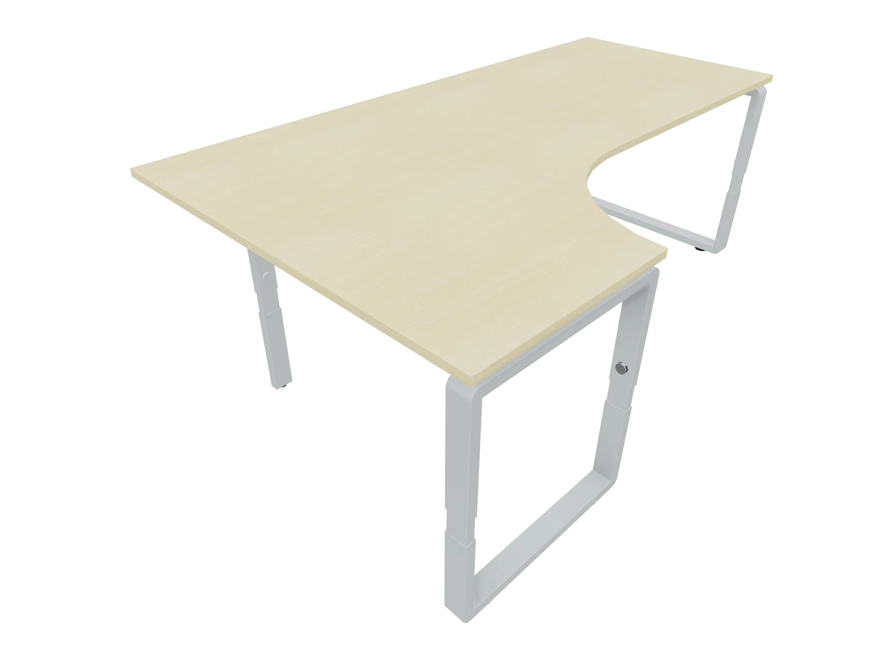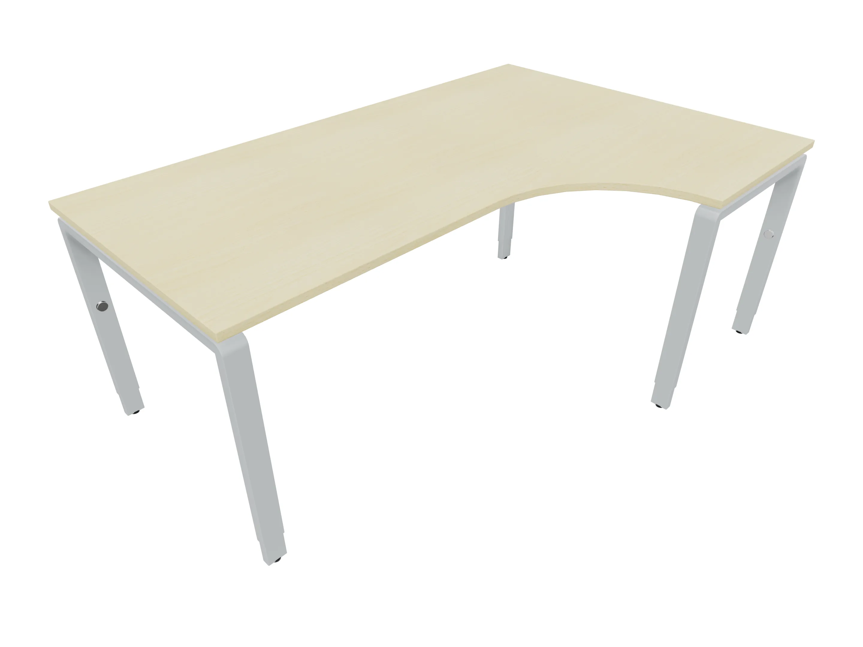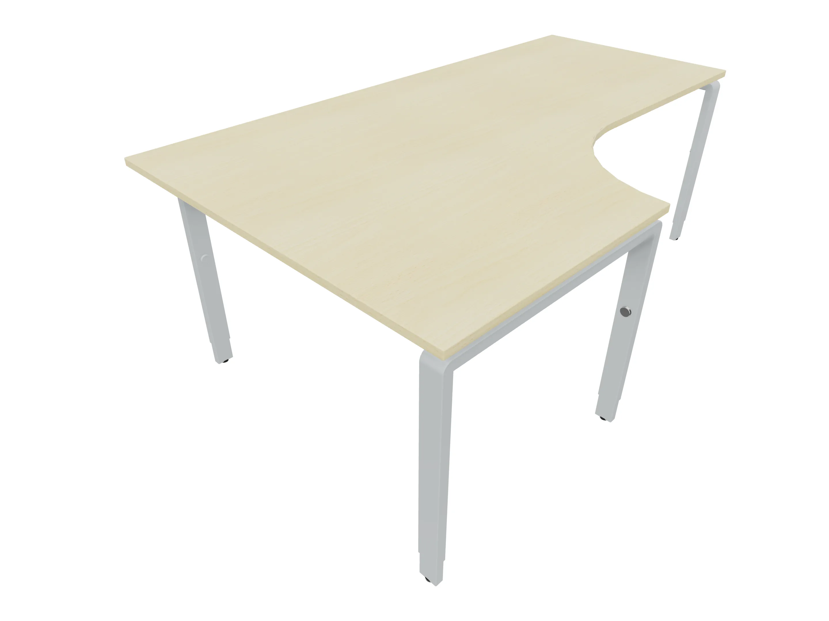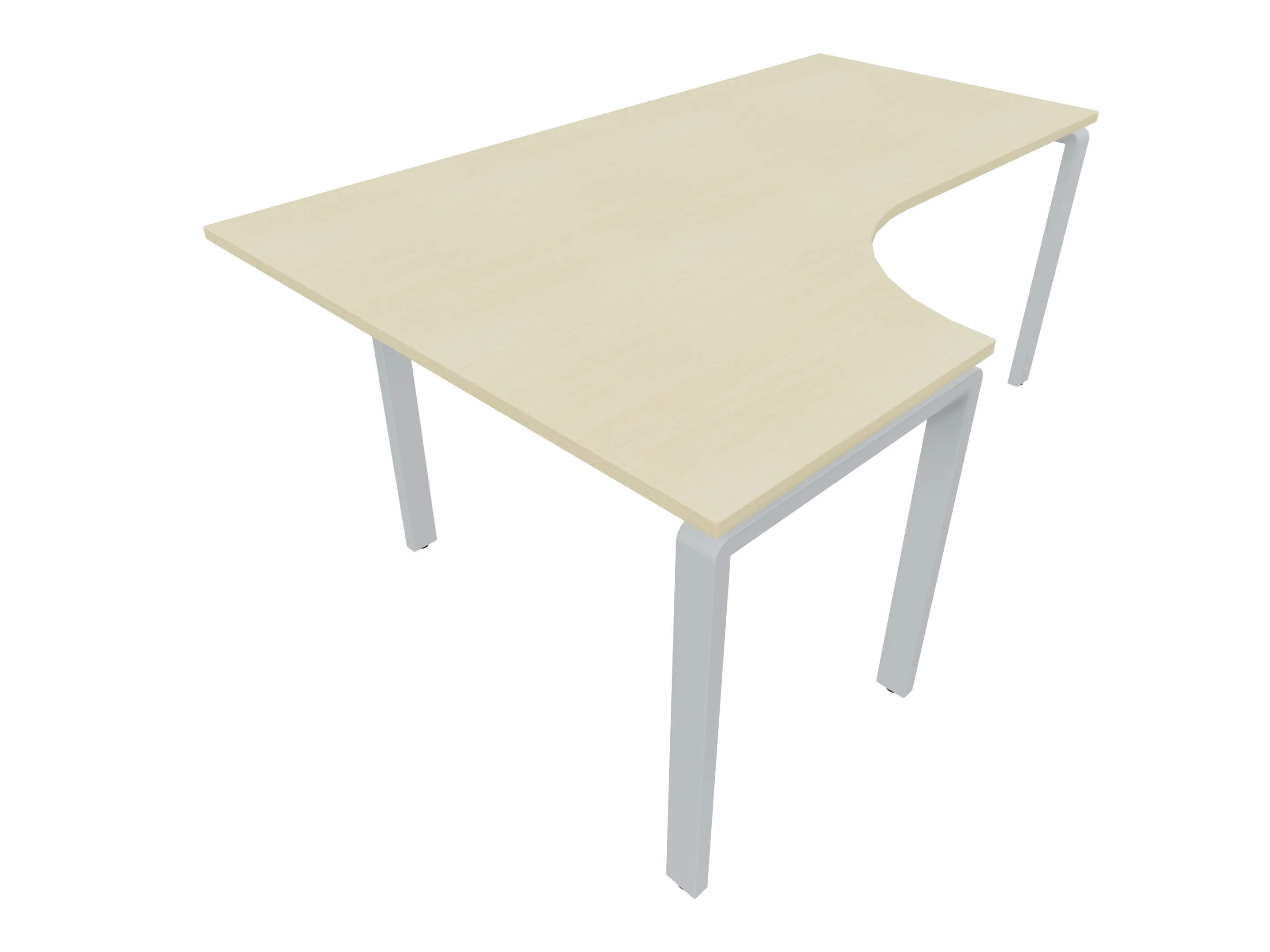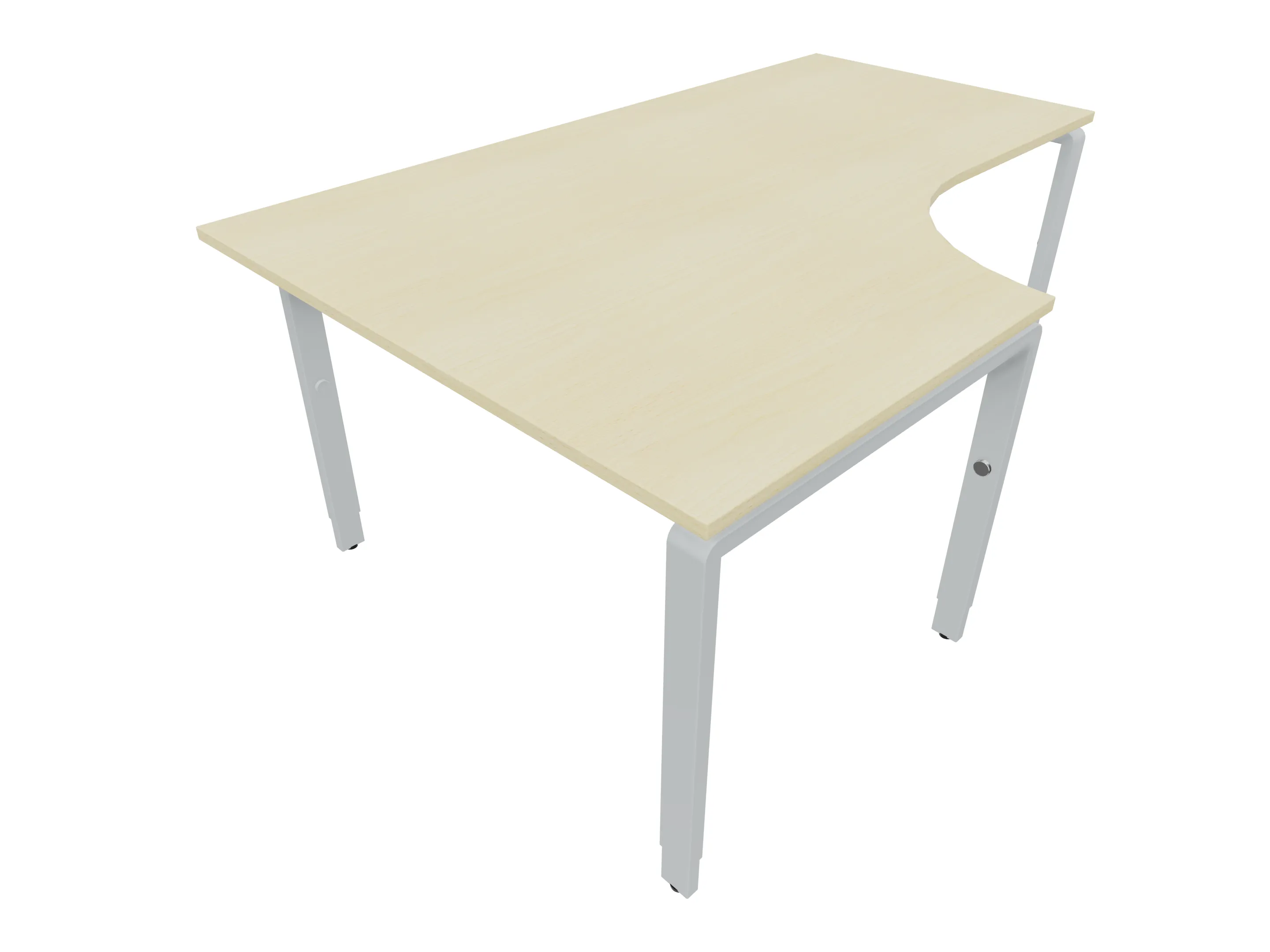 Bureau met 2 poten (vaste hoogte 720mm), waarvan de linker 1000mm diep, de rechter 800mm diep. Bureau heeft een rechte zitzijde, met een ronding in de hoek met een aanbouw zijde van 441mm. Afmeting: 1600 x 1000mm (BxD).