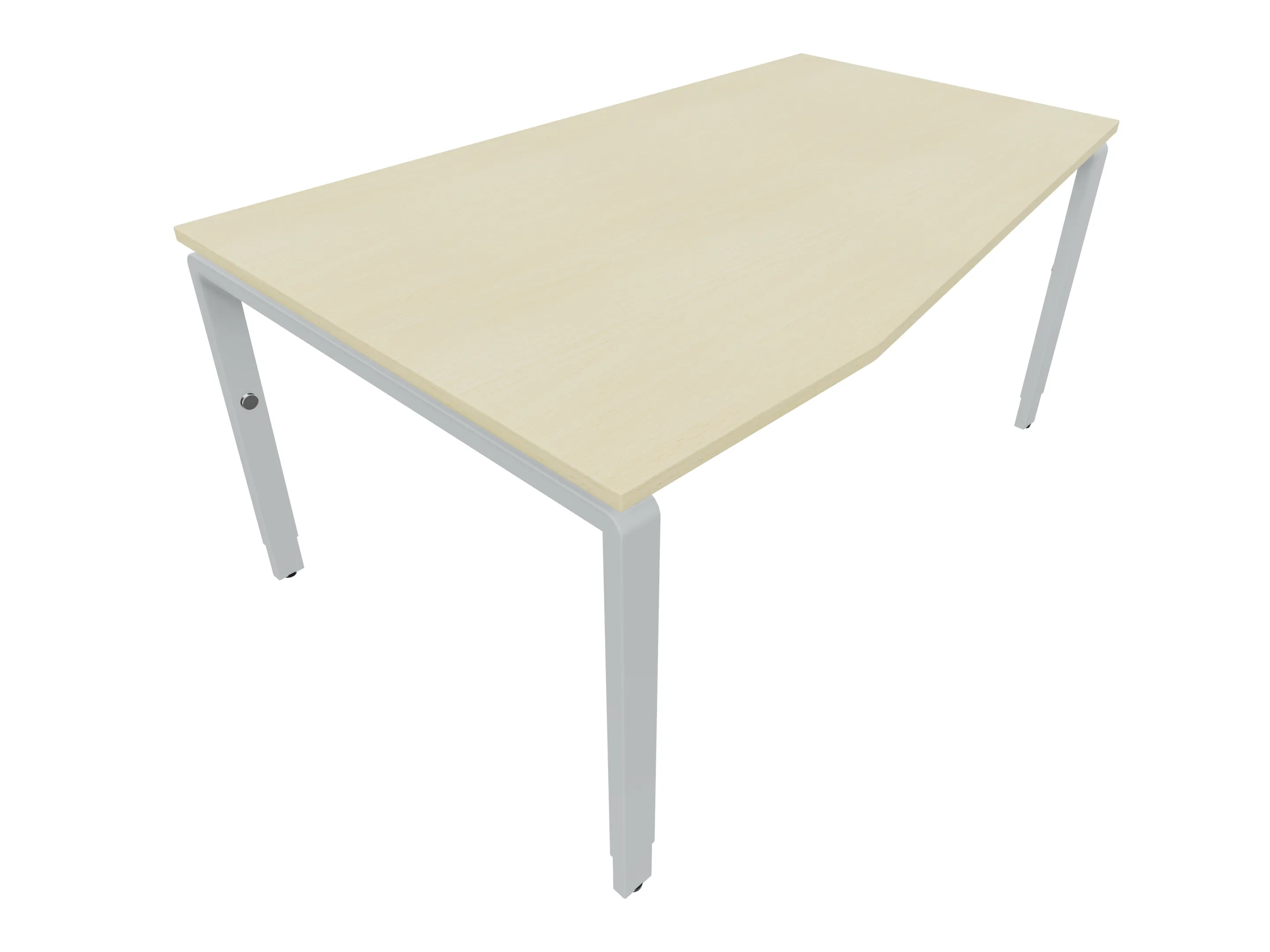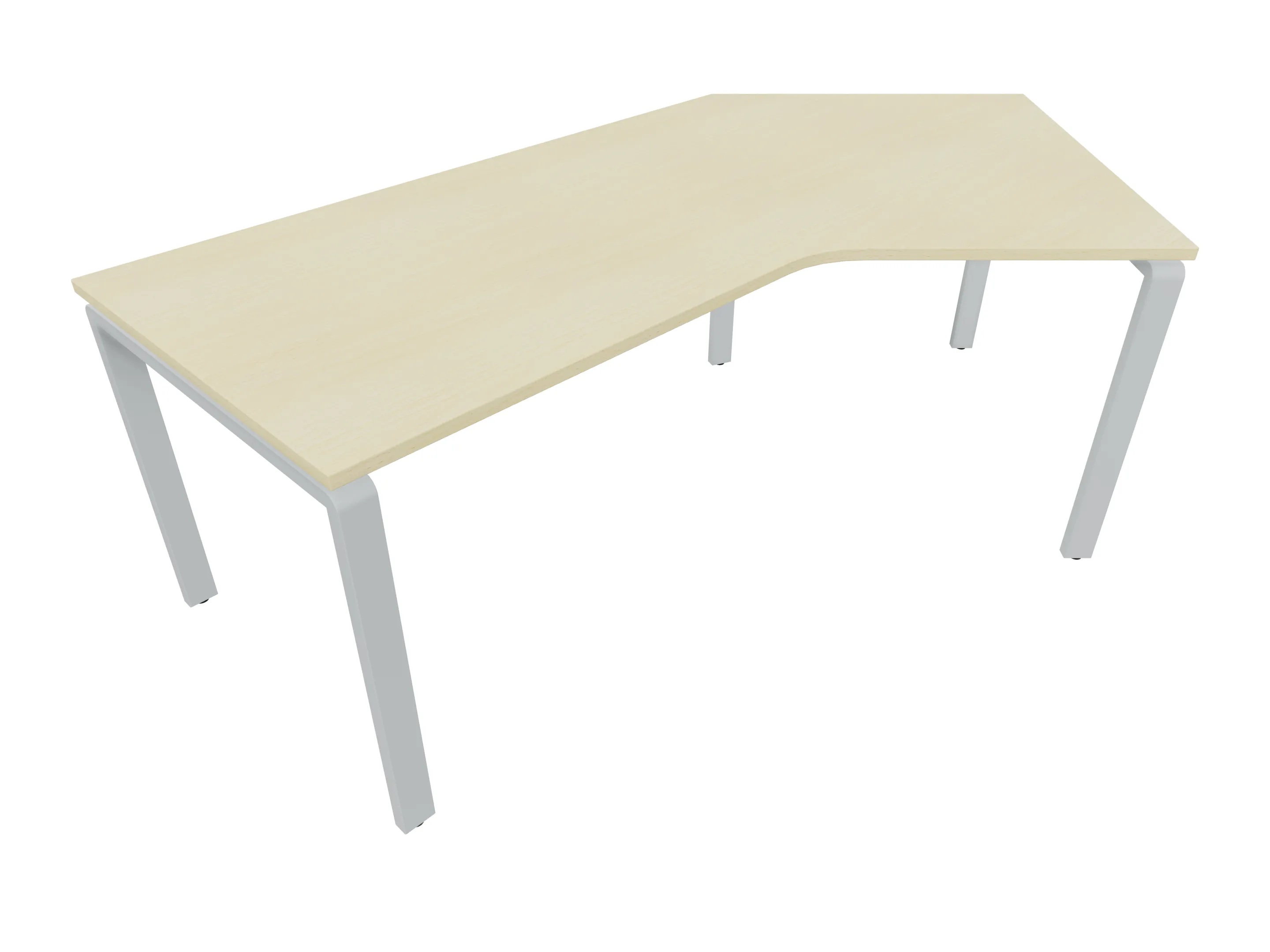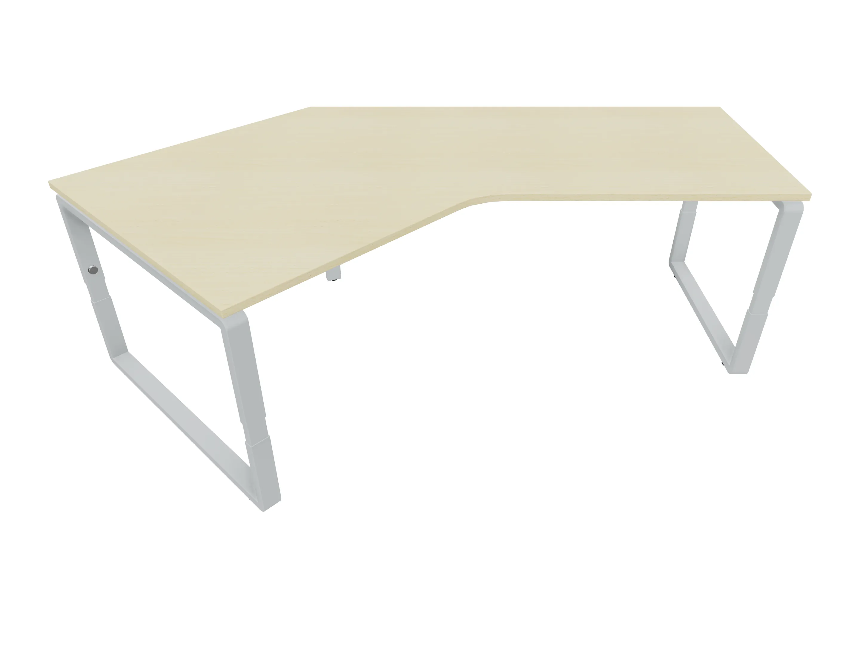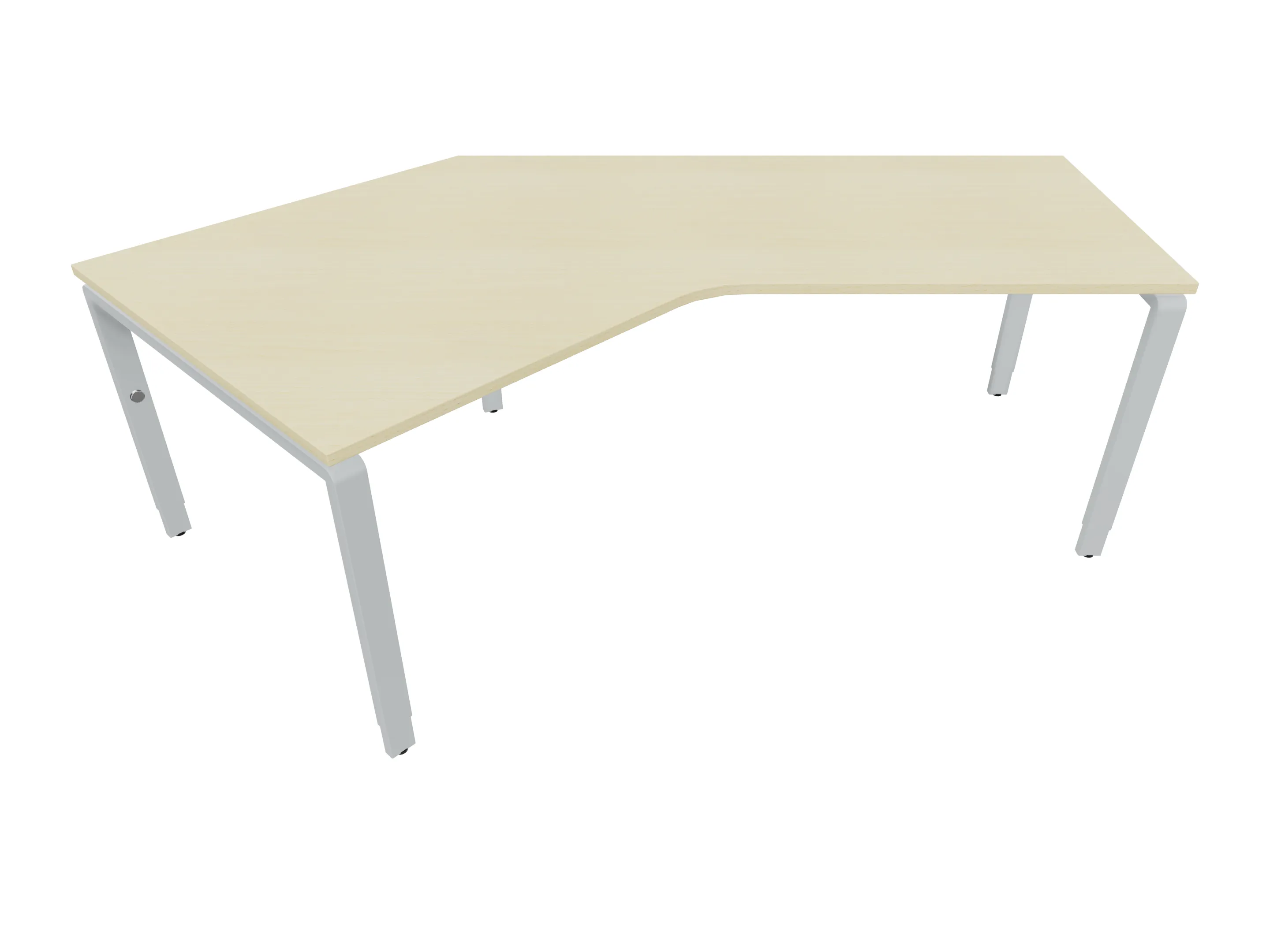 Bureau met 2 poten (vaste hoogte 720mm), waarvan de linker 1000mm diep, de rechter 800mm diep. Bureau heeft een rechte zitzijde, met een schuine zijde van 675mm. Afmeting: 1600 x 1000mm (BxD).