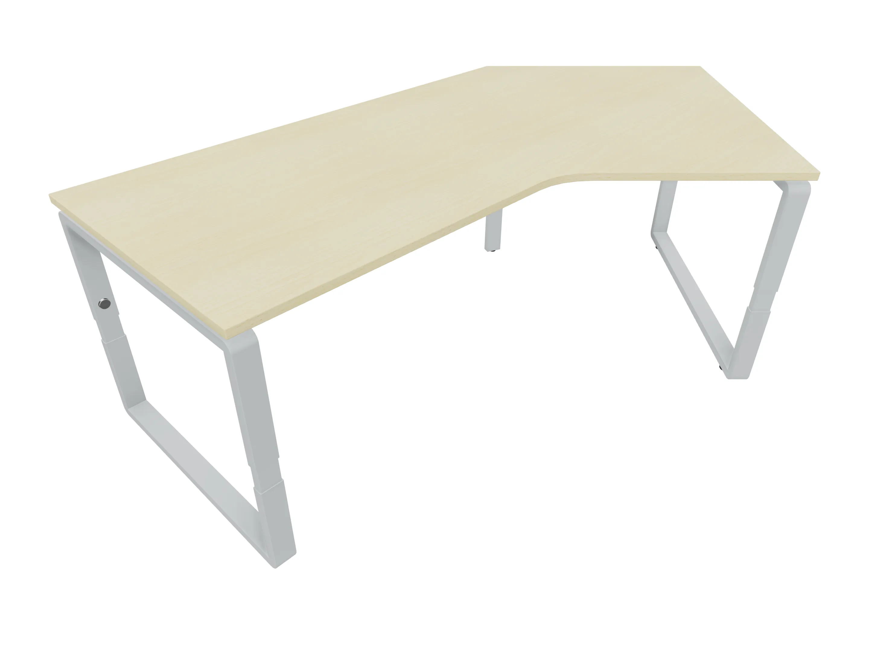 Bureau met 2 poten (vaste hoogte 720mm), waarvan de linker 1000mm diep, de rechter 800mm diep. Bureau heeft een rechte zitzijde, met een ronding in de hoek met een aanbouw zijde van 441mm. Afmeting: 2000 x 1000mm (BxD).