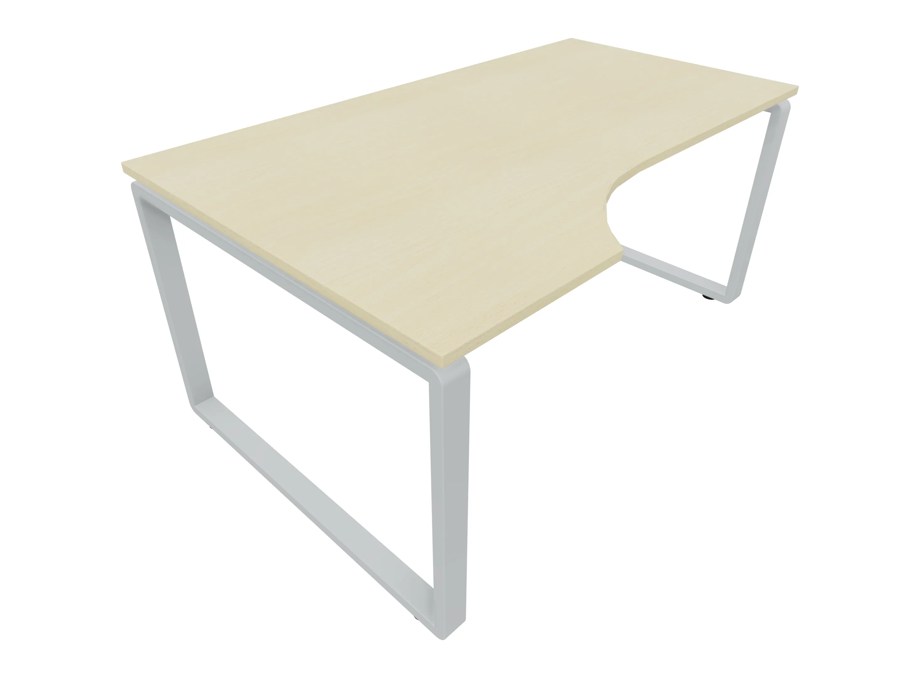 Bureau met 2 poten (vaste hoogte 720mm), waarvan beide 1000mm diep. Bureau heeft een cockpit vorm met doorlopende radius. Afmeting: 1600 x 1000mm (BxD).