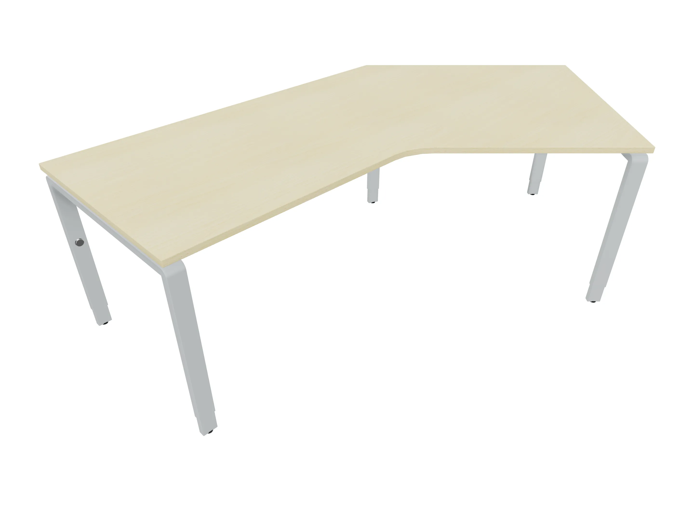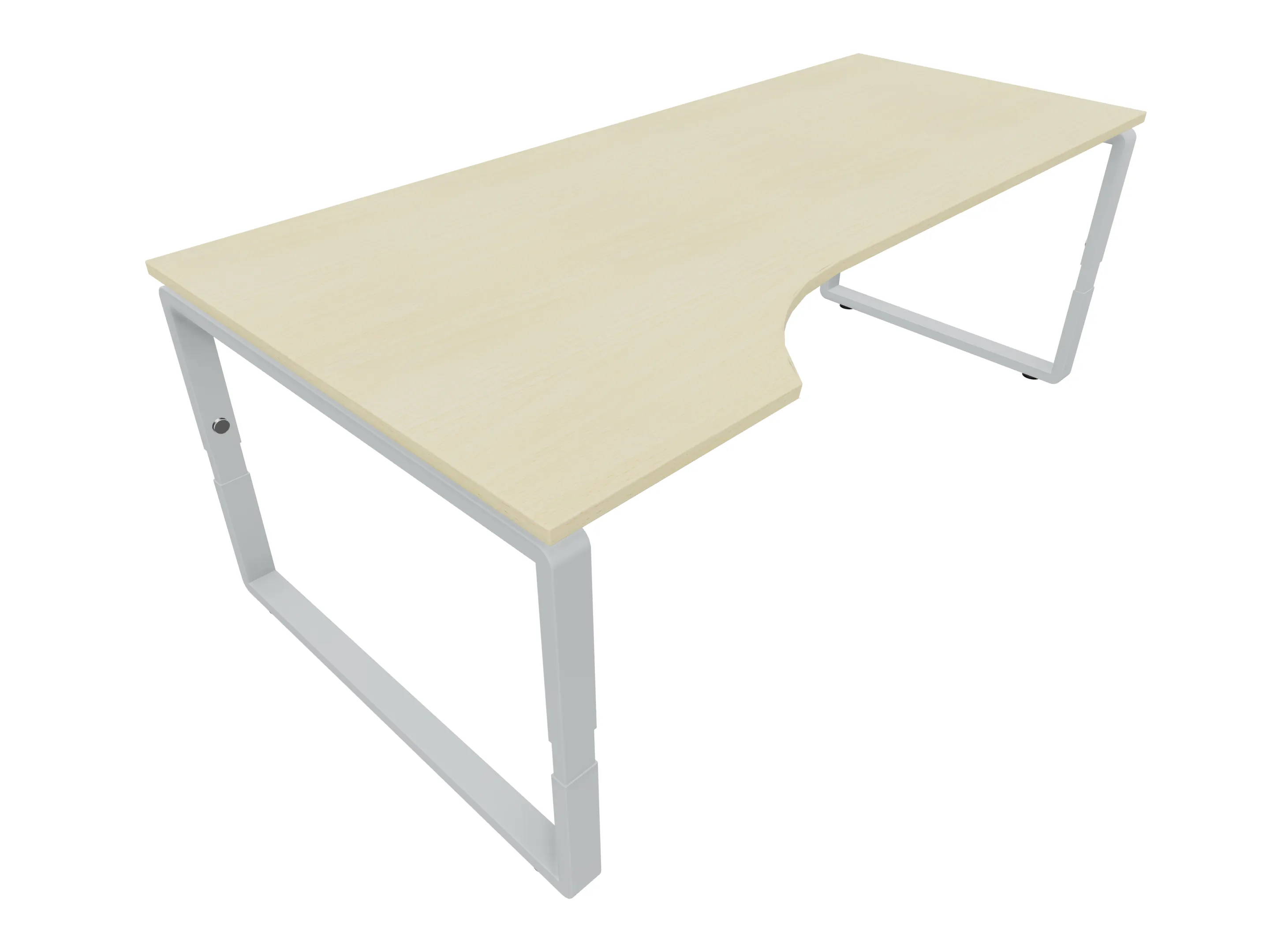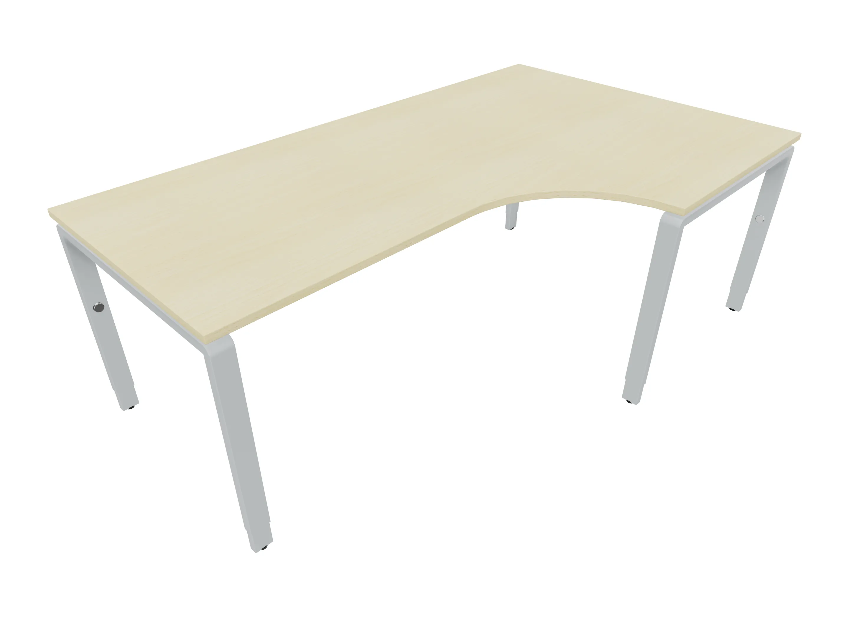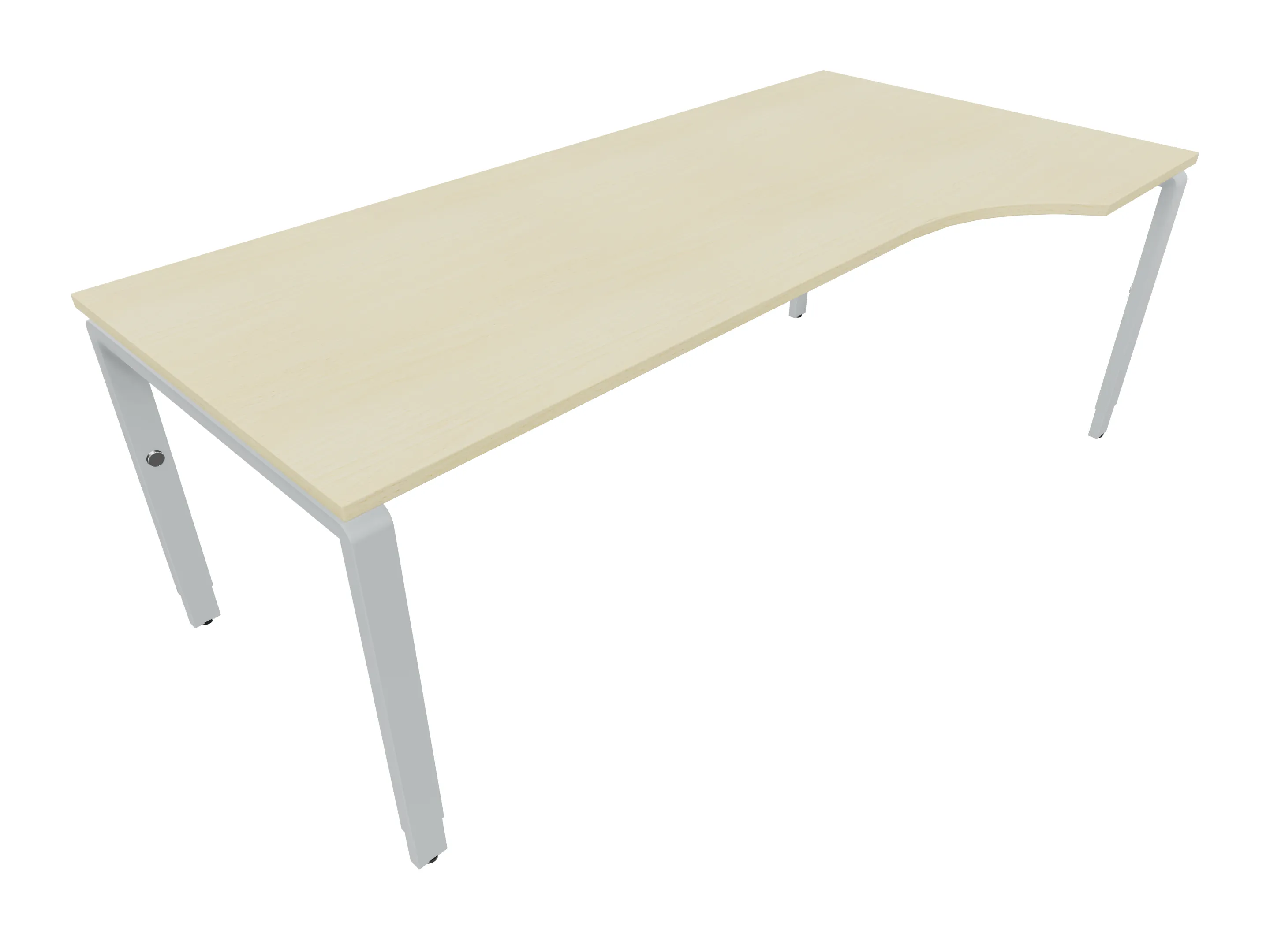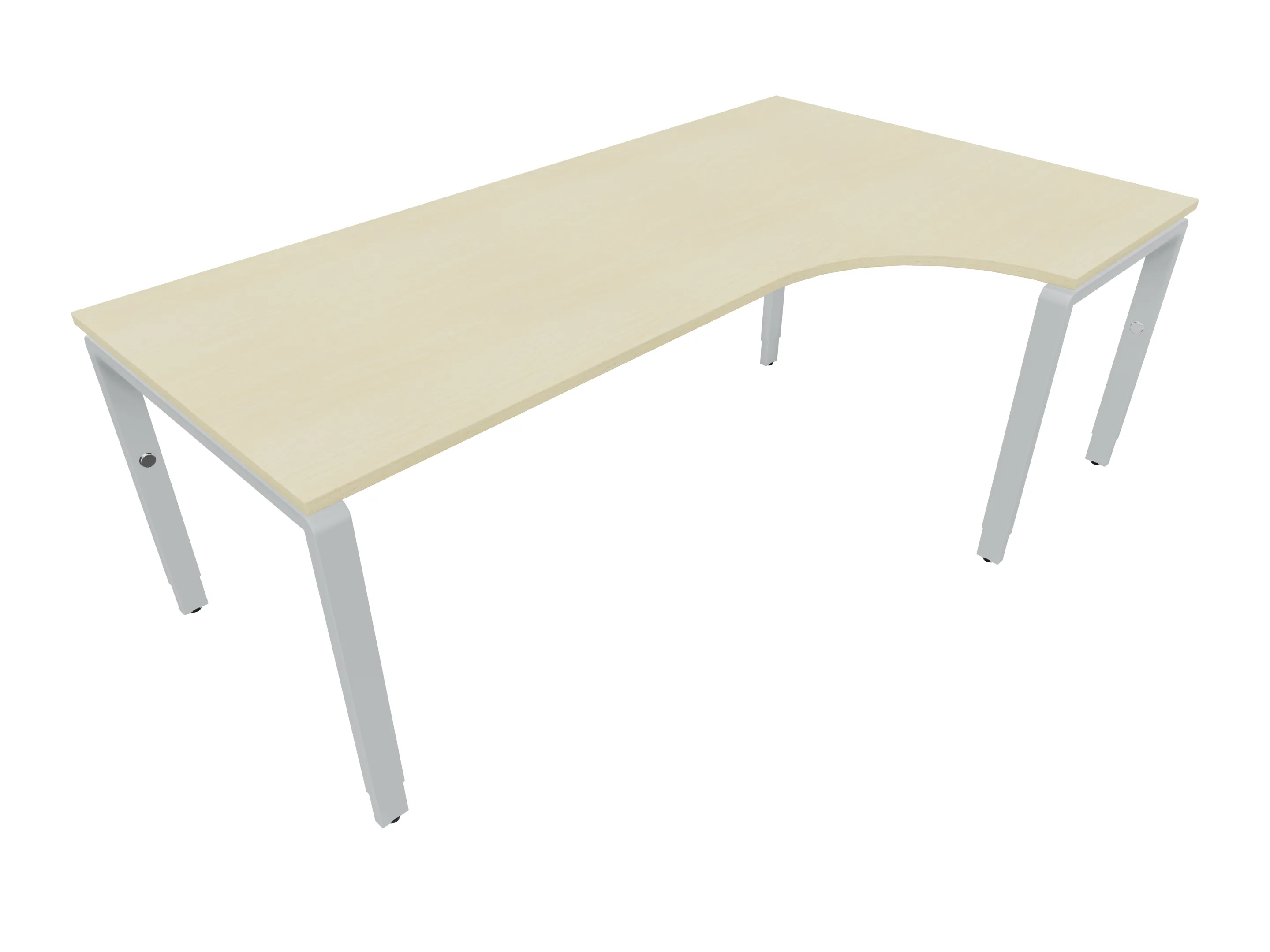 Bureau met 2 poten (vaste hoogte 720mm), waarvan de rechter 1000mm diep, de linker 800mm diep. Bureau heeft een rechte zitzijde, met een ronding in de hoek met een aanbouw zijde van 441mm. Afmeting: 2000 x 1000mm (BxD).