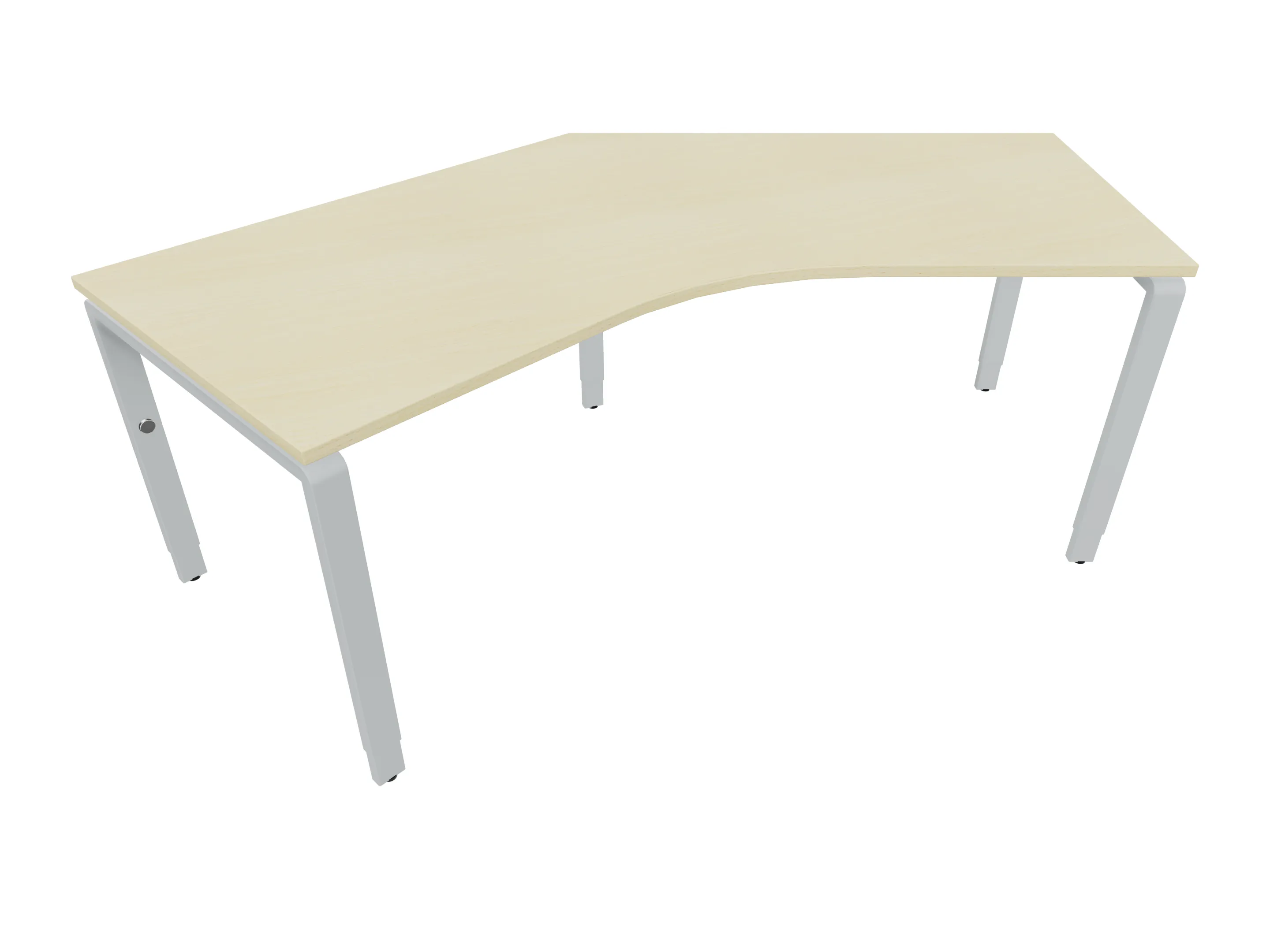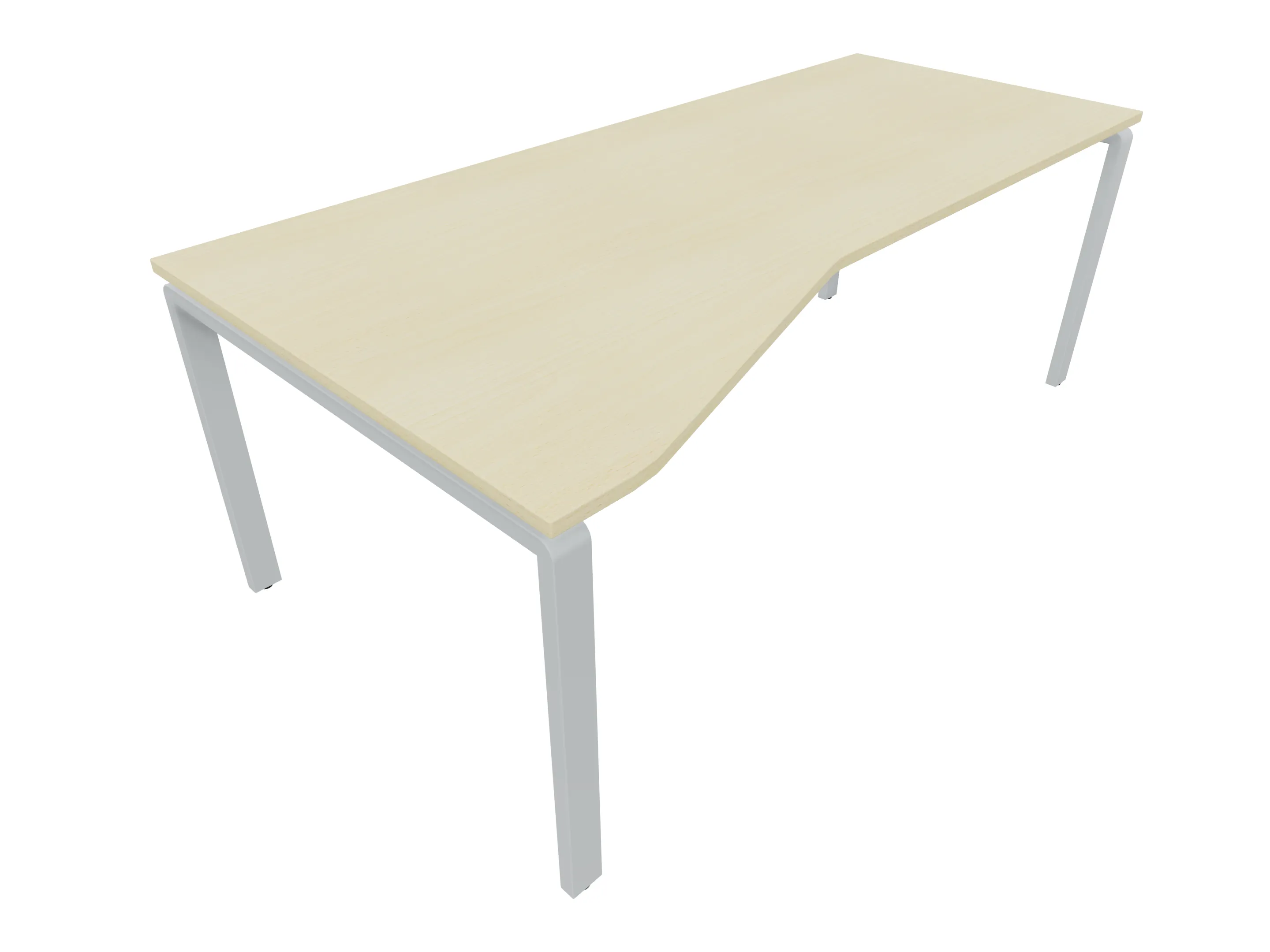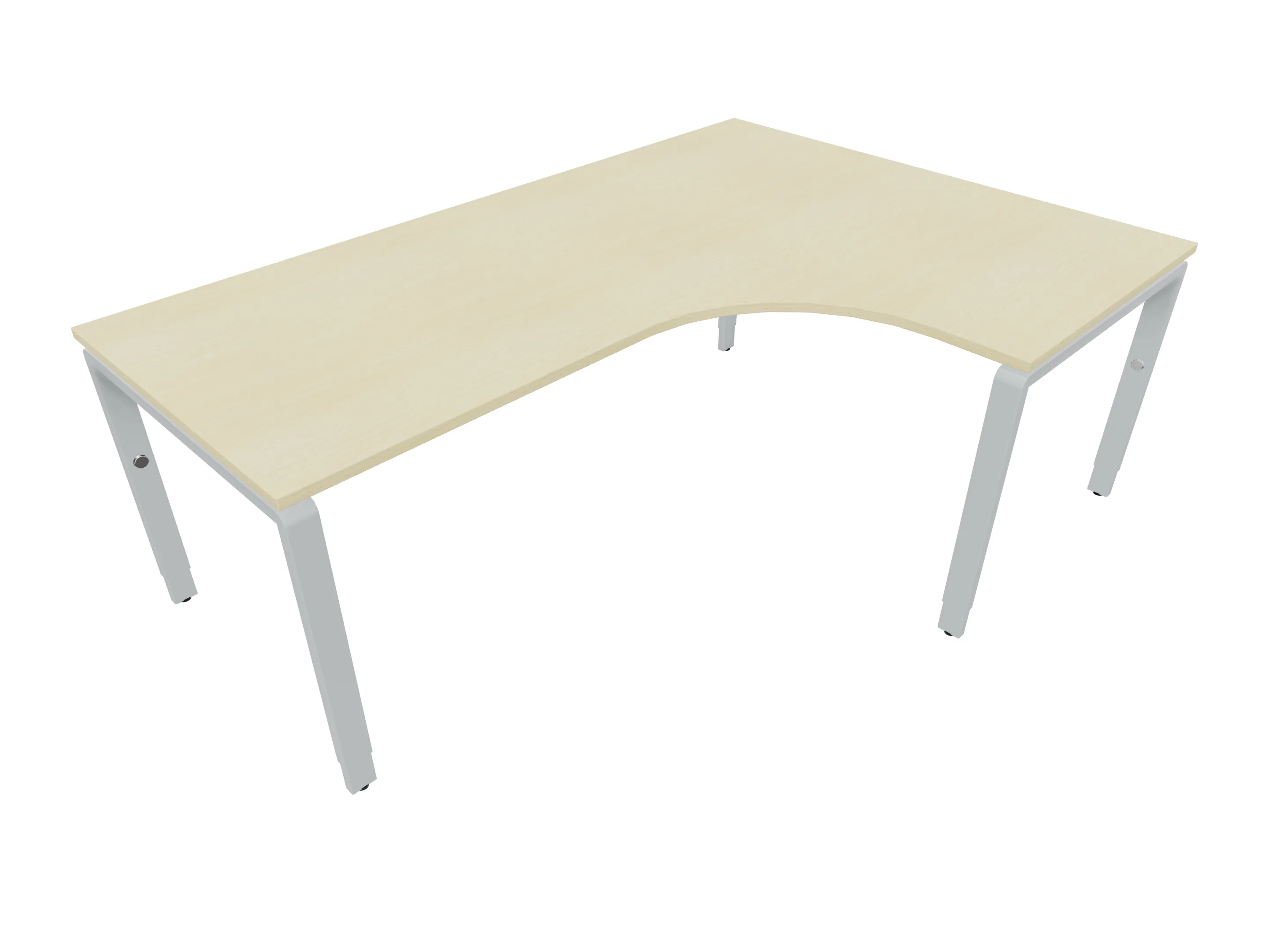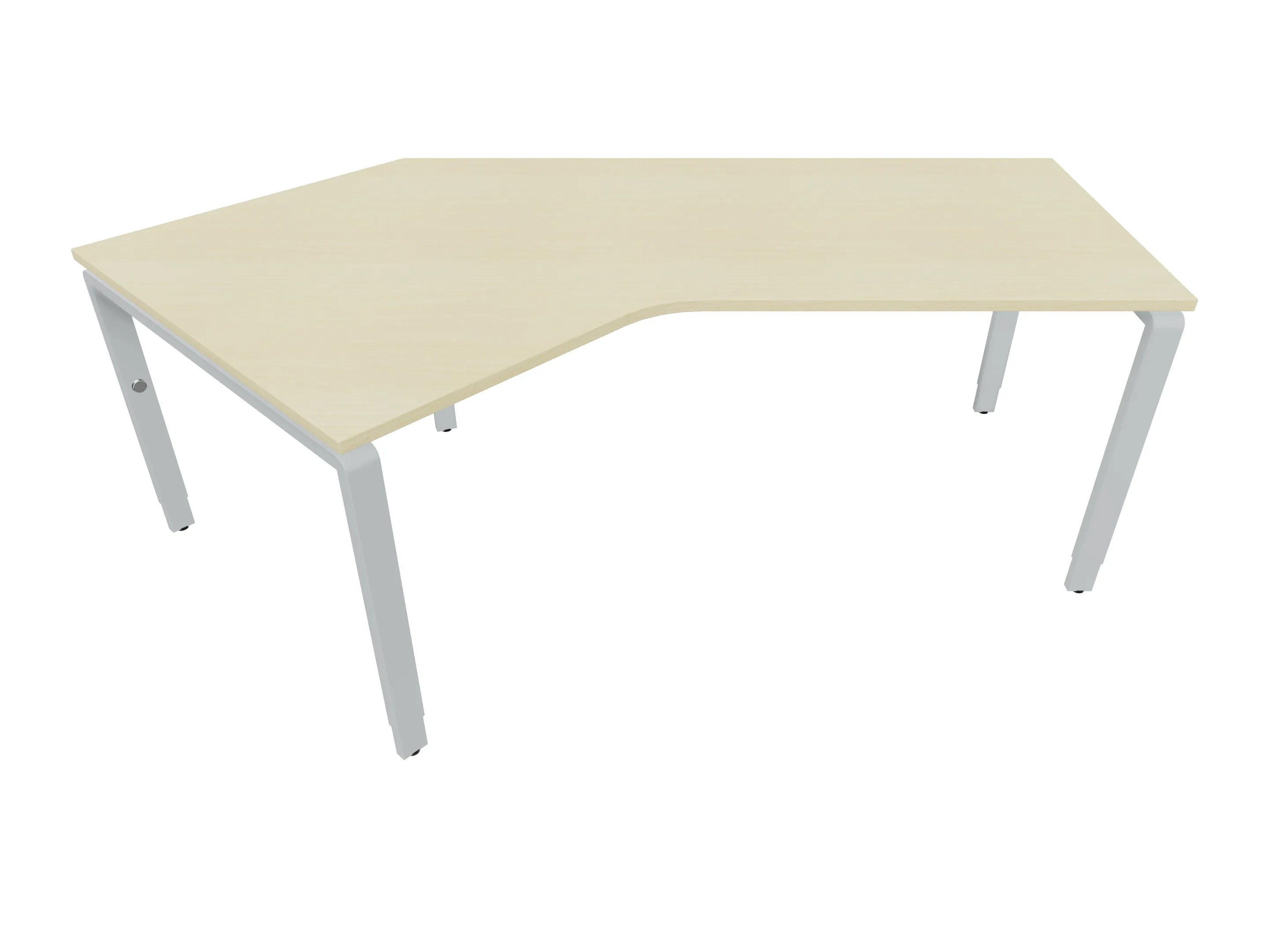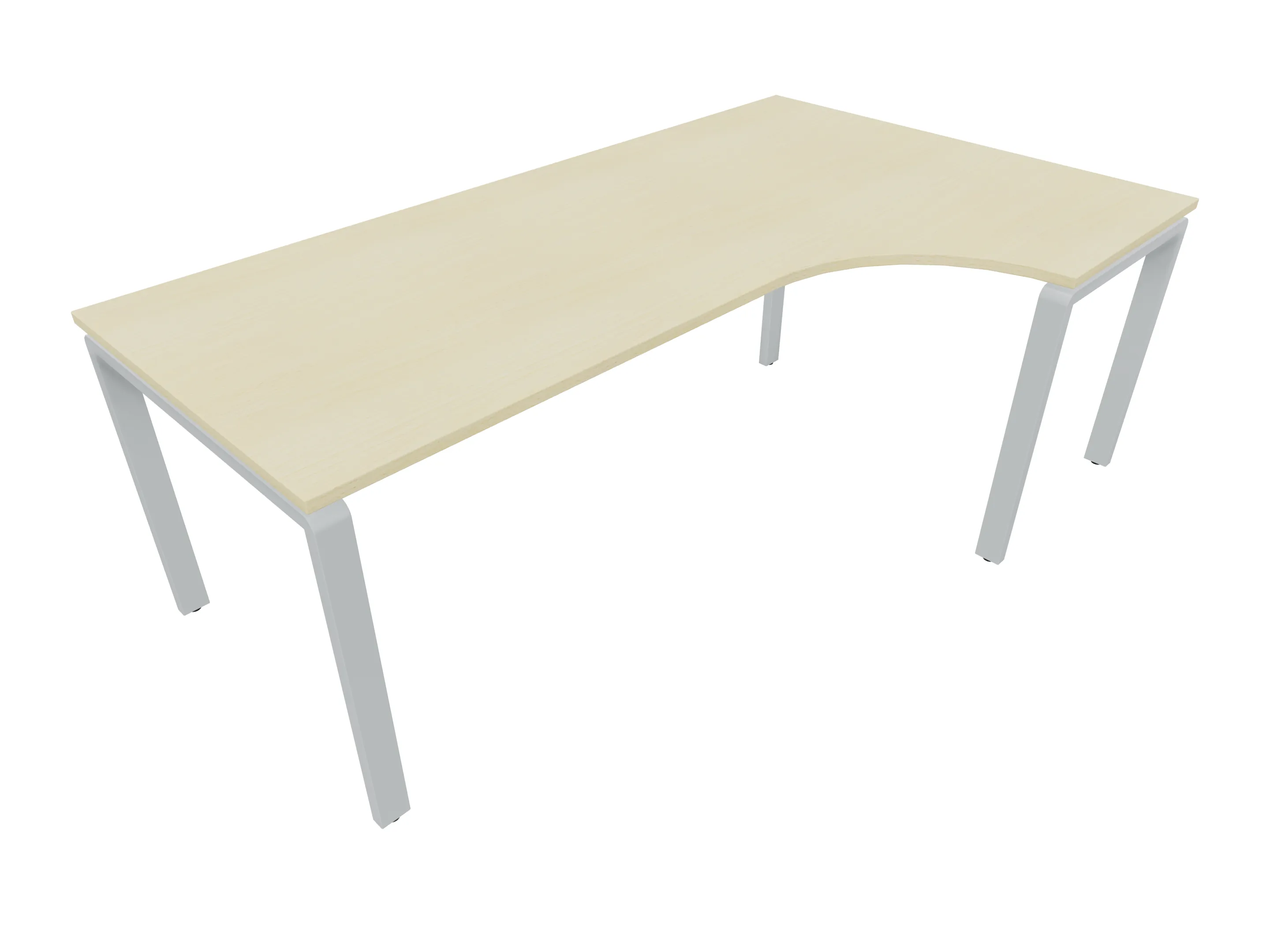 Bureau met 2 poten (vaste hoogte 720mm), waarvan de rechter 1000mm diep, de linker 800mm diep. Bureau heeft een rechte zitzijde, met een ronding in de hoek met een aanbouw zijde van 441mm. Afmeting: 2000 x 1000mm (BxD).