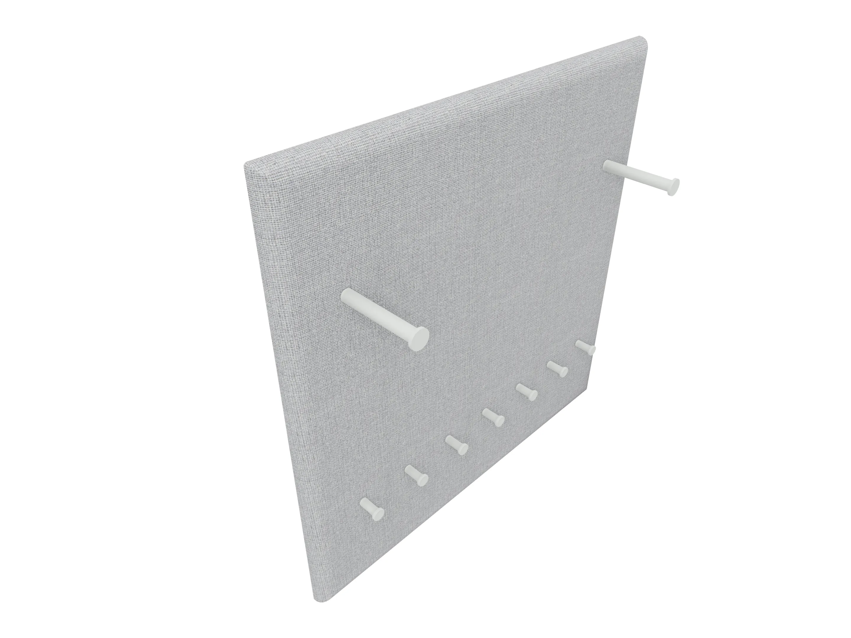 Akoestisch wandpaneel met 7 jashaken en twee kleine garderobestangen, voor ongeveer 2x3 kledinghangers, in "standaard akoestische uitvoering", in de afmeting: 800 x 800mm (BxH).
