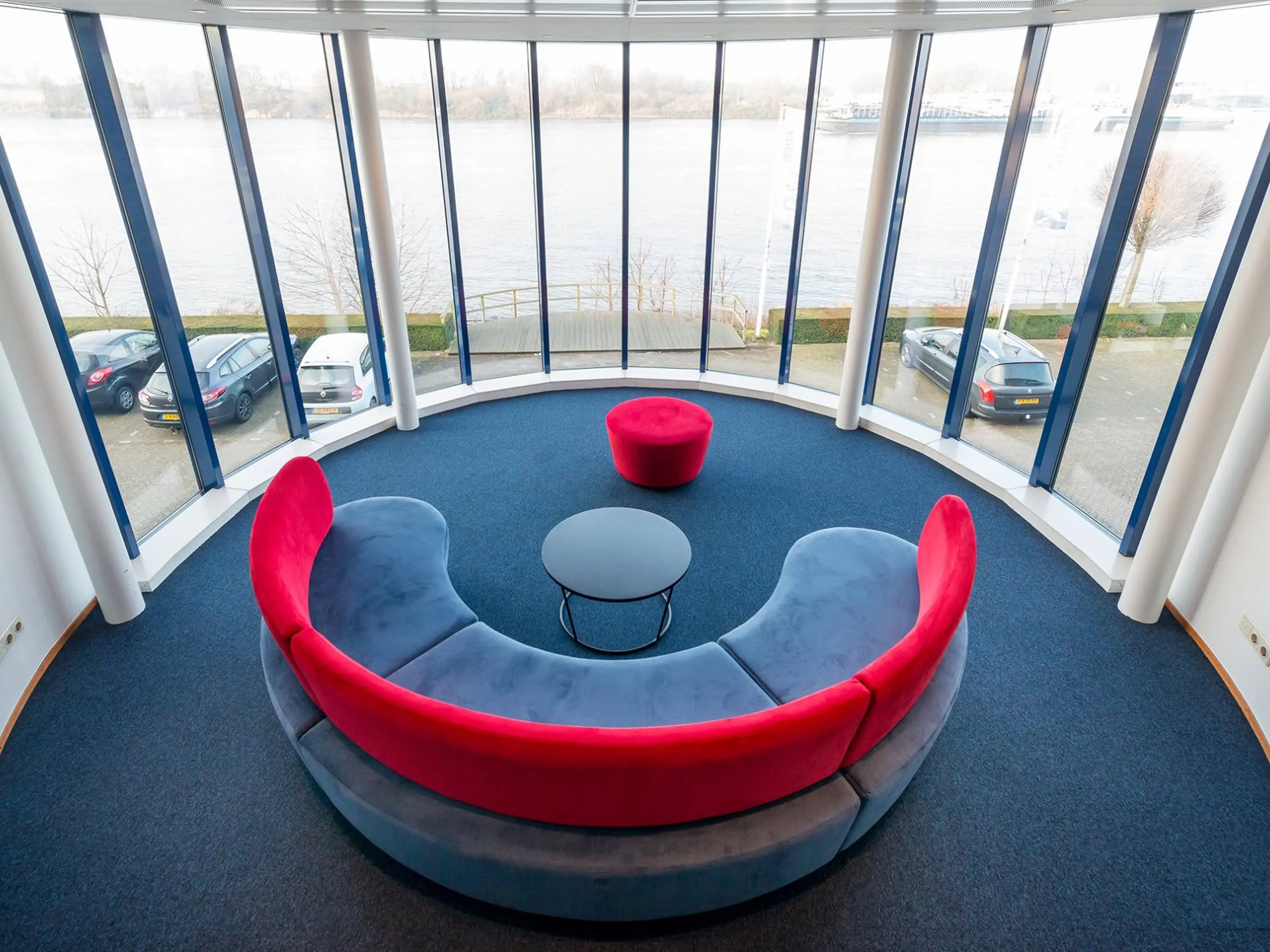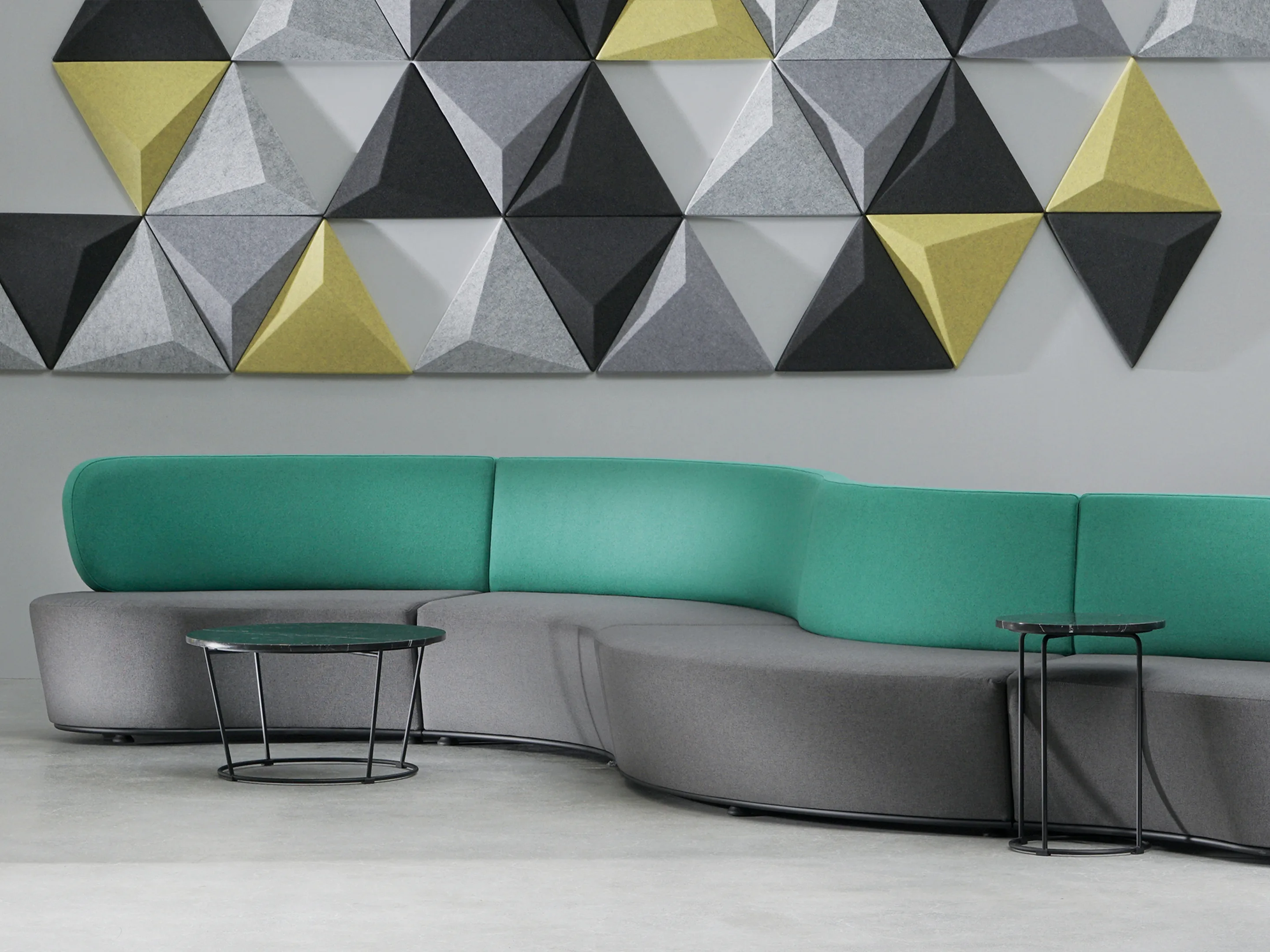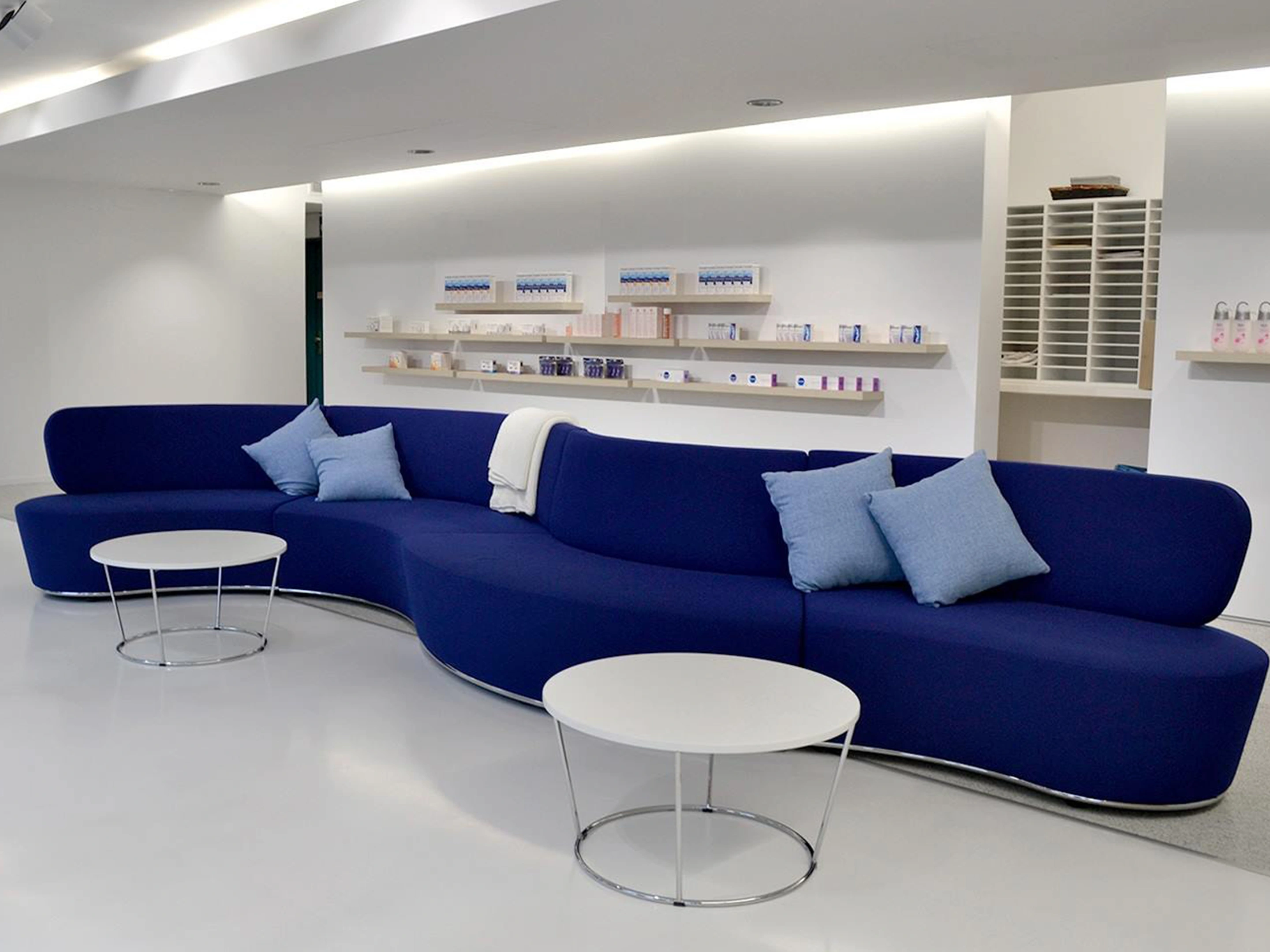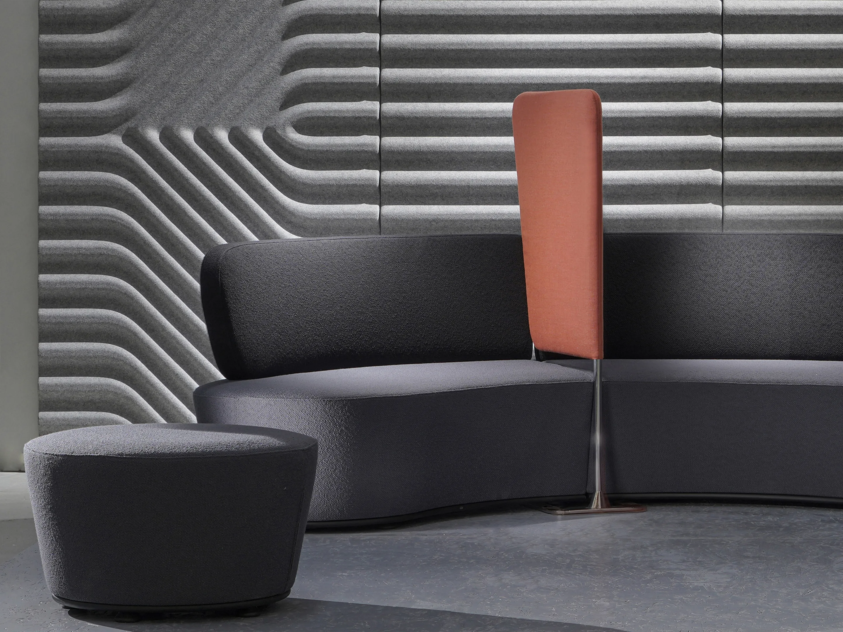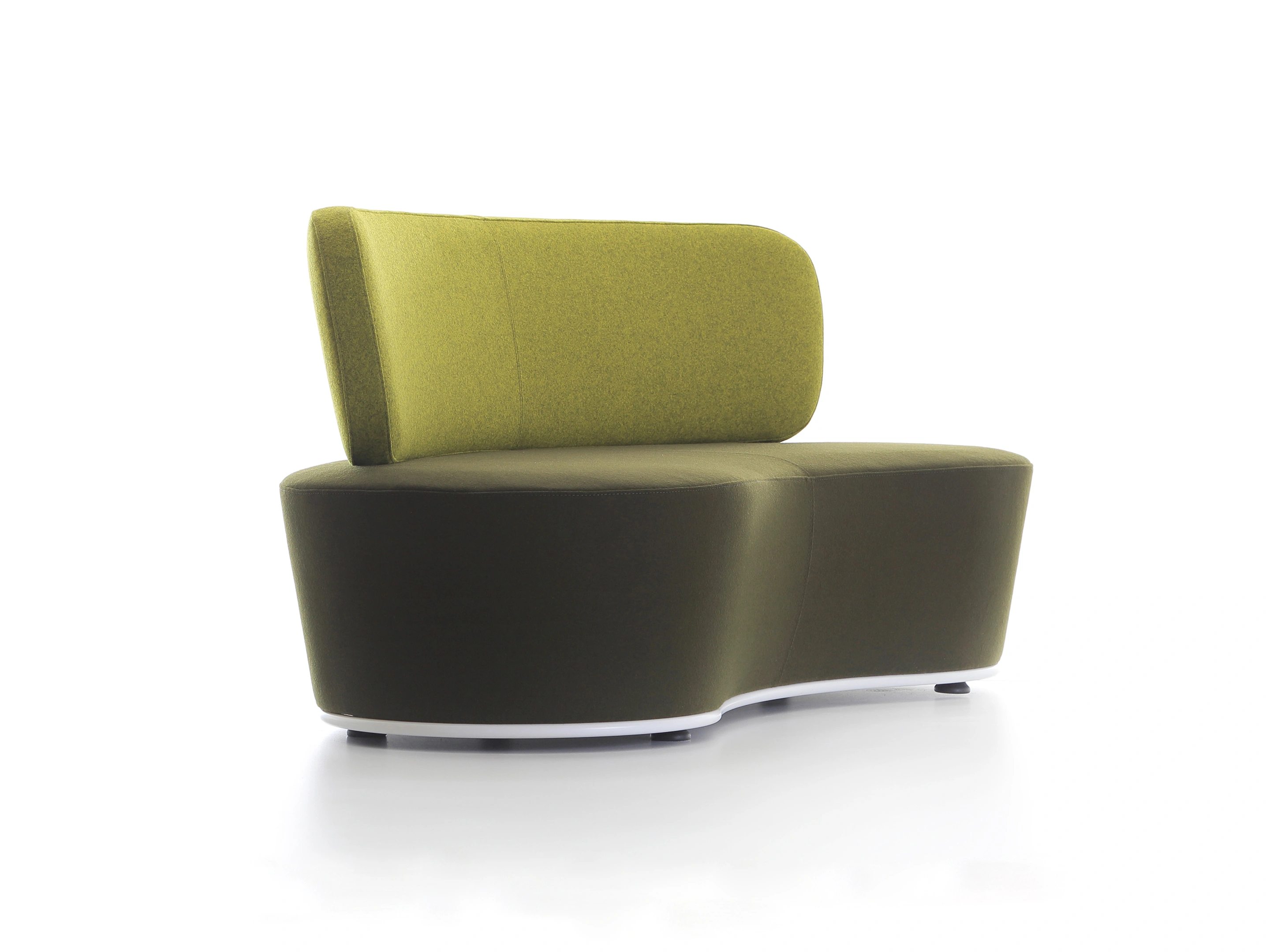Volledig gestoffeerd modulair zitelement, waarvan links koppelbaar is en rechts gesloten (vanuit zittende positie). Vorm: hol
