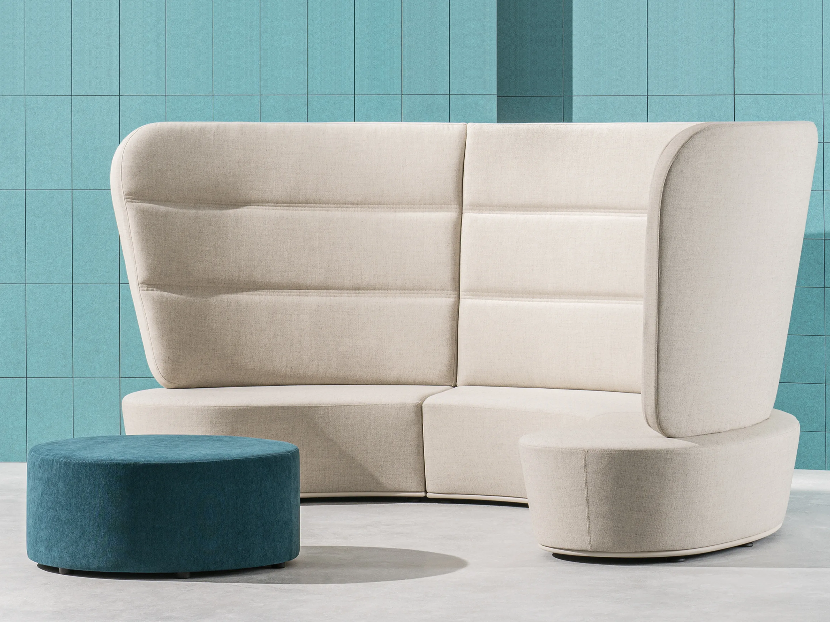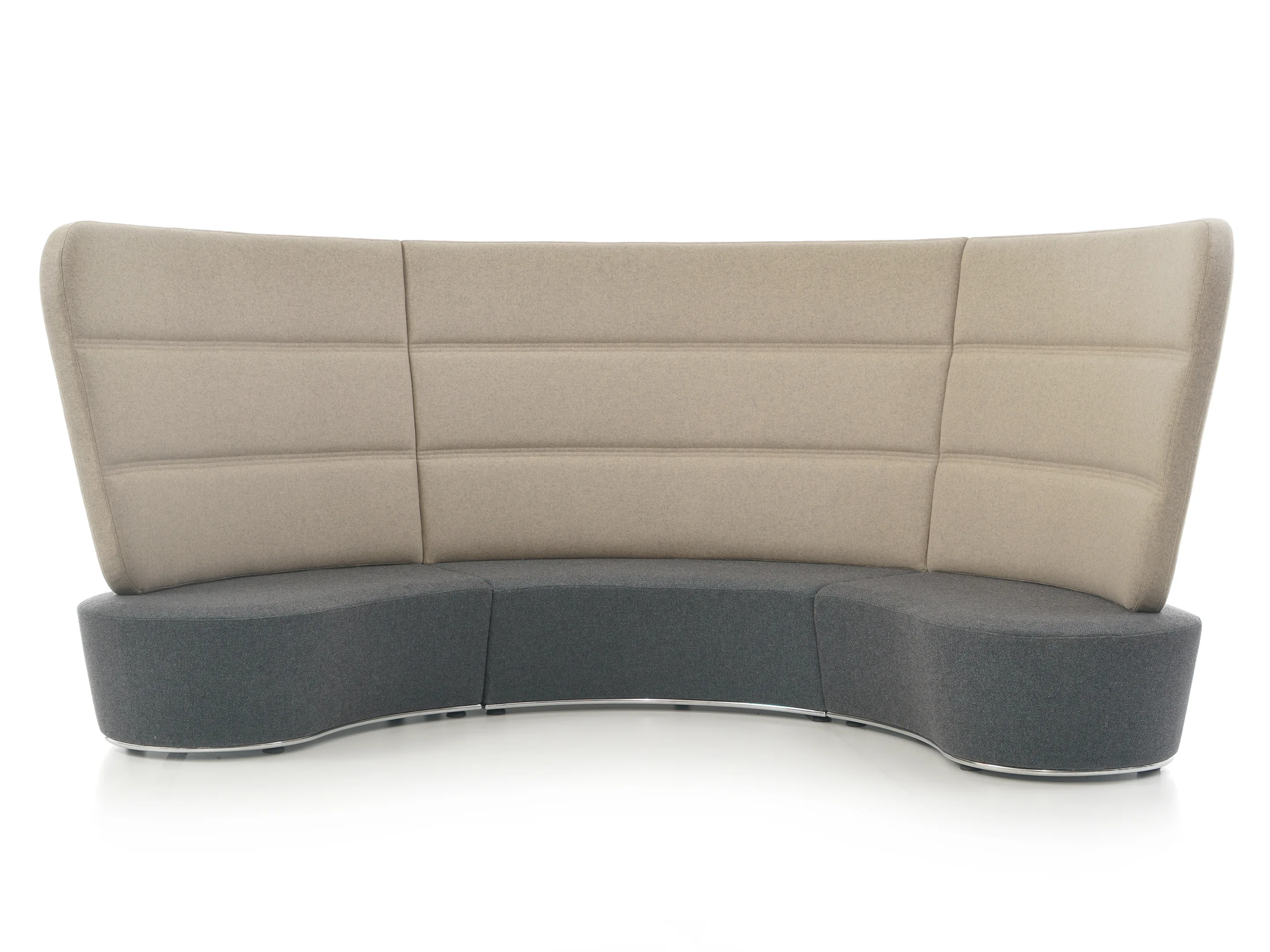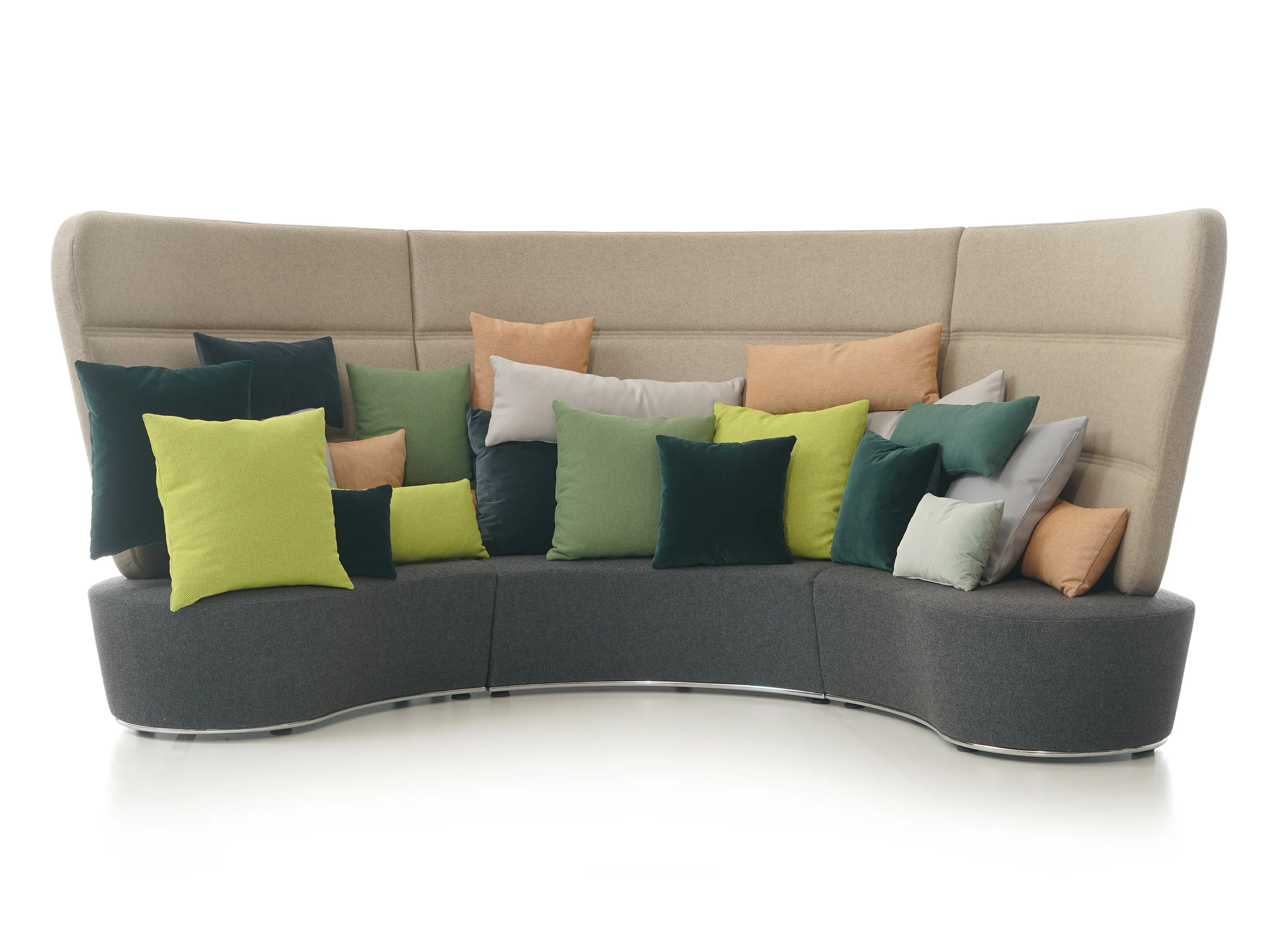 Volledig gestoffeerd modulair zitelement met hoge rug, zowel links als rechts koppelbaar. Vorm: hol