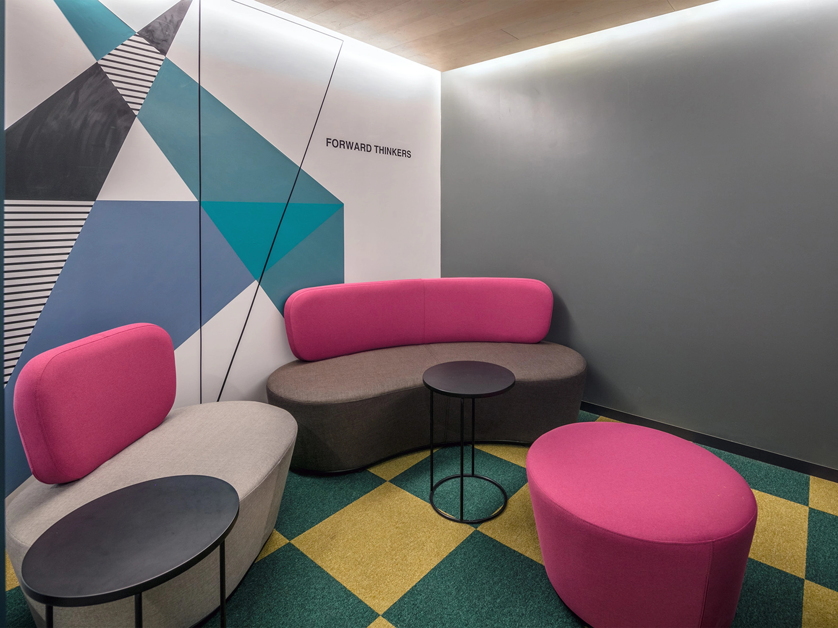 Volledig gestoffeerd modulair zitelement met hoge rug waarvan rechts koppelbaar is en links gesloten (vanuit zittende positie). Vorm recht