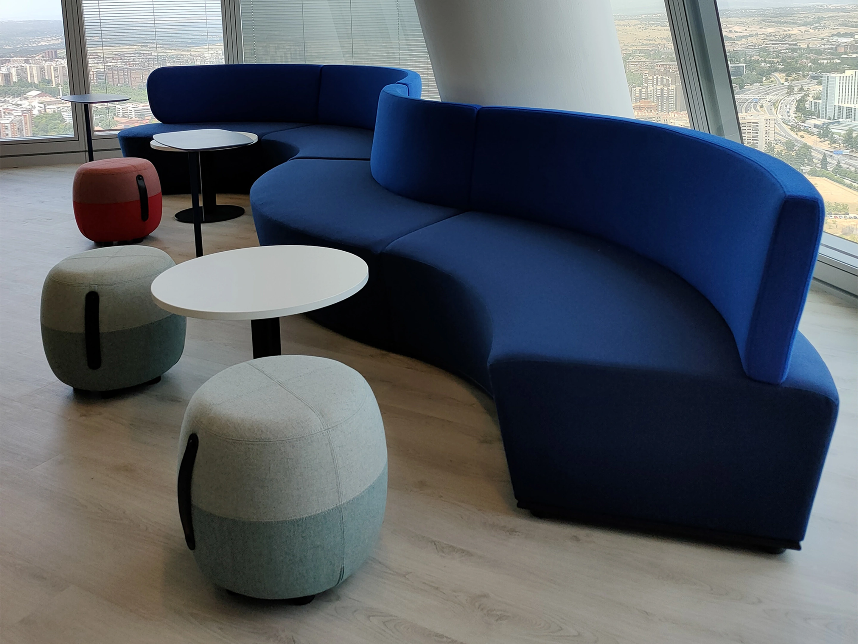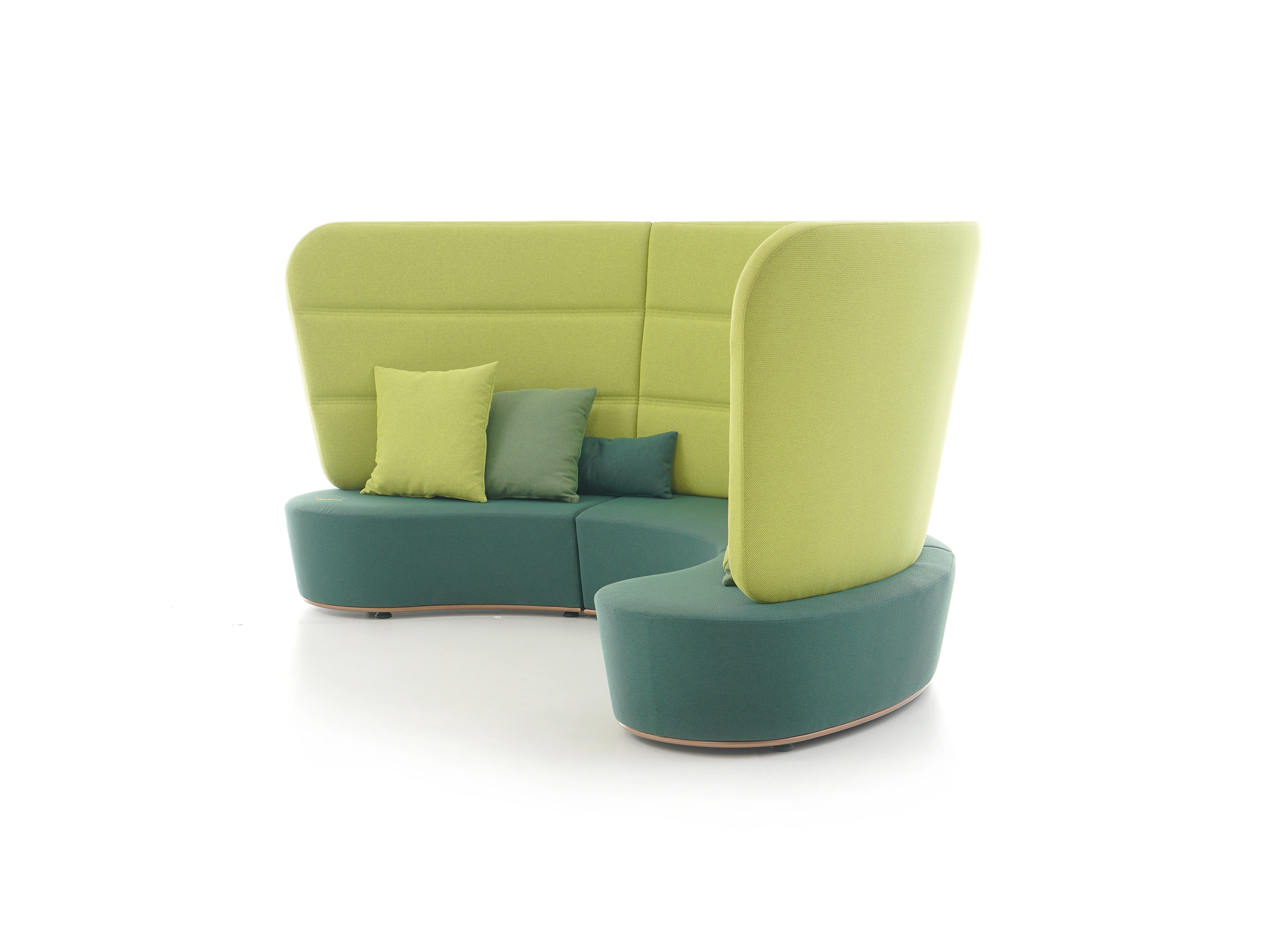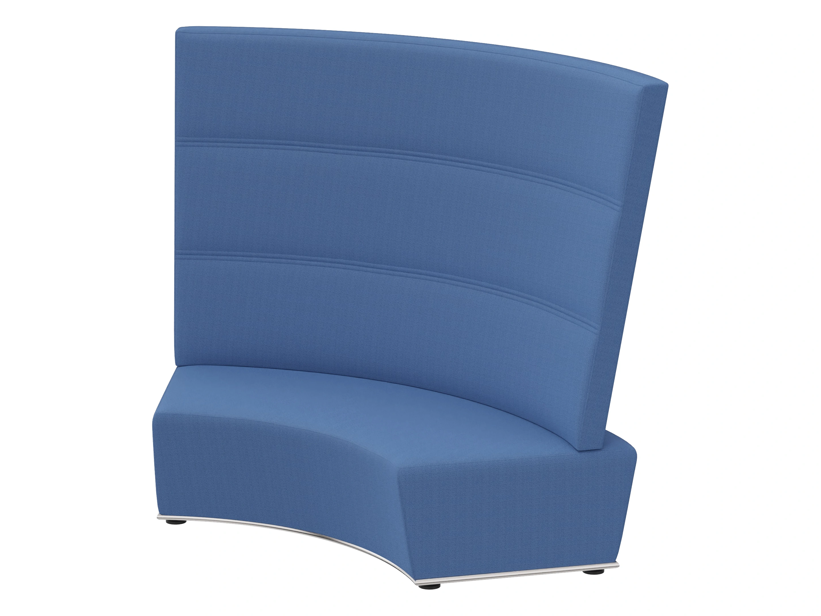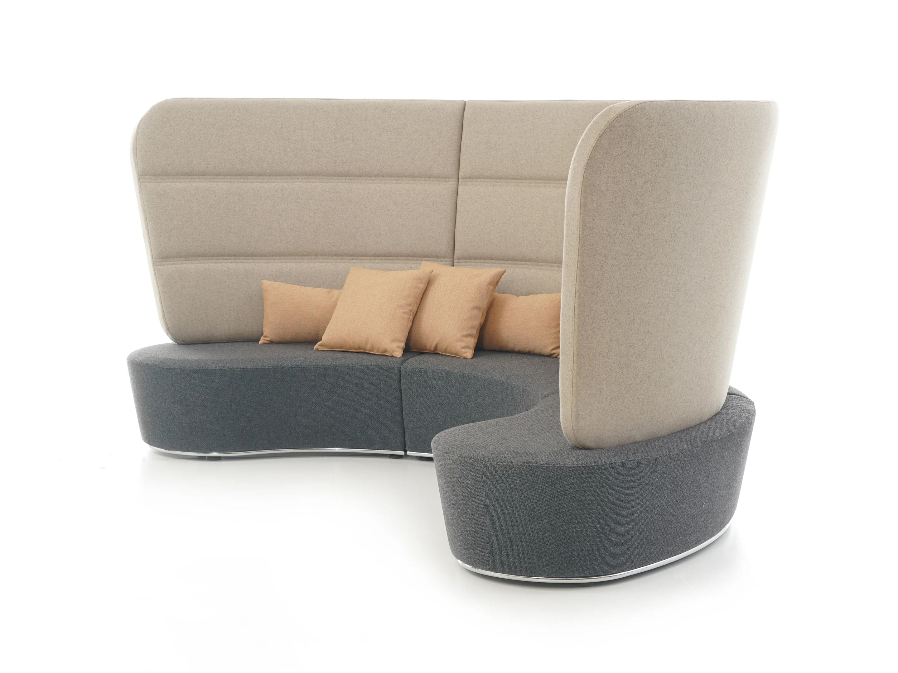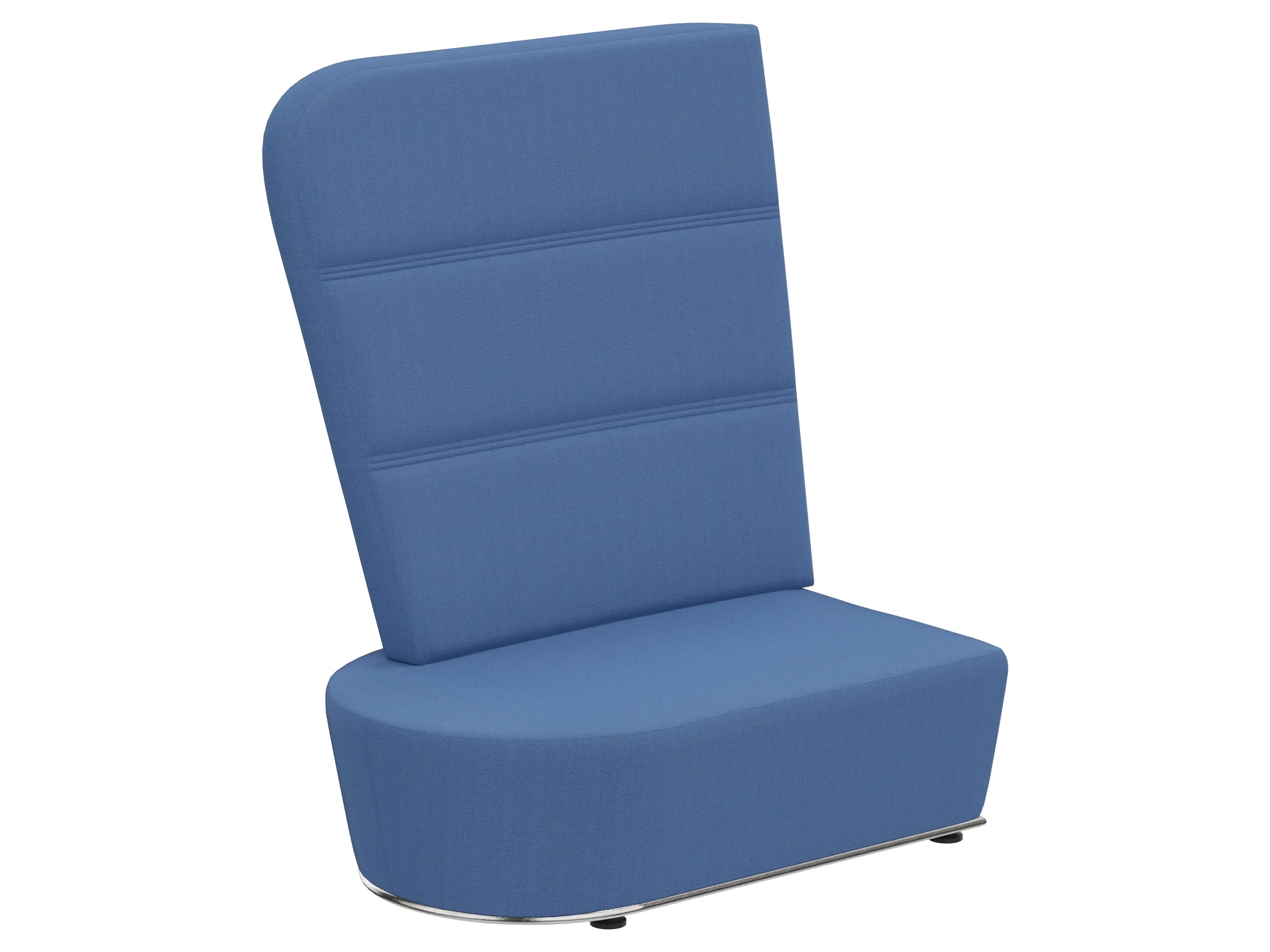 Volledig gestoffeerd modulair zitelement met hoge rug, waarvan rechts koppelbaar (vanaf zittende positie) is en links gesloten. Vorm: hol