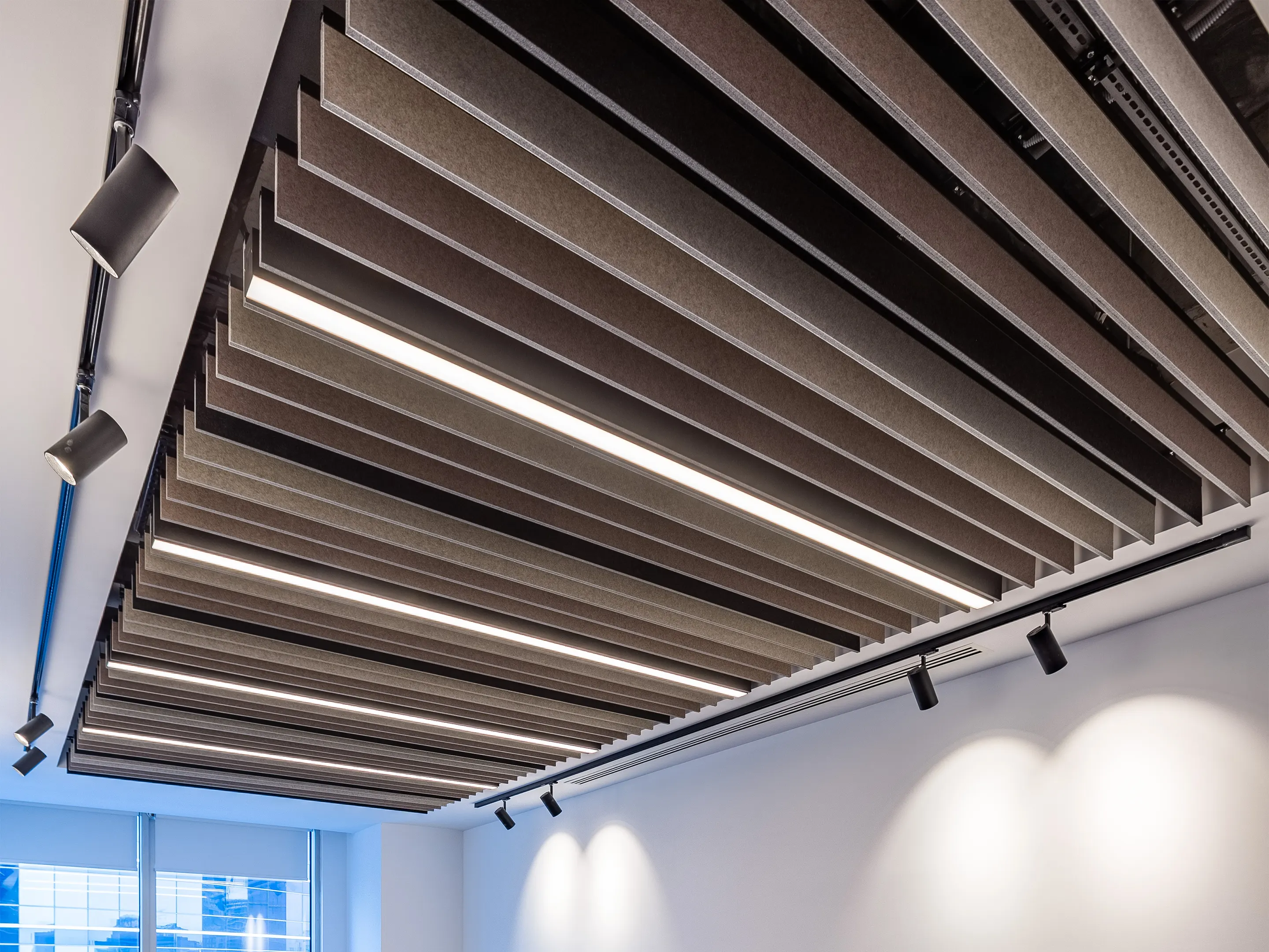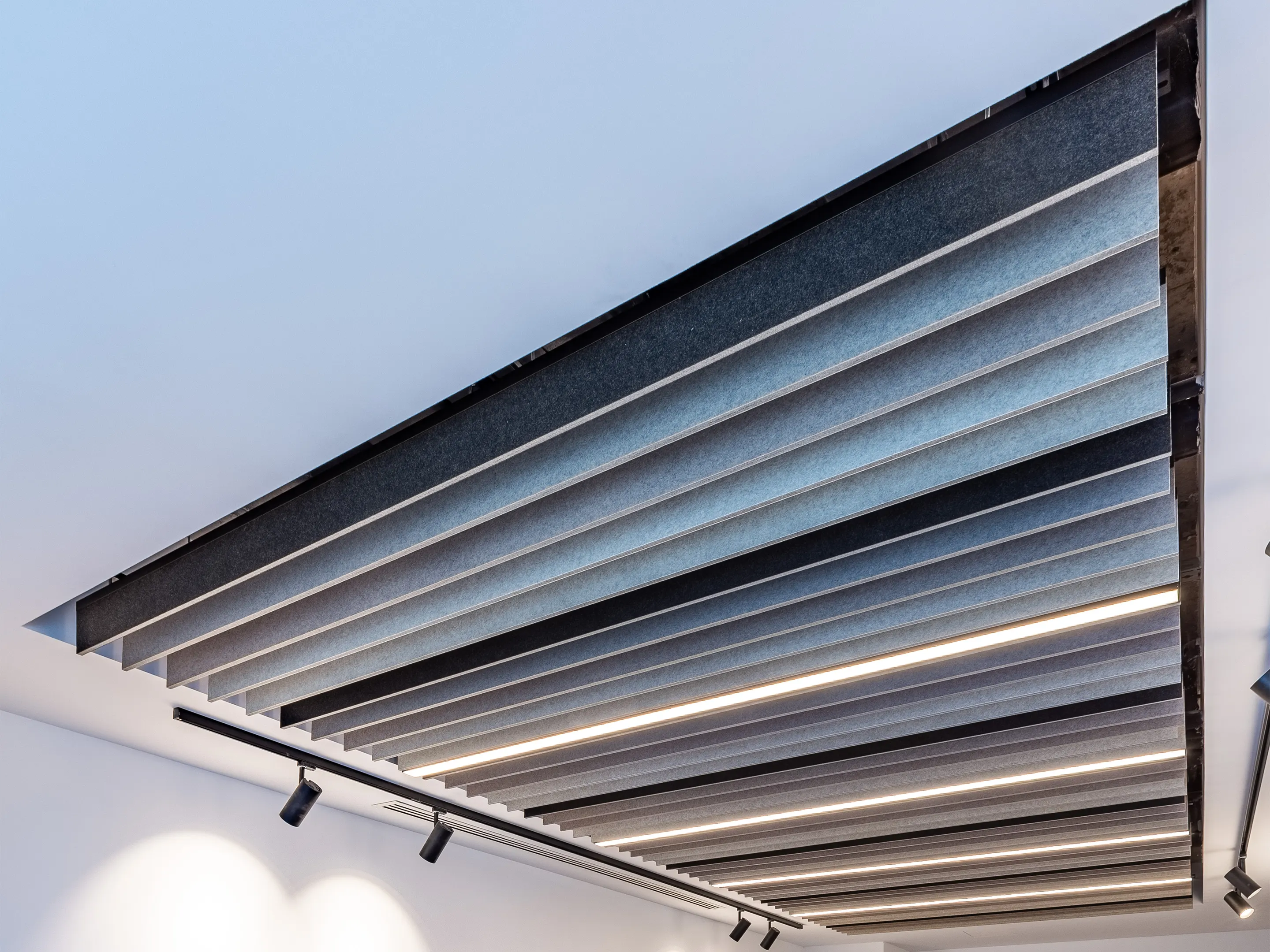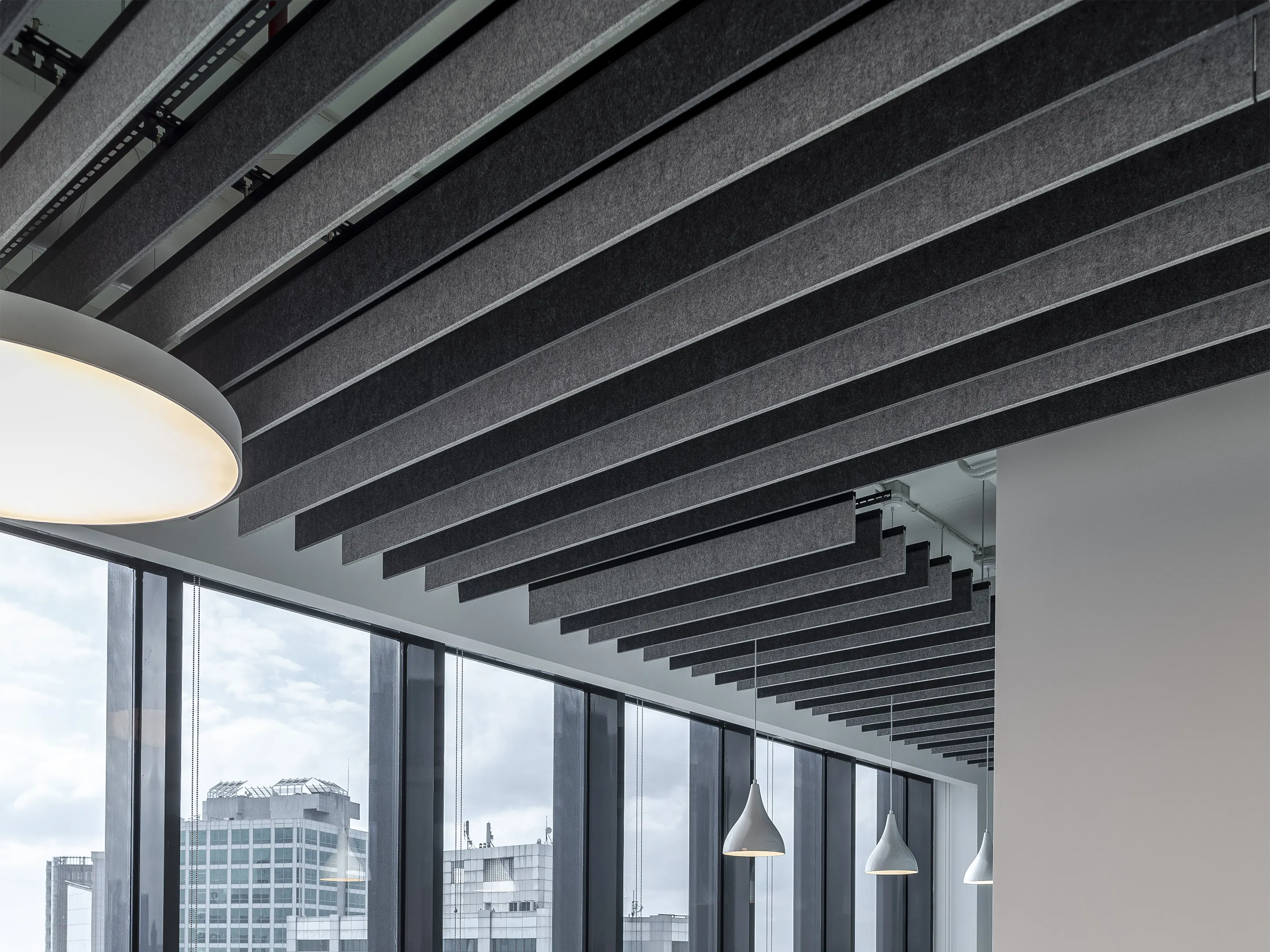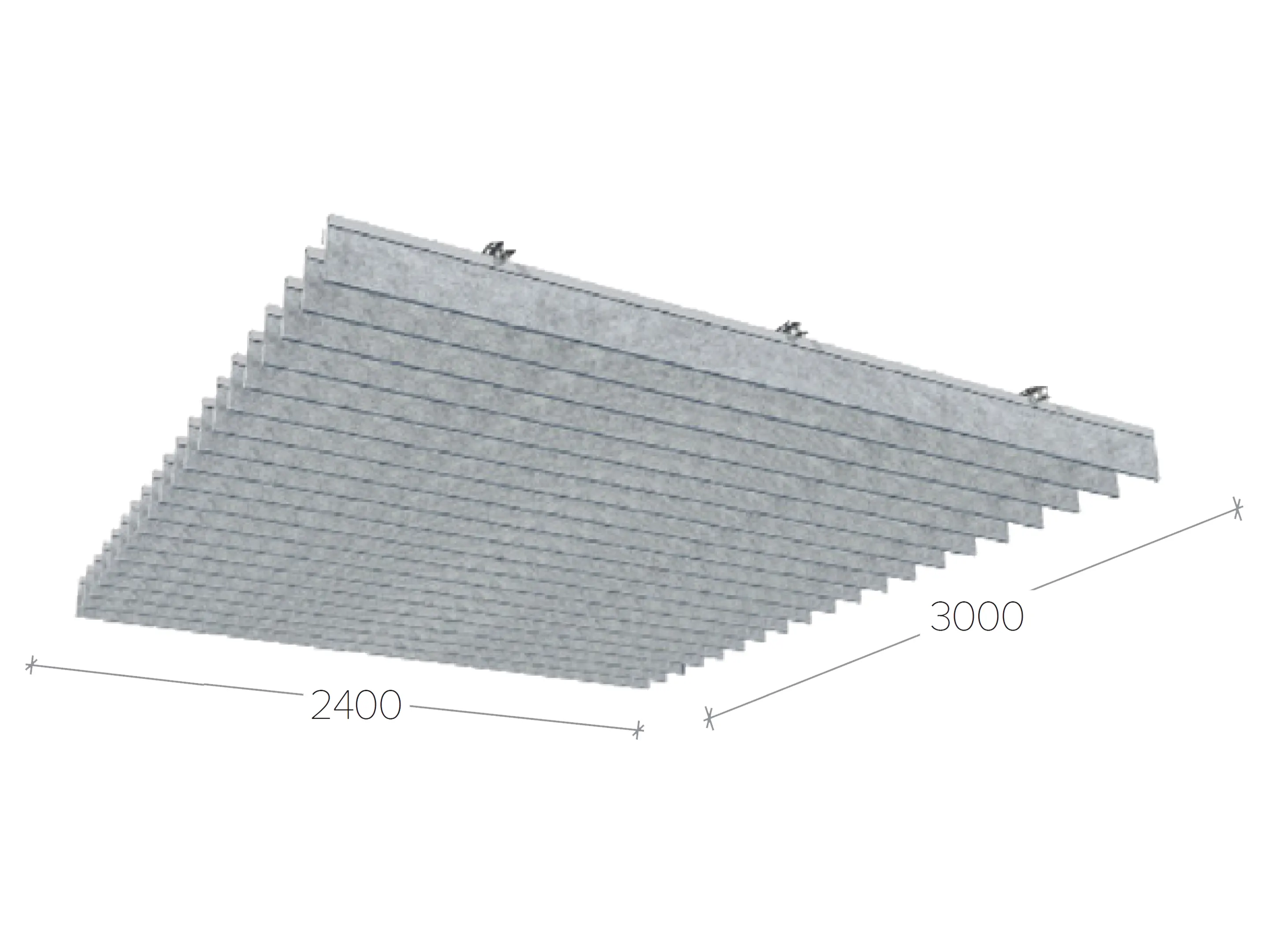 Een akoestisch open baffle systeem bestaande uit een frame met rechte baffles voor montage aan het plafond en een Sabins Waarde van 2,08 (m2). Incl. frame, ophangset en installatiehandleiding.
