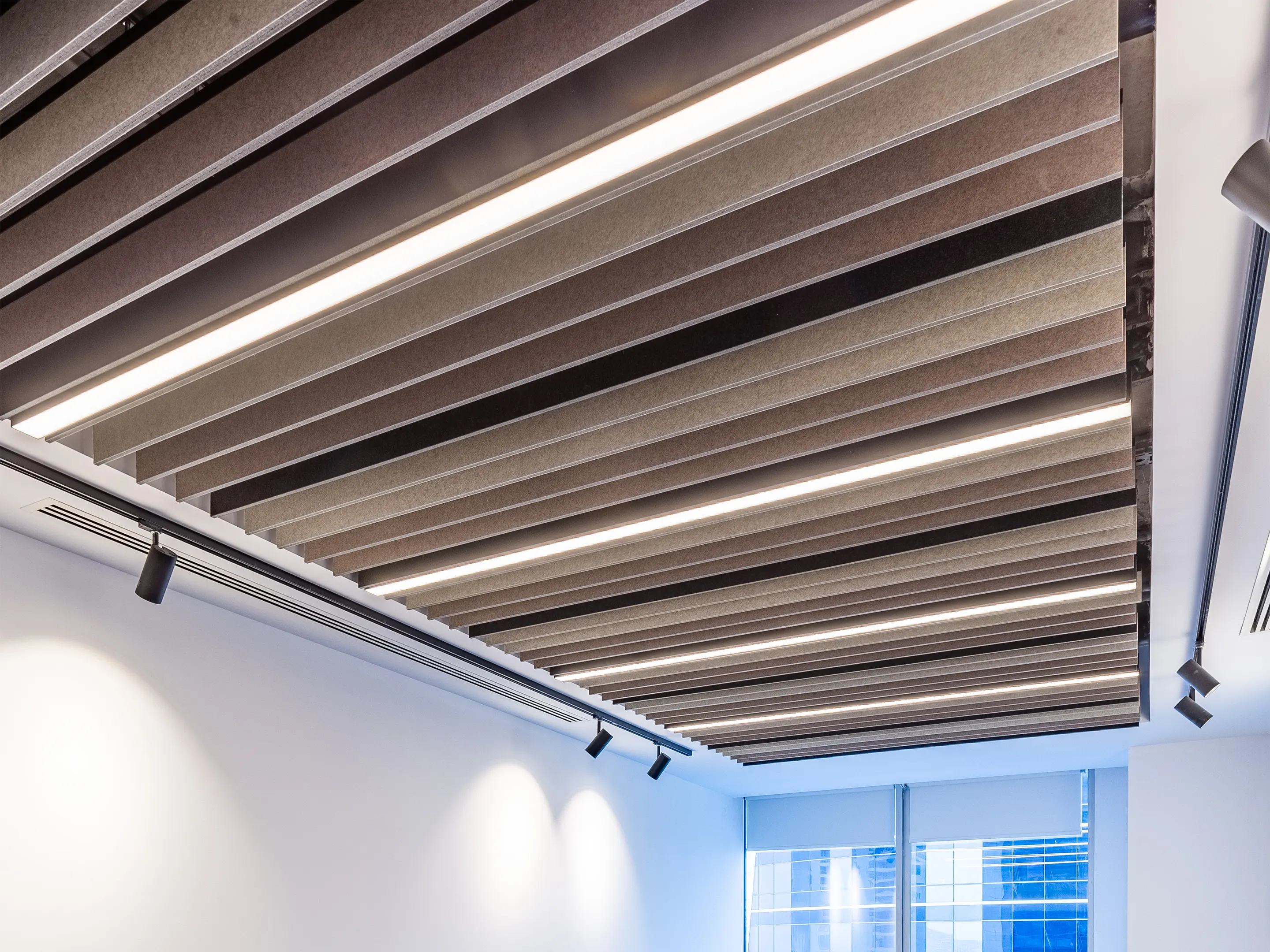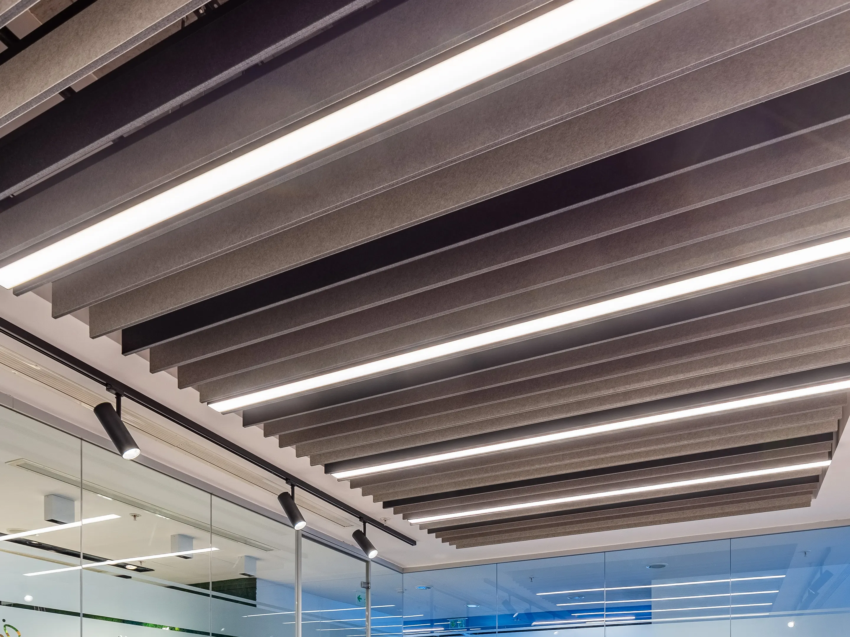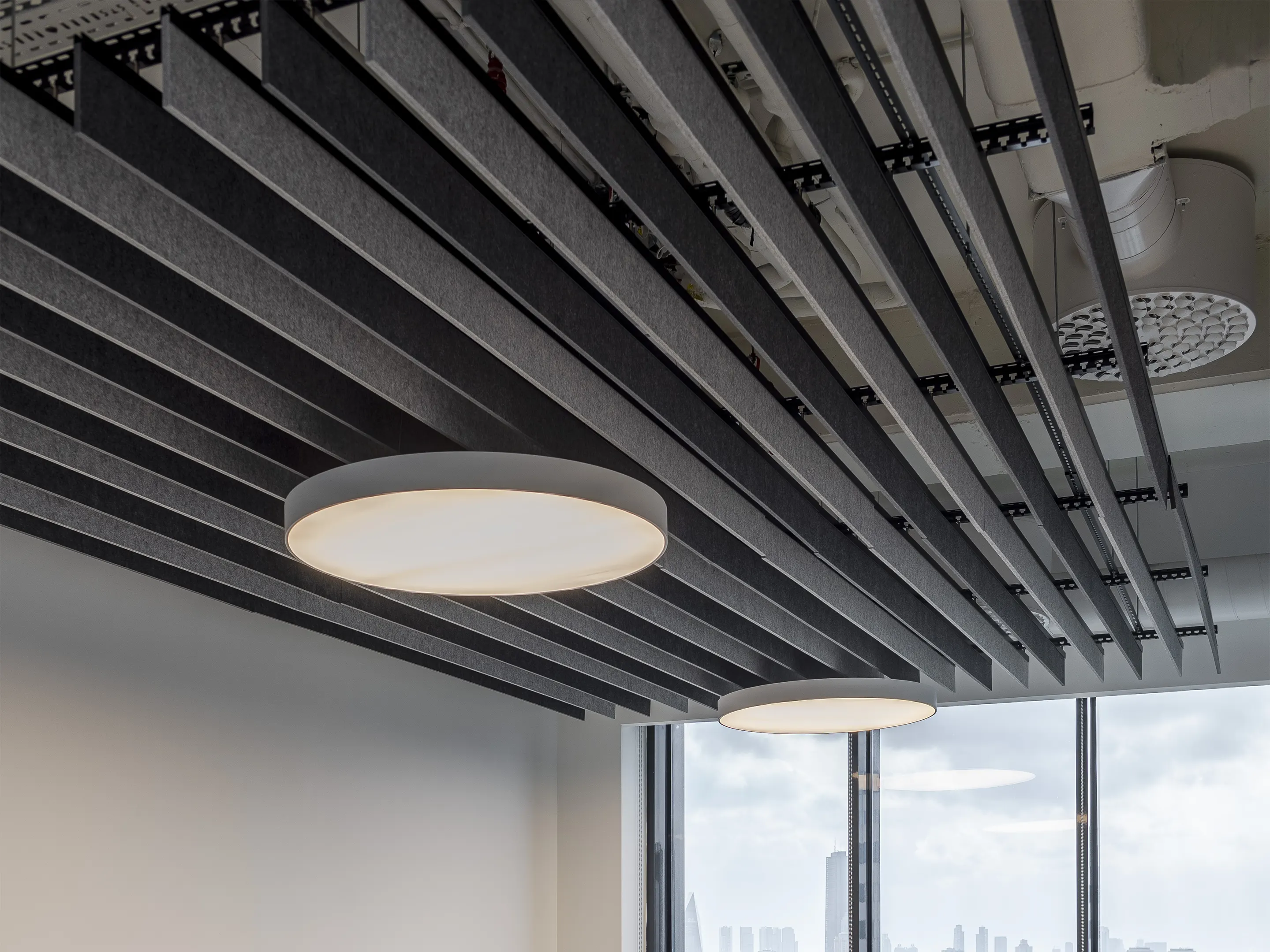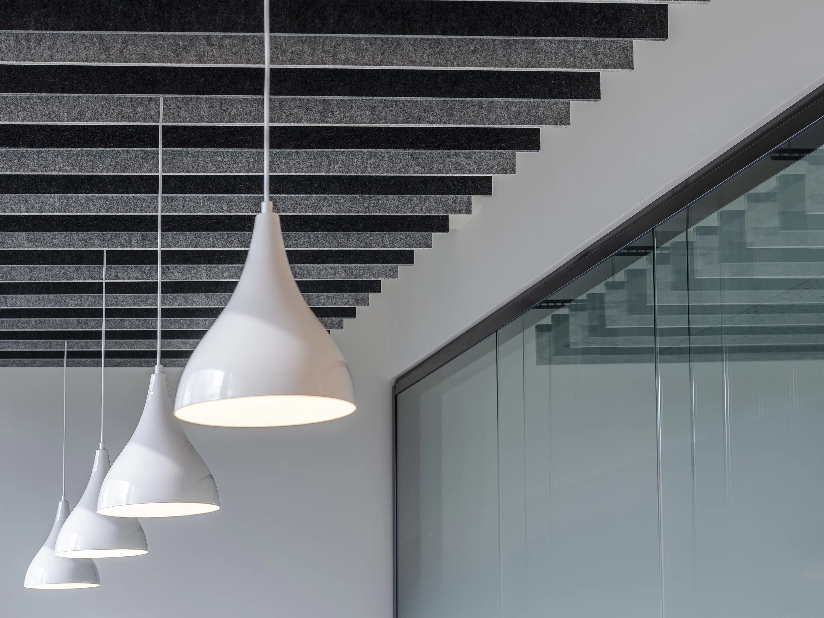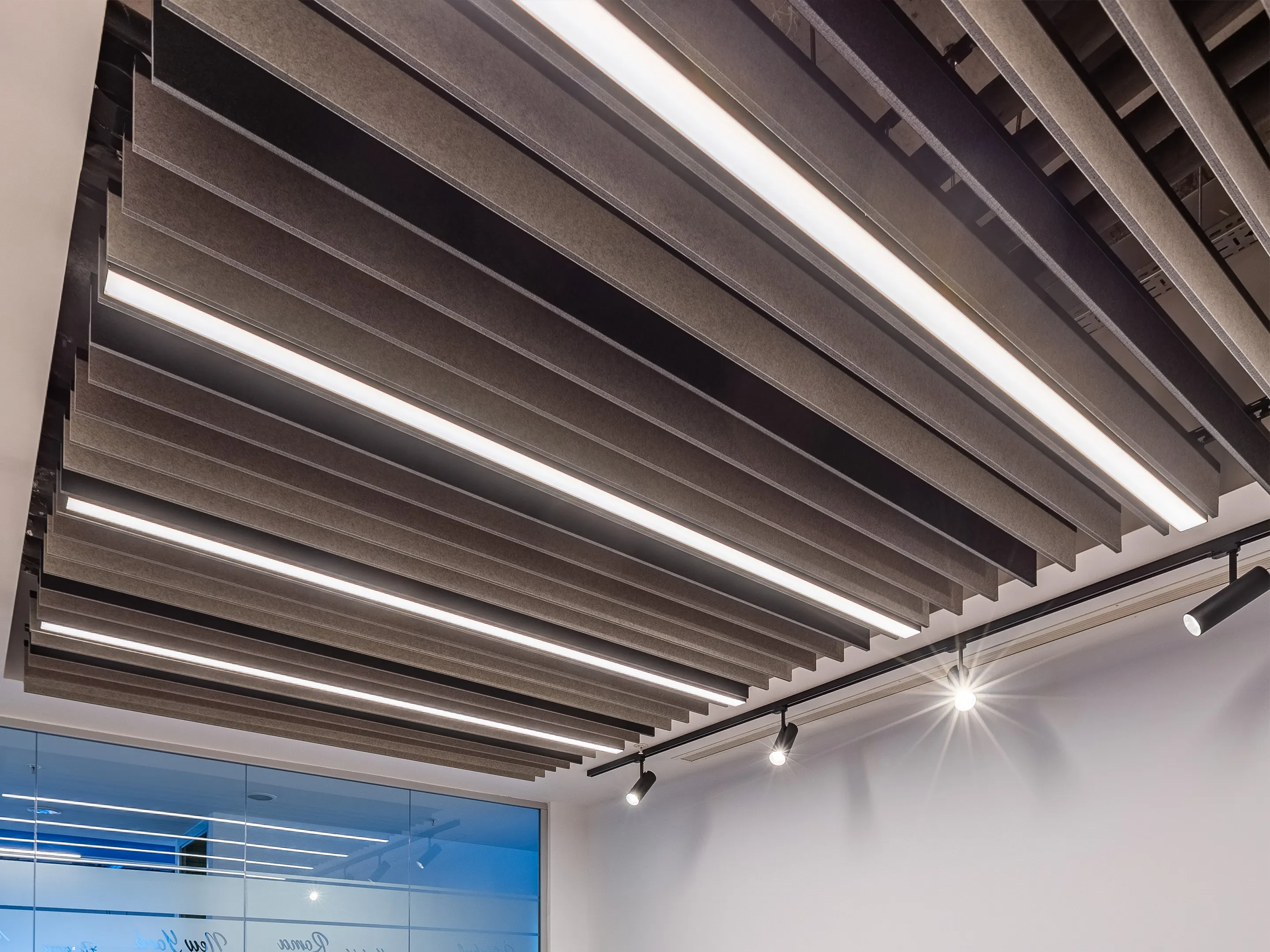 Een akoestisch open baffle systeem bestaande uit een frame met rechte baffles voor montage aan het plafond en een Sabins Waarde van 2,08 (m2). Incl. frame, ophangset en installatiehandleiding.