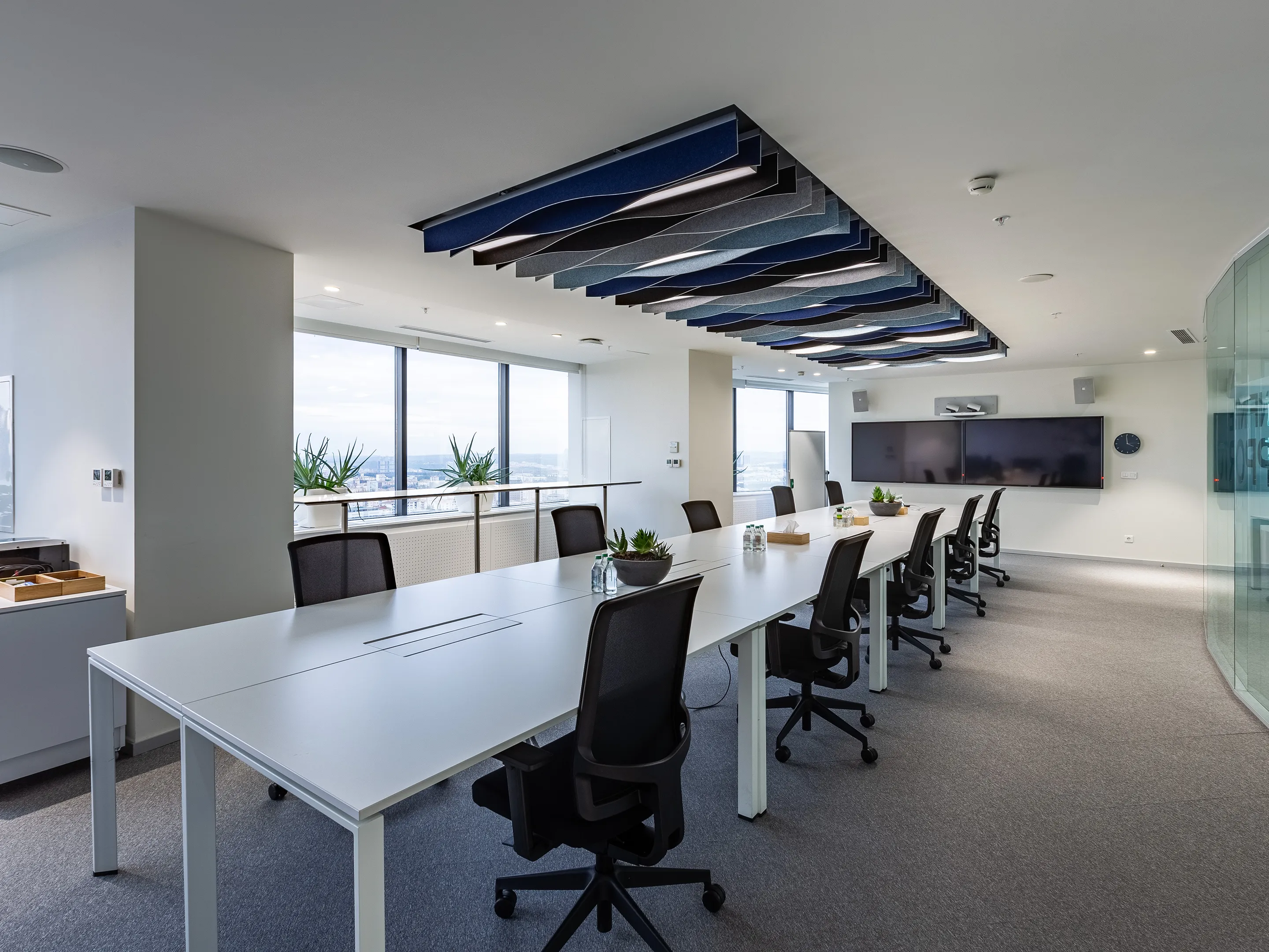 Een akoestisch open baffle systeem bestaande uit een frame met baffles in een wave patroon voor montage aan het plafond en een Sabins Waarde van 2,08 (m2). Incl. frame, ophangset en installatiehandleiding.