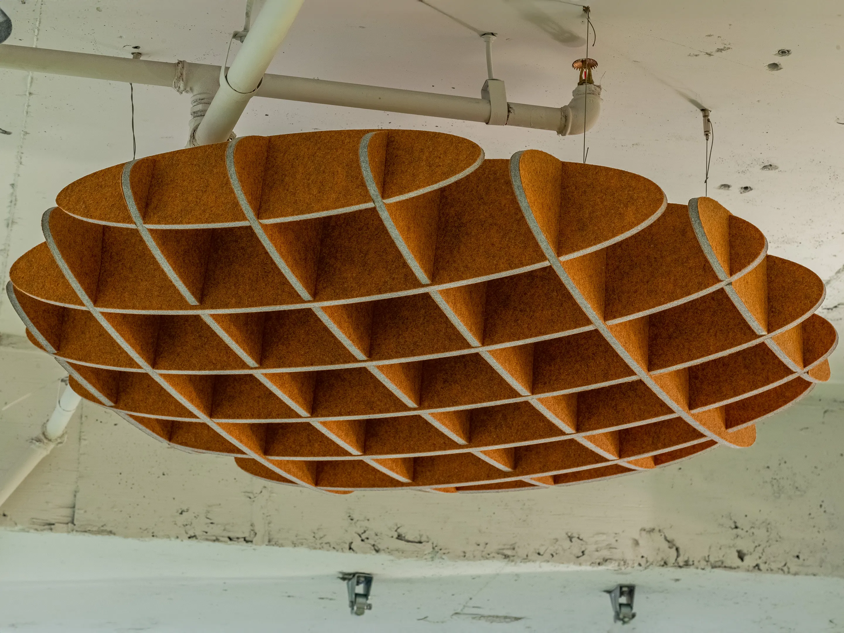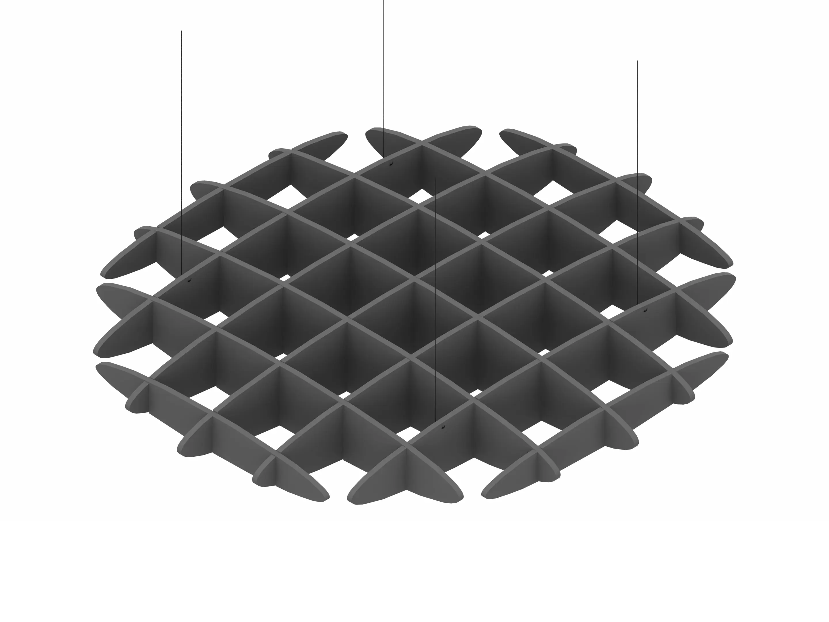 Akoestisch plafondpaneel hangend aan het plafond en een Sabins Waarde van 2,38 (m2).Incl. verstelbare staalkabels van 150cm, ophangset en installatiehandleiding