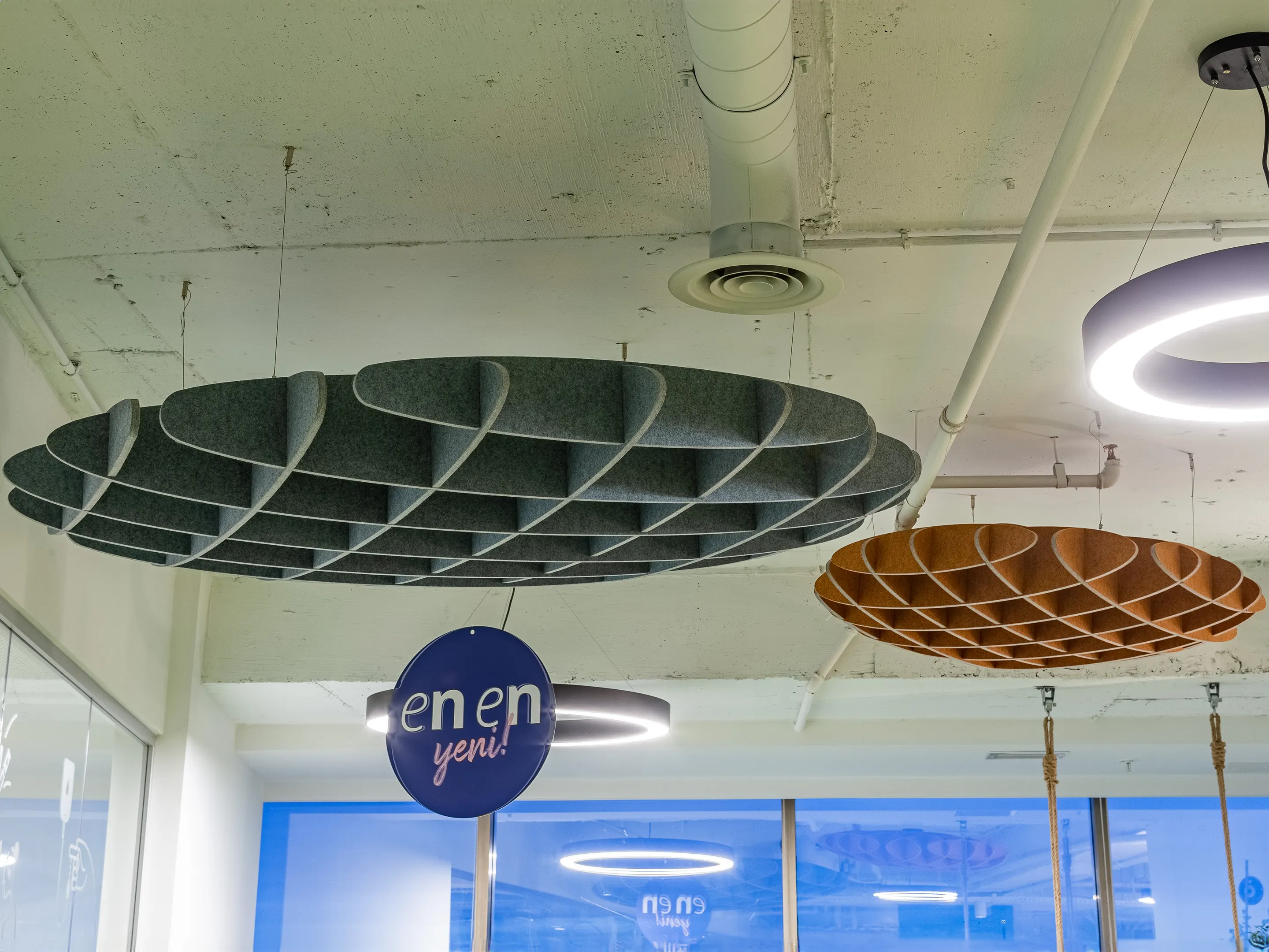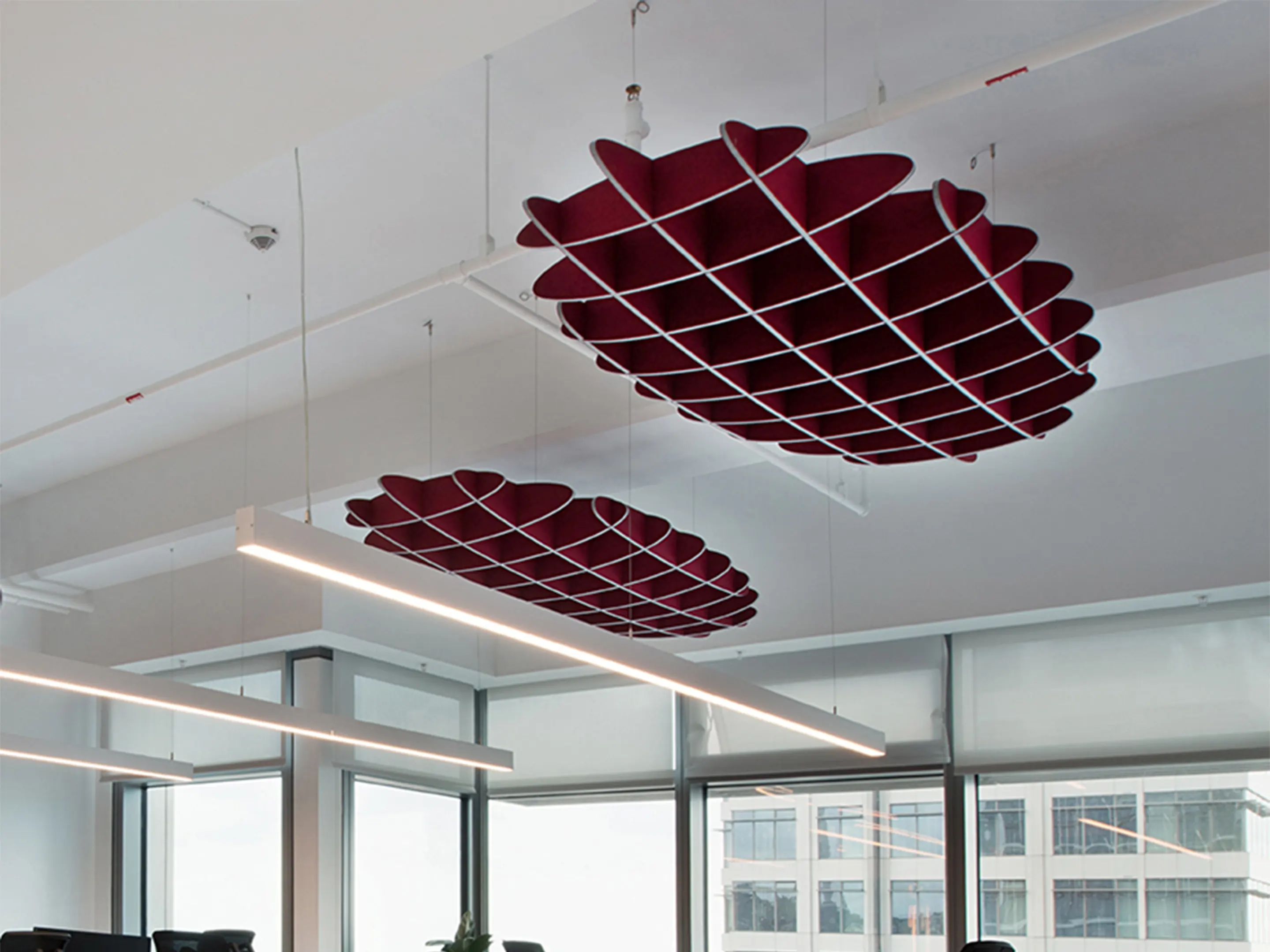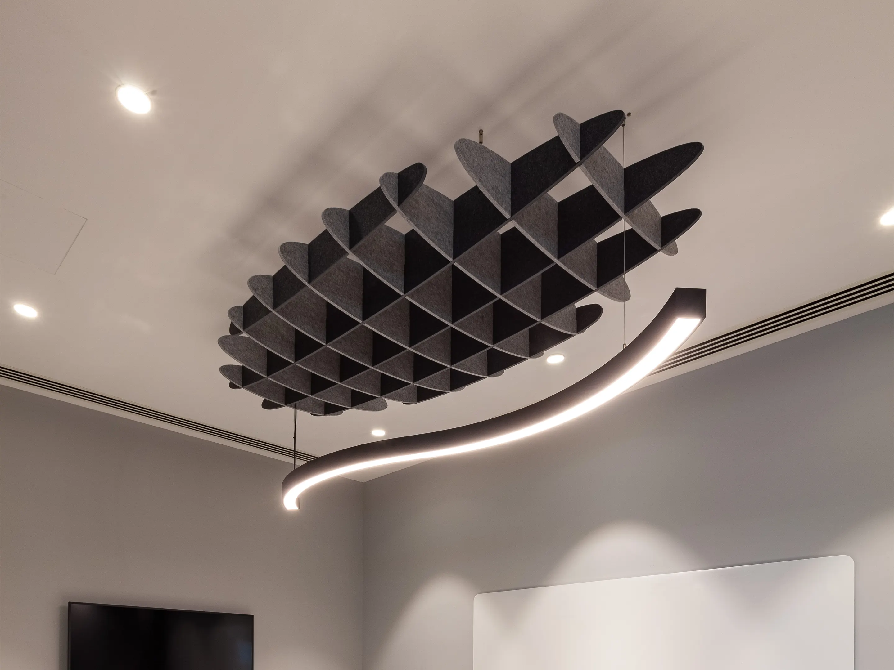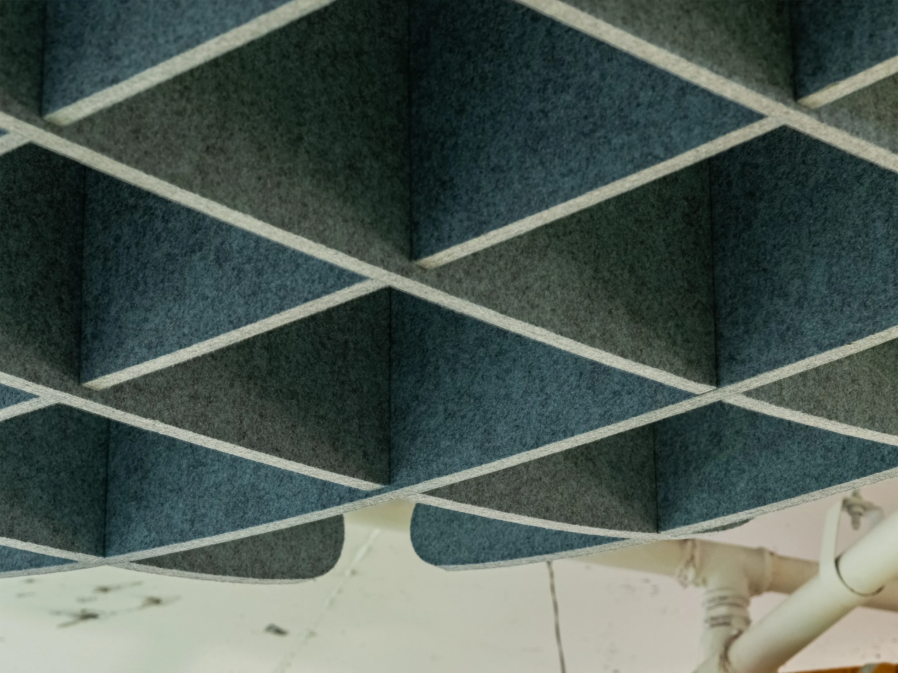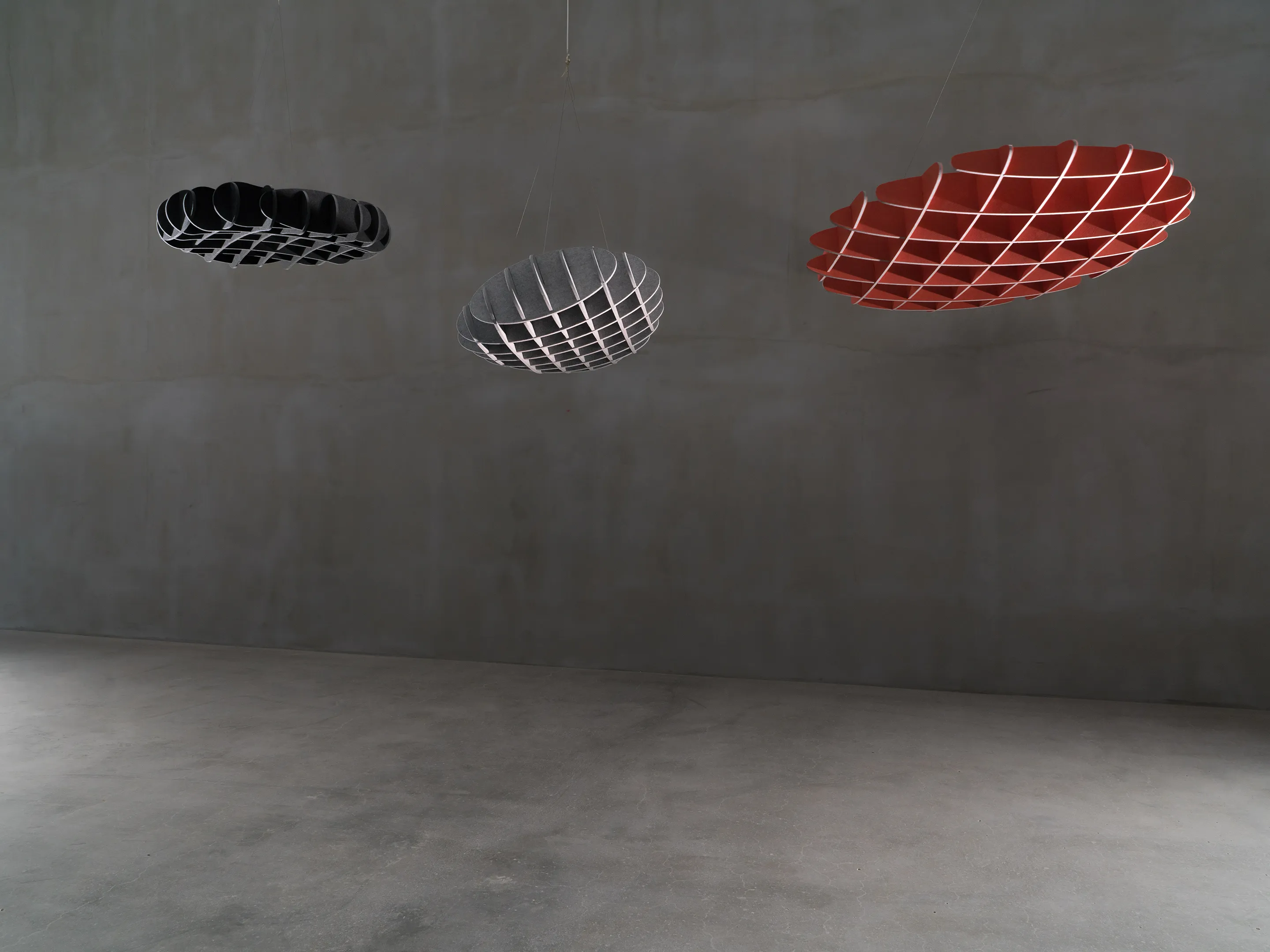 Akoestisch plafondpaneel hangend aan het plafond en een Sabins Waarde van 2,38 (m2).Incl. verstelbare staalkabels van 150cm, ophangset en installatiehandleiding