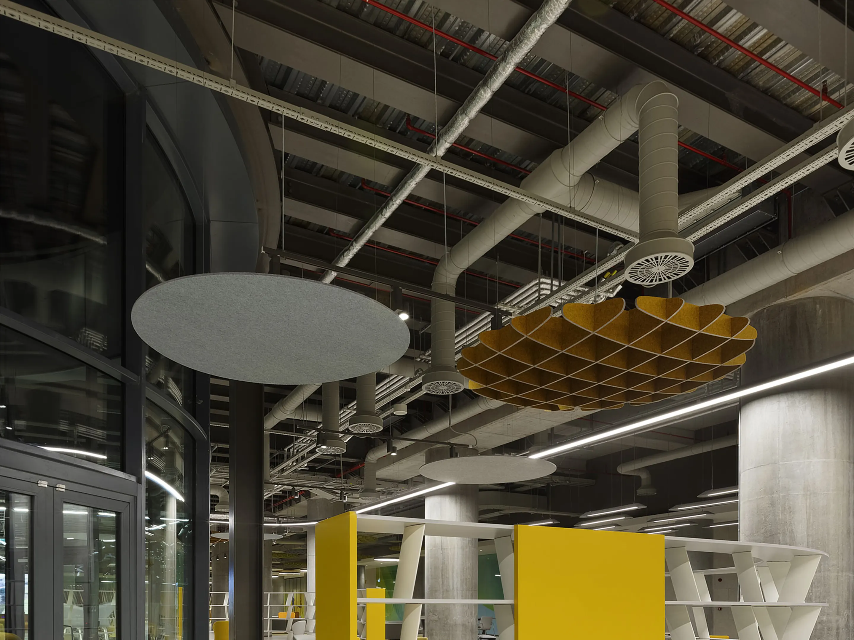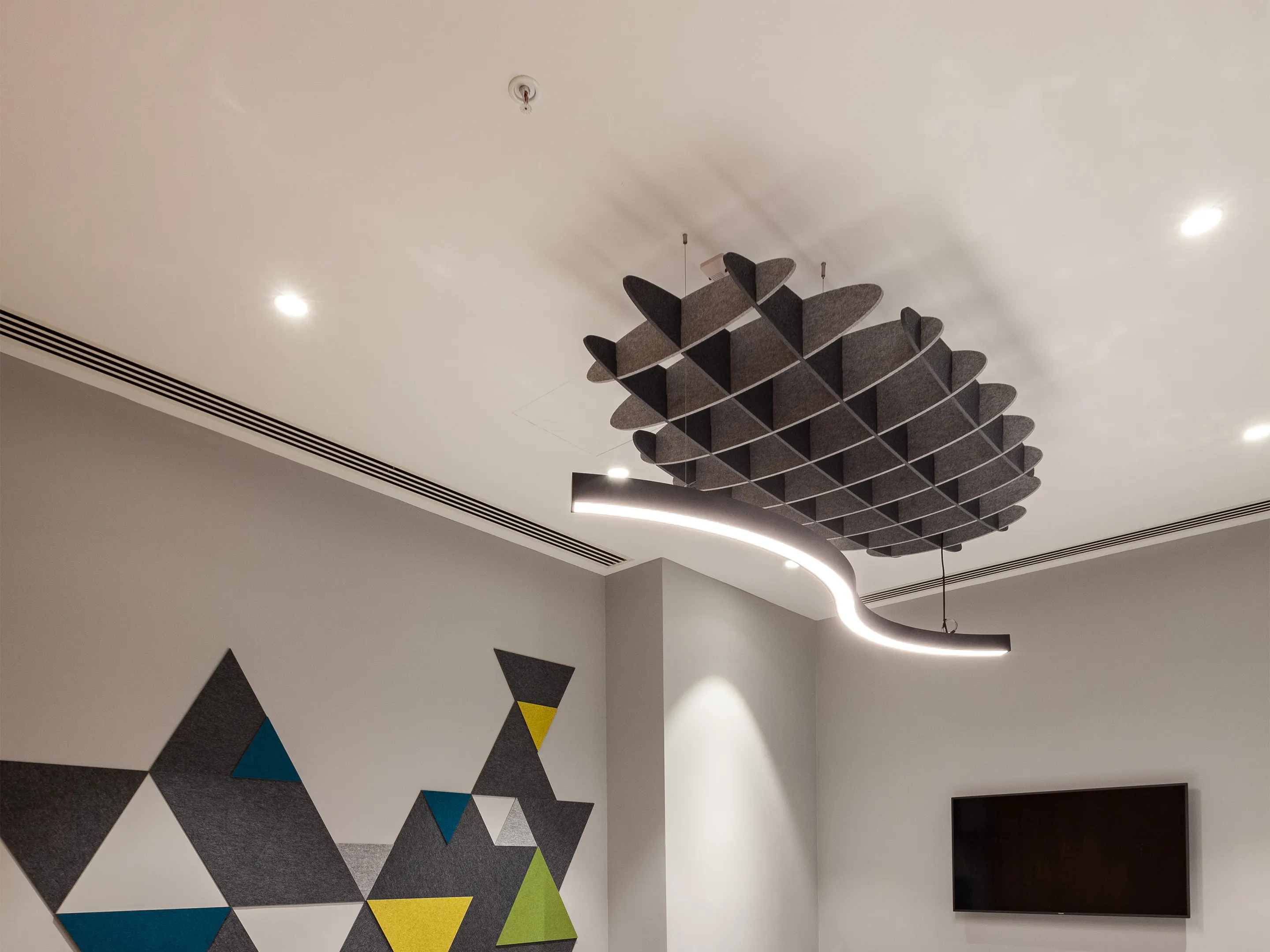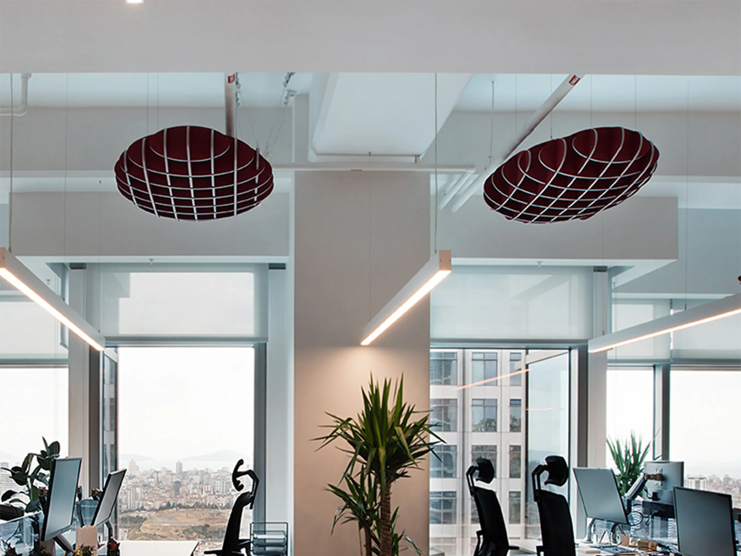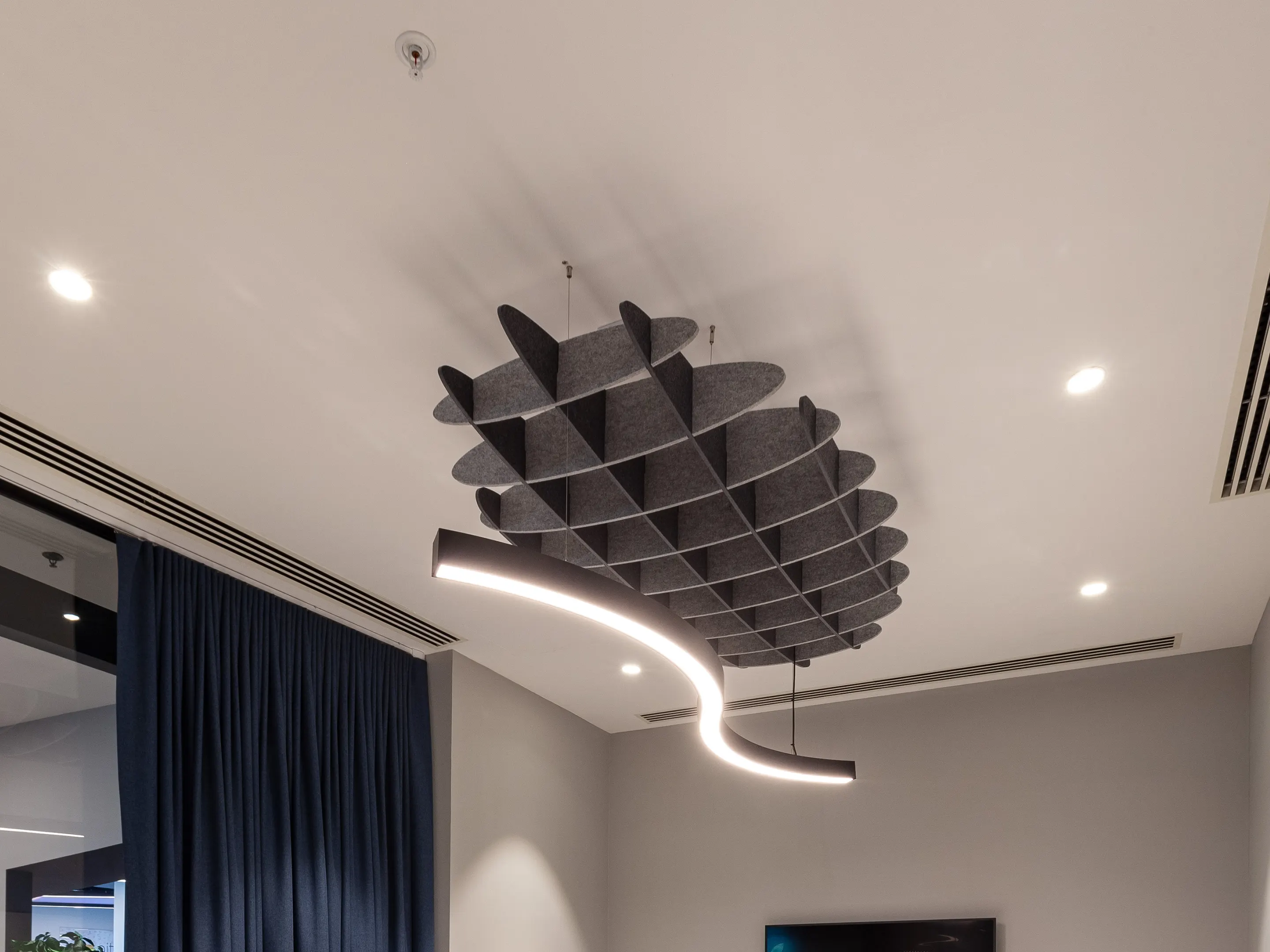 Akoestisch plafondpaneel hangend aan het plafond en een Sabins Waarde van 2,38 (m2).Incl. verstelbare staalkabels van 150cm, ophangset en installatiehandleiding