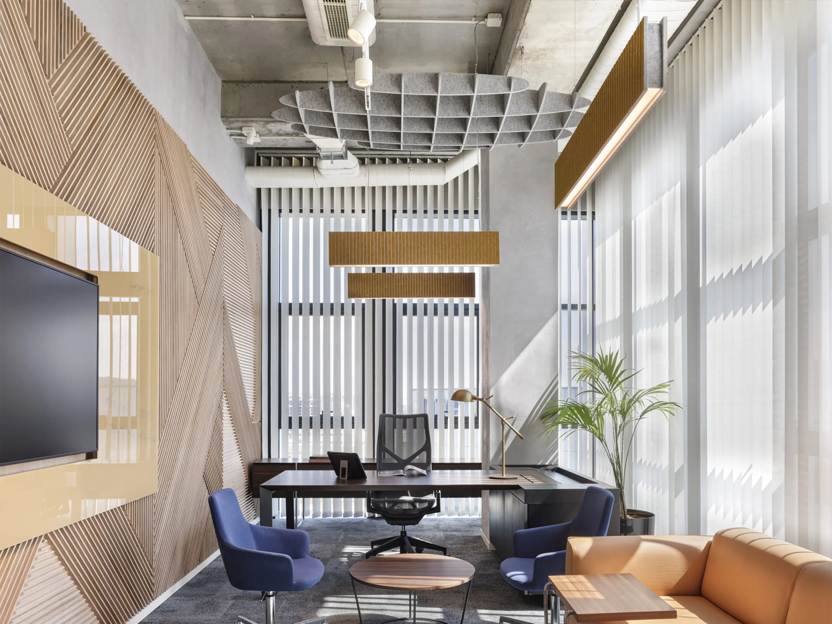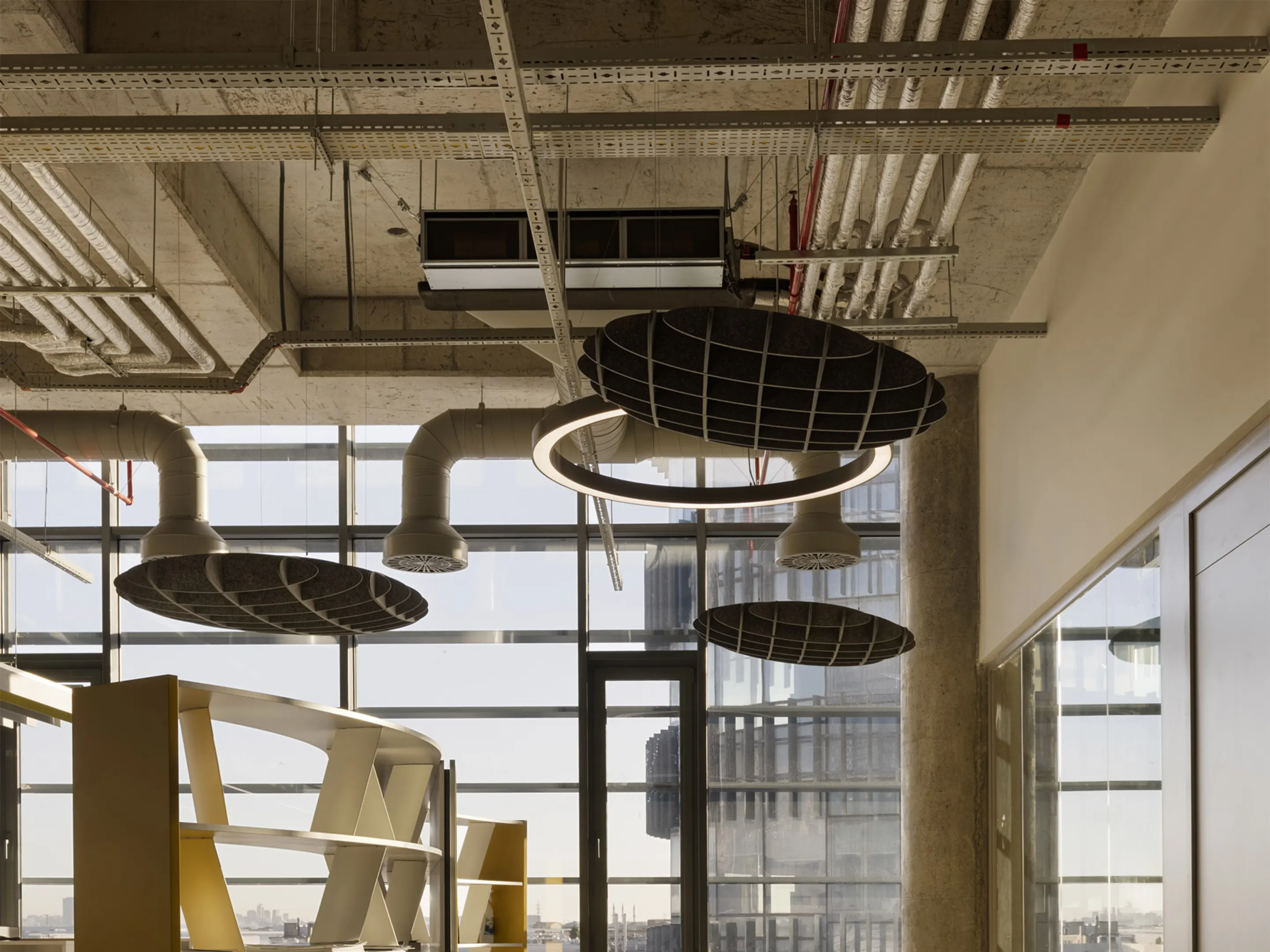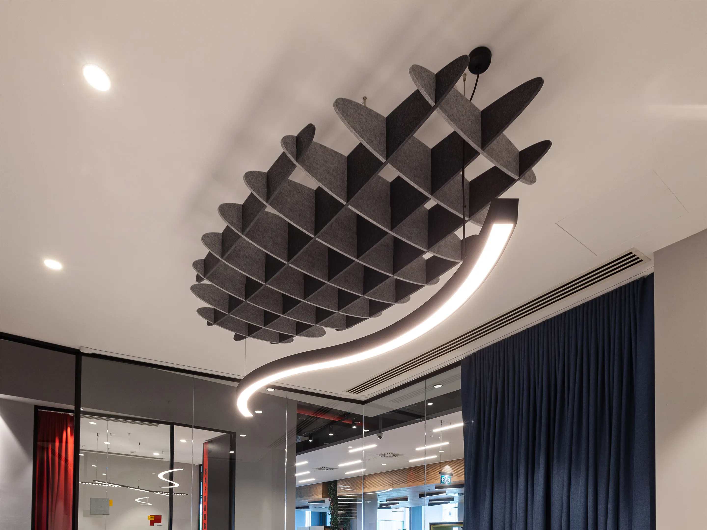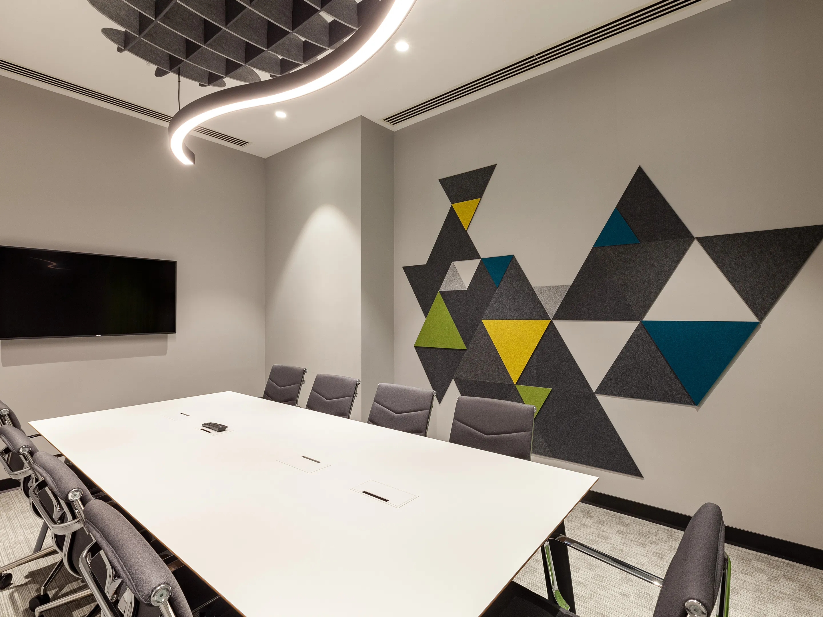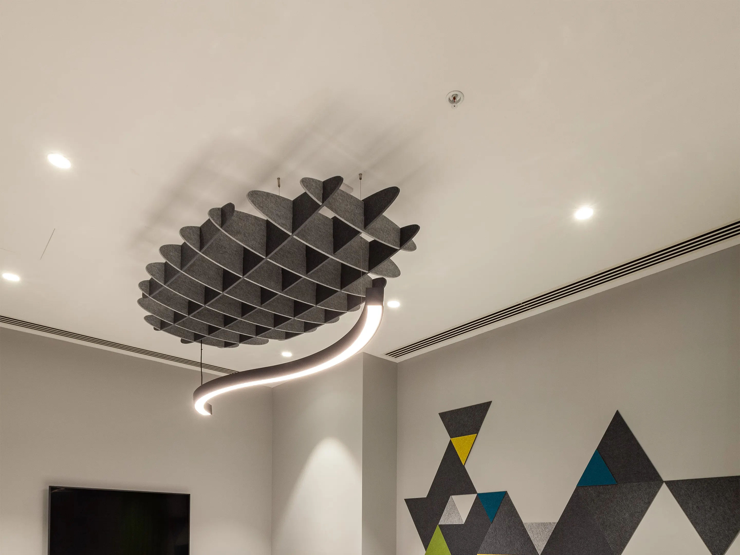 Akoestisch plafondpaneel hangend aan het plafond en een Sabins Waarde van 2,38 (m2).Incl. verstelbare staalkabels van 150cm, ophangset en installatiehandleiding