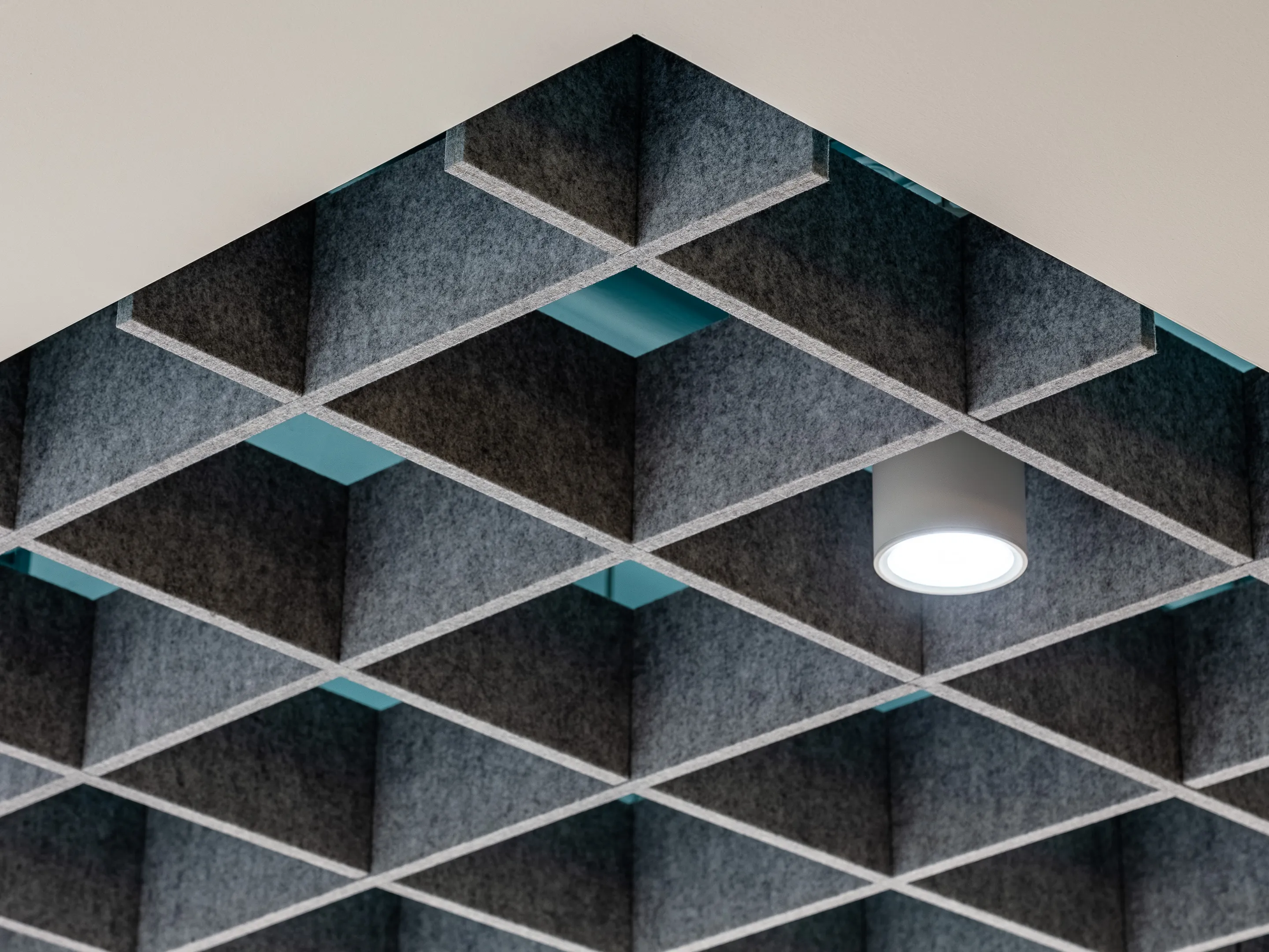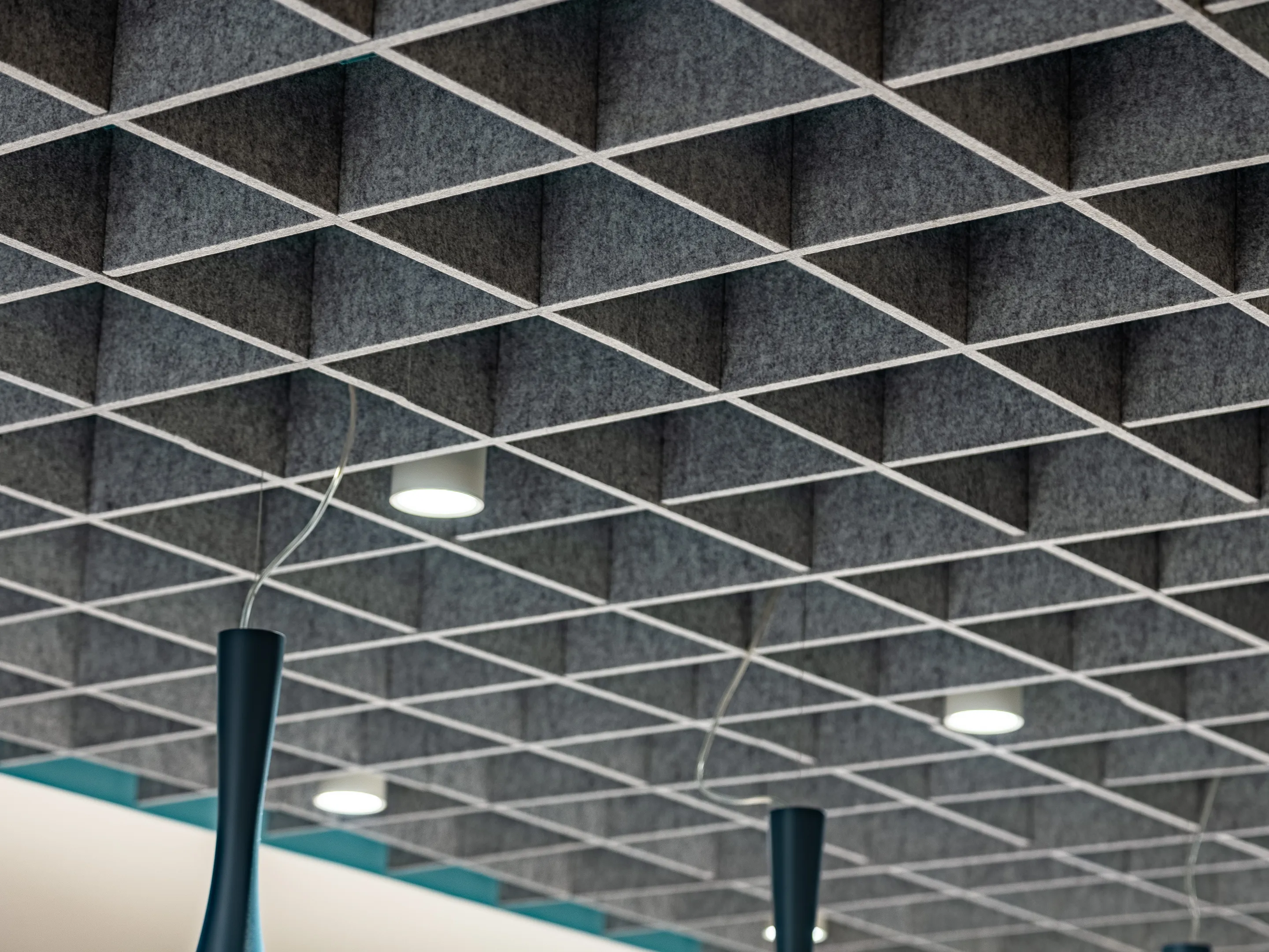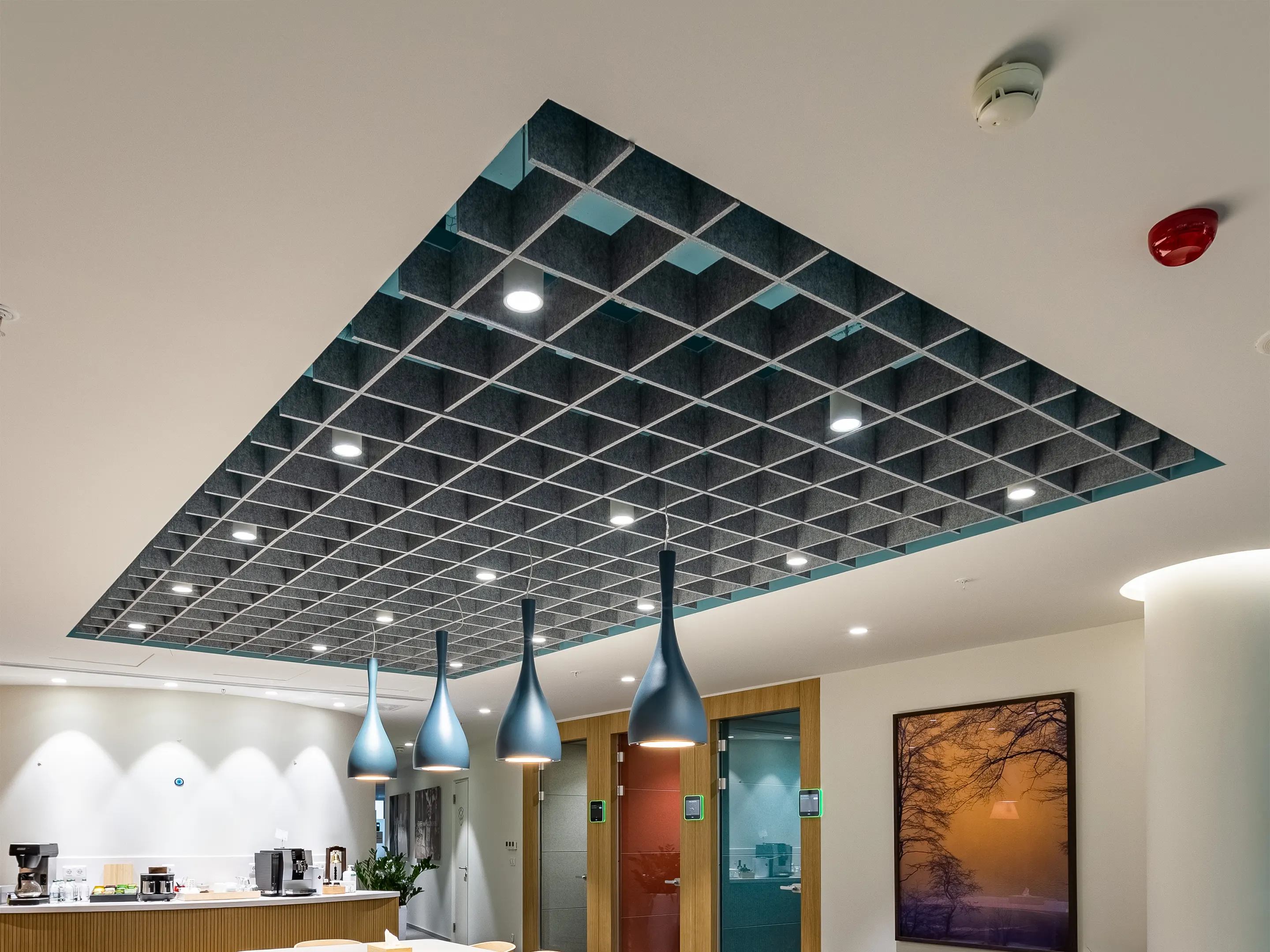 Rechthoekig akoestisch plafondpaneel met haakse hoeken hangend aan het plafond en een Sabins Waarde van 2,38 (m2).Incl. verstelbare staalkabels van 150cm, ophangset en installatiehandleiding