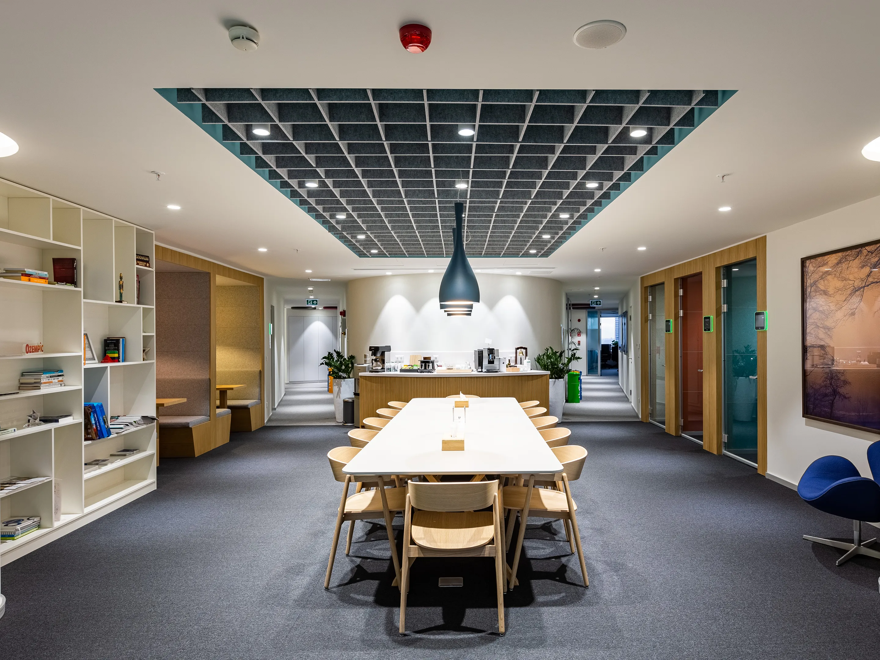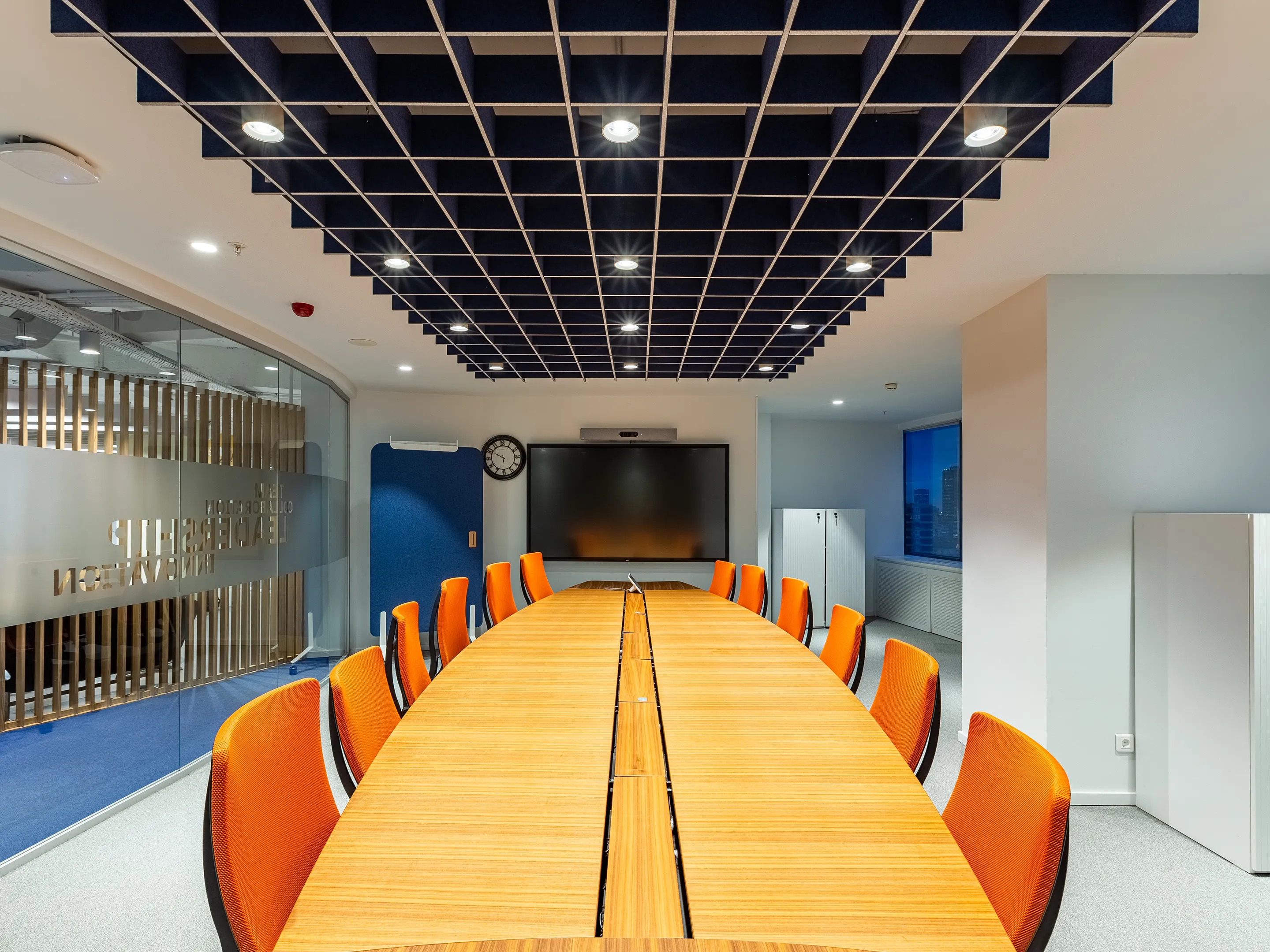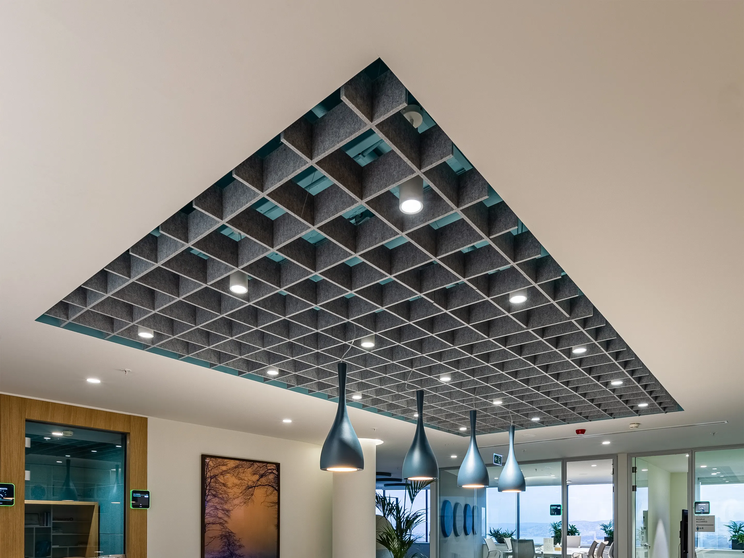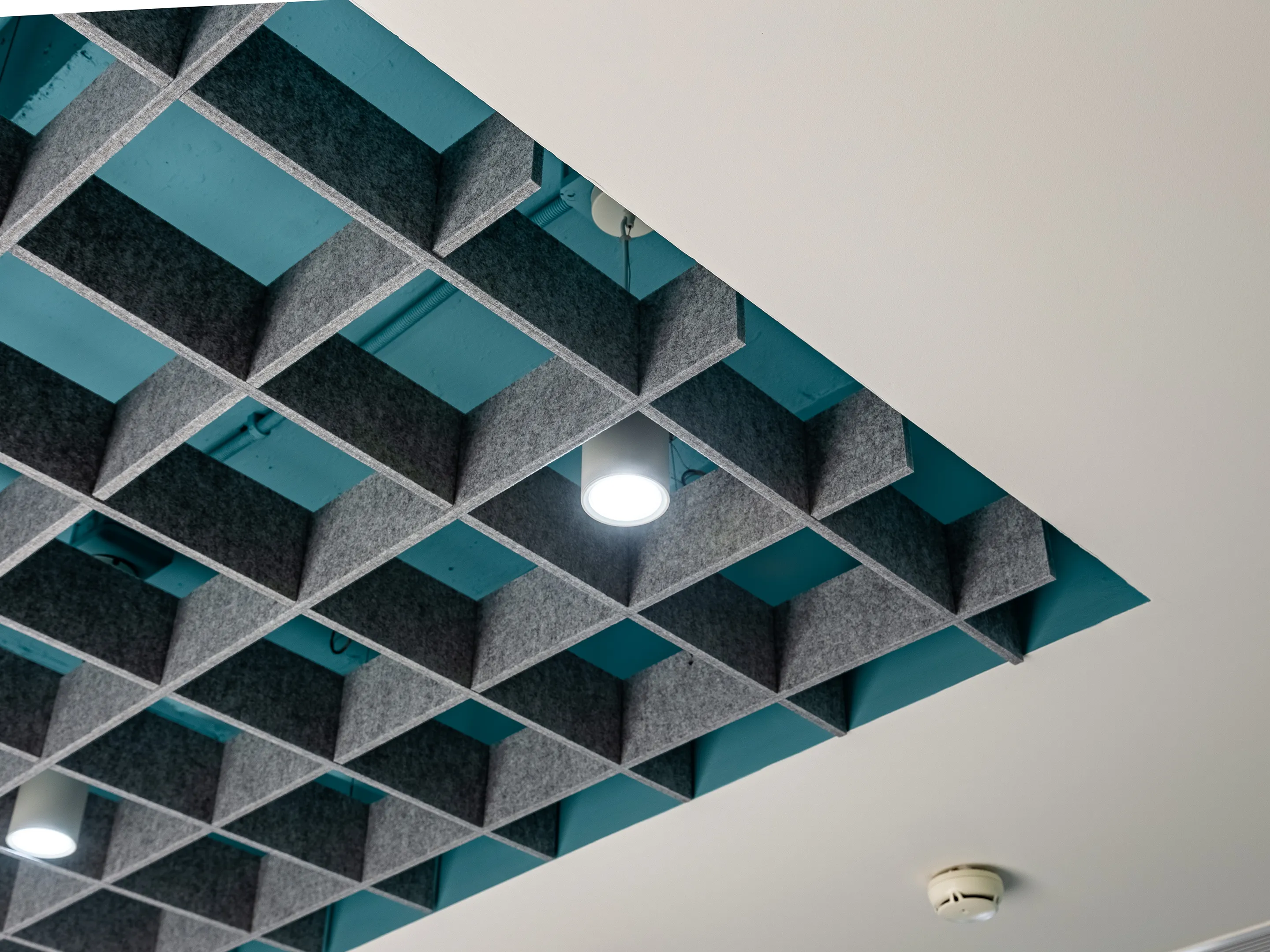 Rechthoekig akoestisch plafondpaneel met haakse hoeken hangend aan het plafond en een Sabins Waarde van 2,38 (m2).Incl. verstelbare staalkabels van 150cm, ophangset en installatiehandleiding
