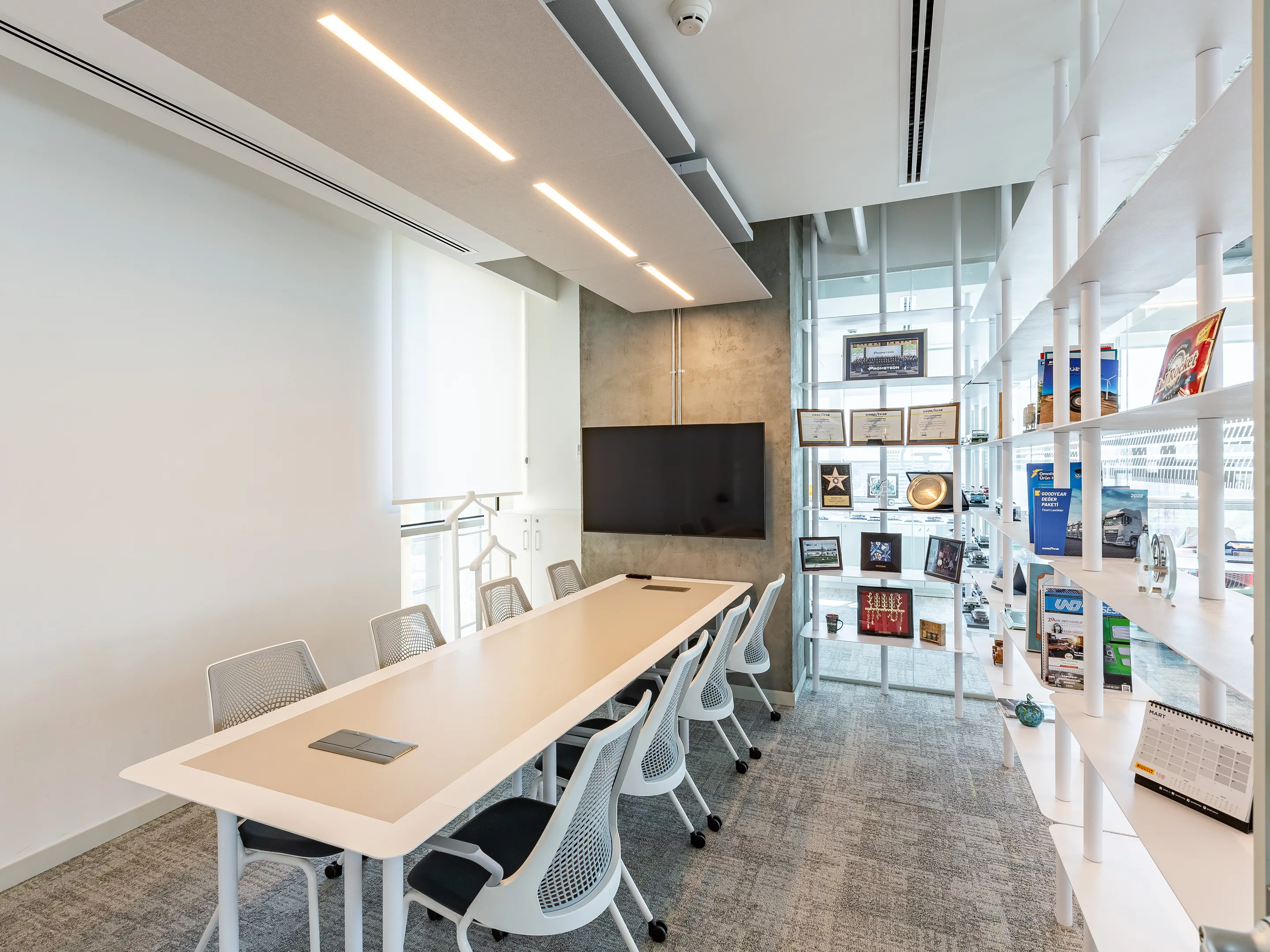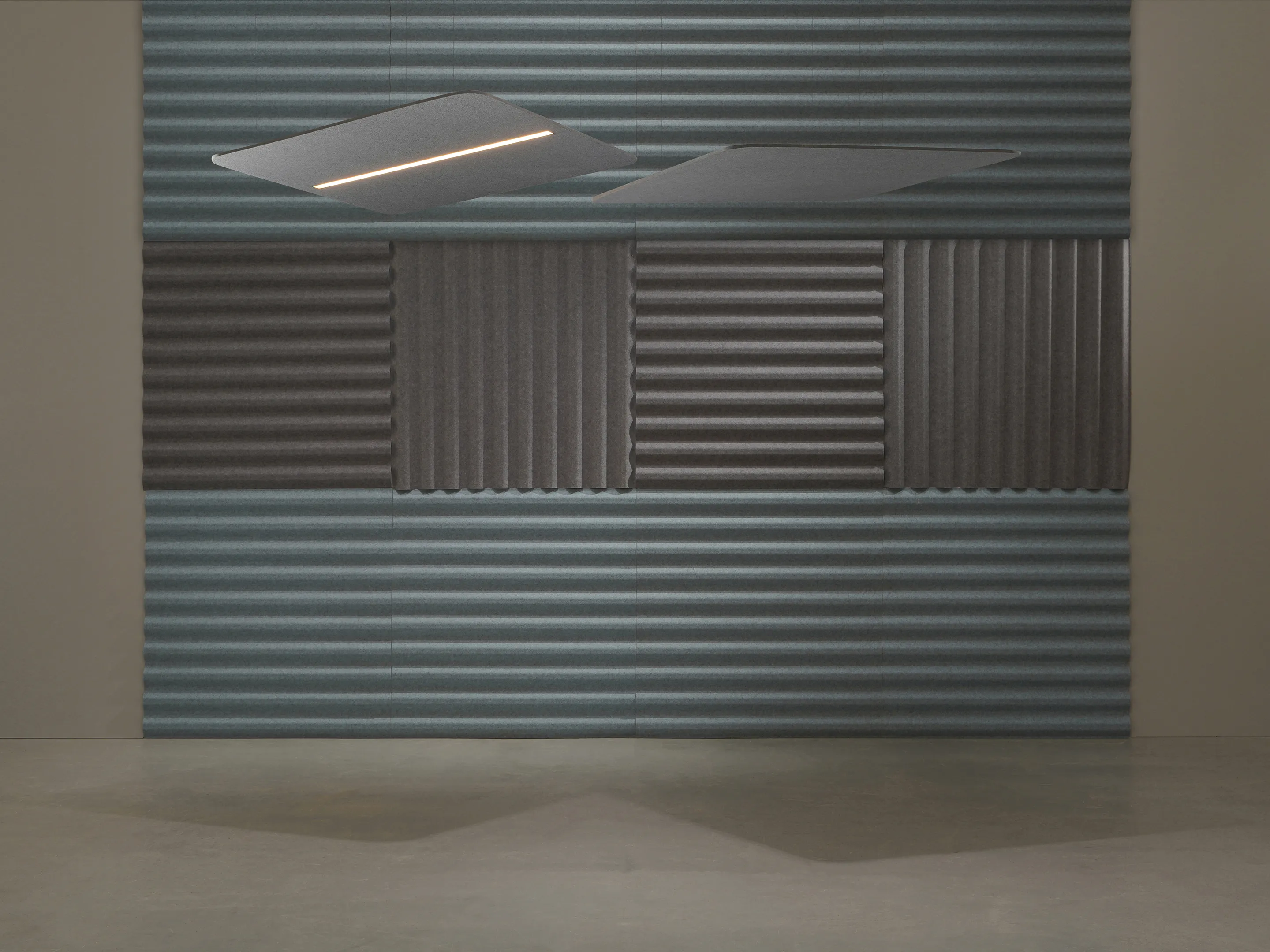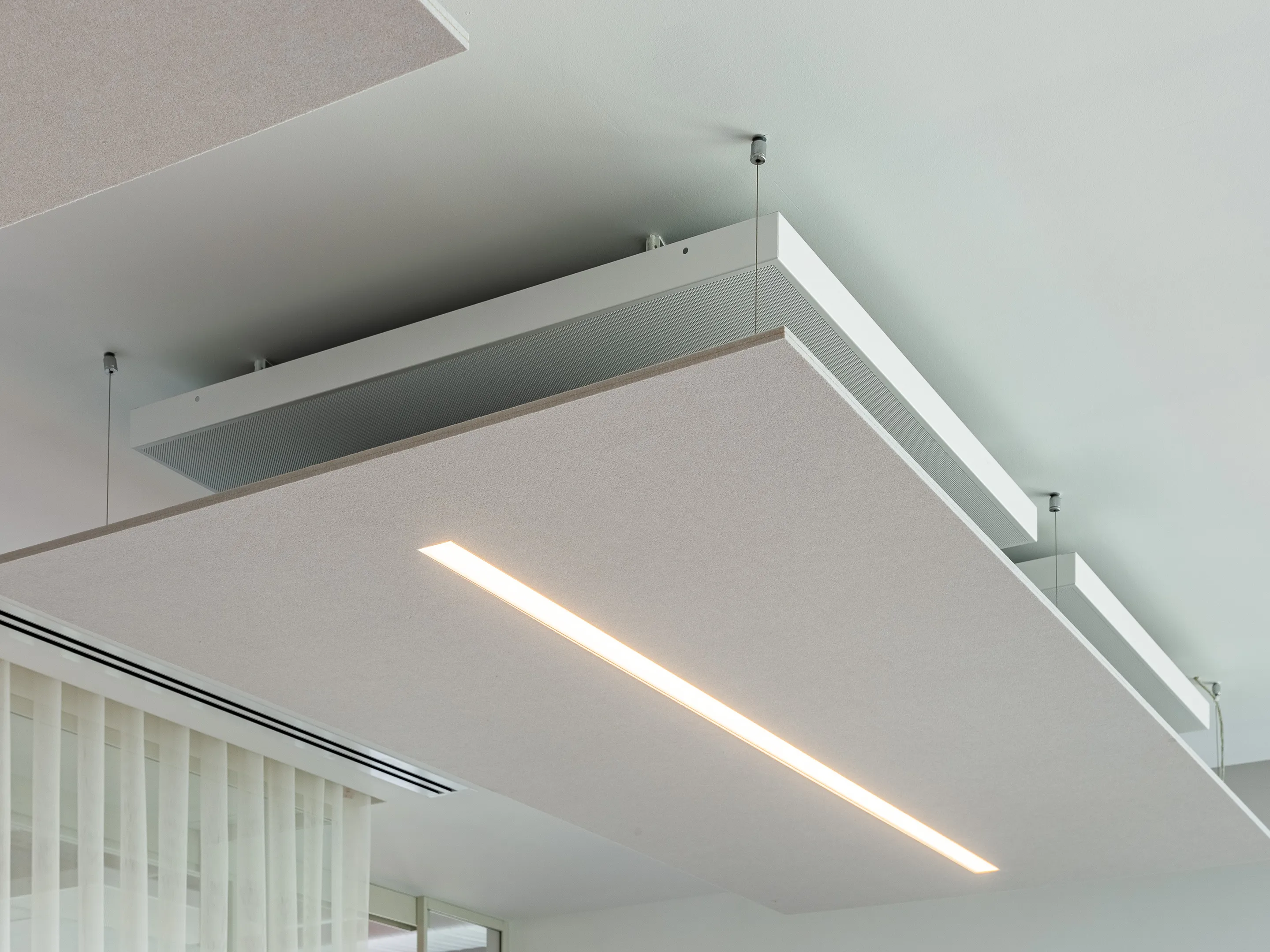 Rechthoekig akoestisch plafondpaneel met verlichting, hangend aan het plafond en een NRC Waarde van 0,80. Incl. lichtbron, frame, ophangset incl. verstelbare staalkabels van 300cm per kabel en installatiehandleiding