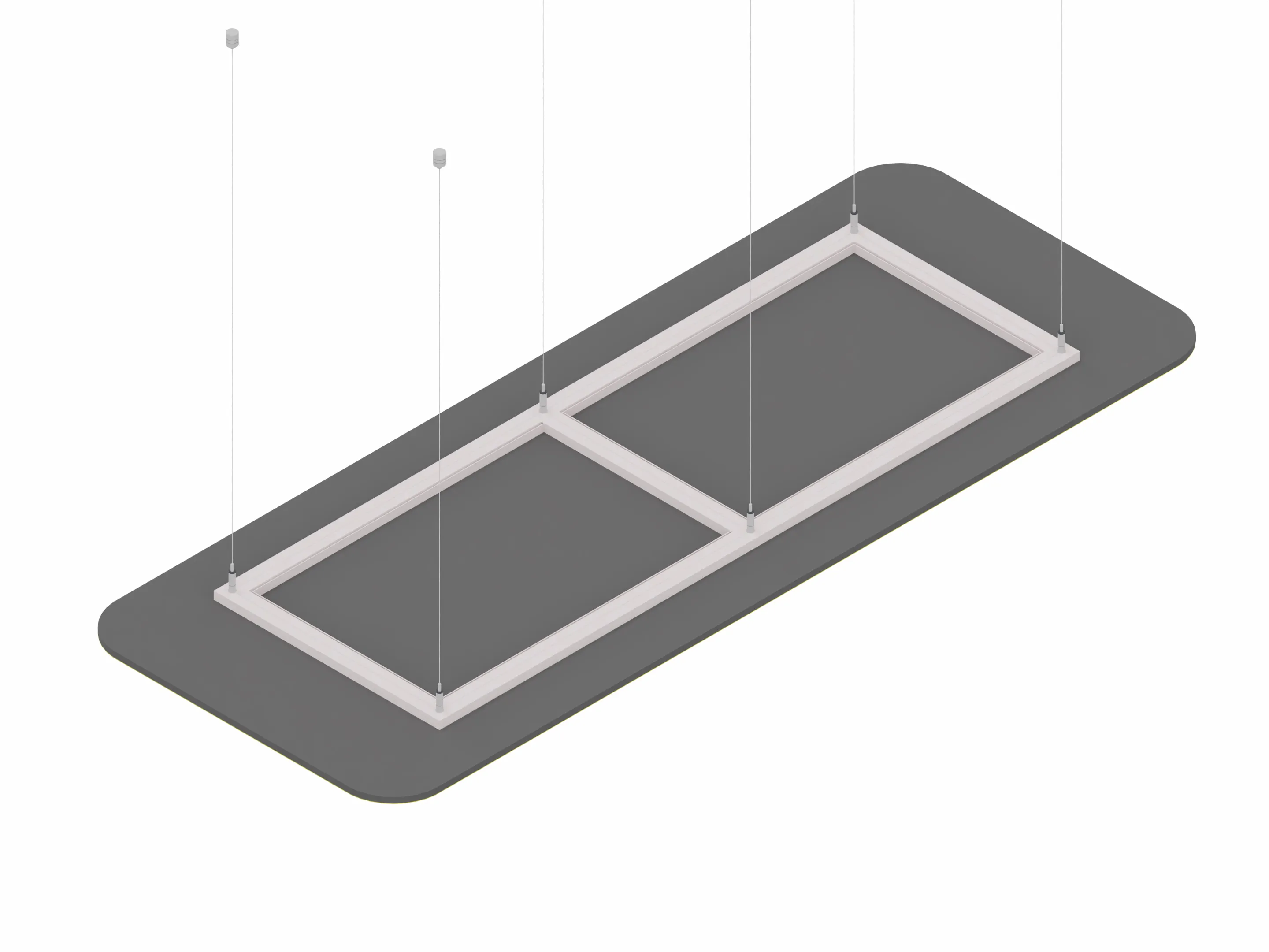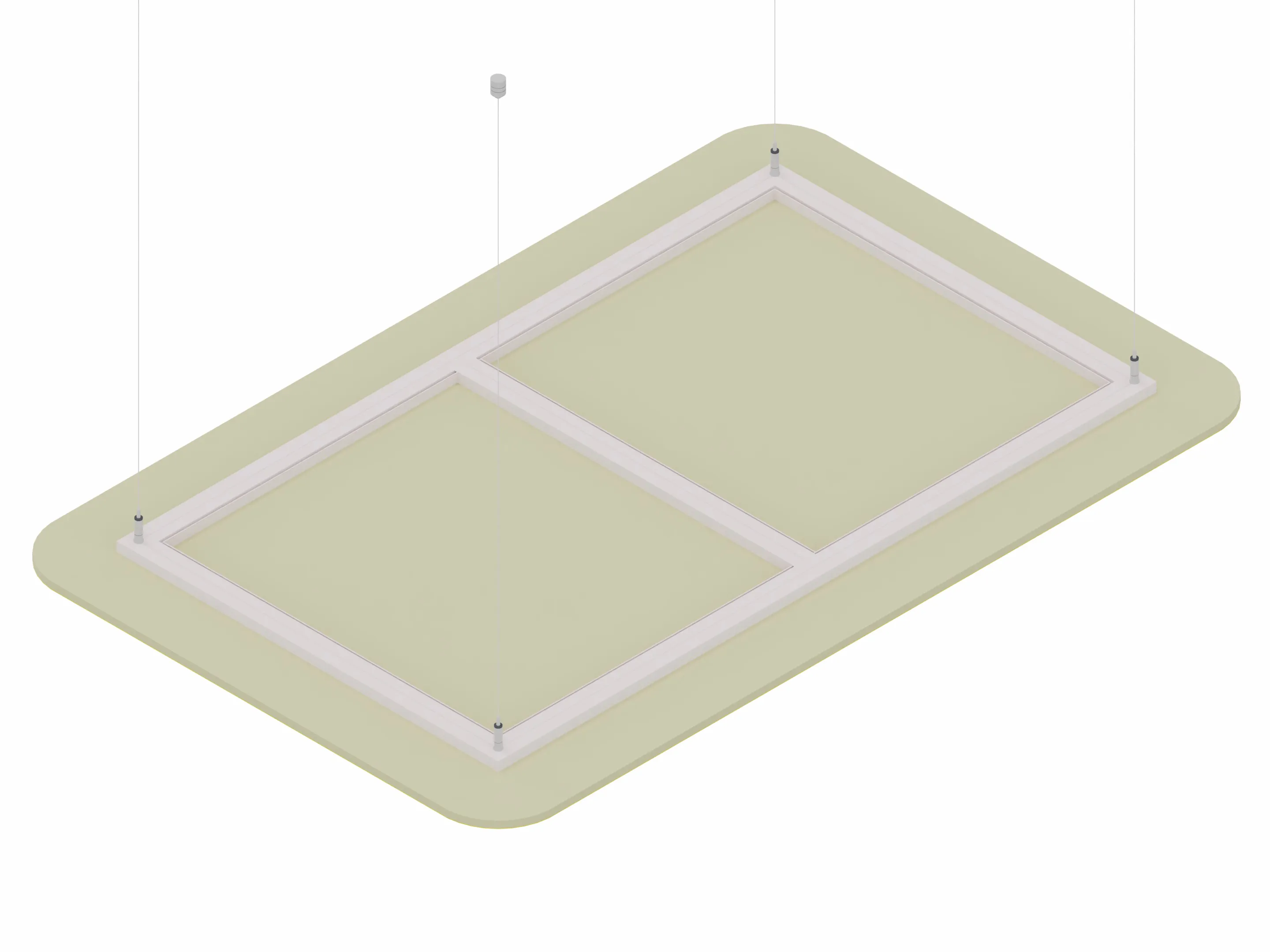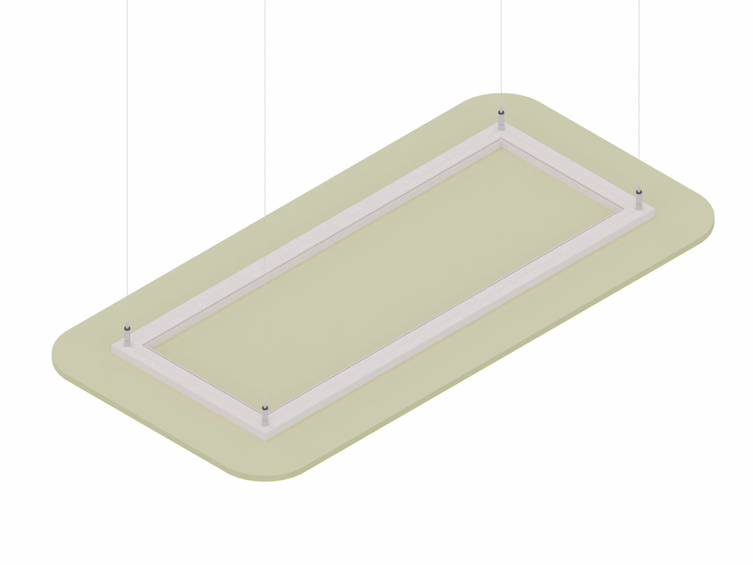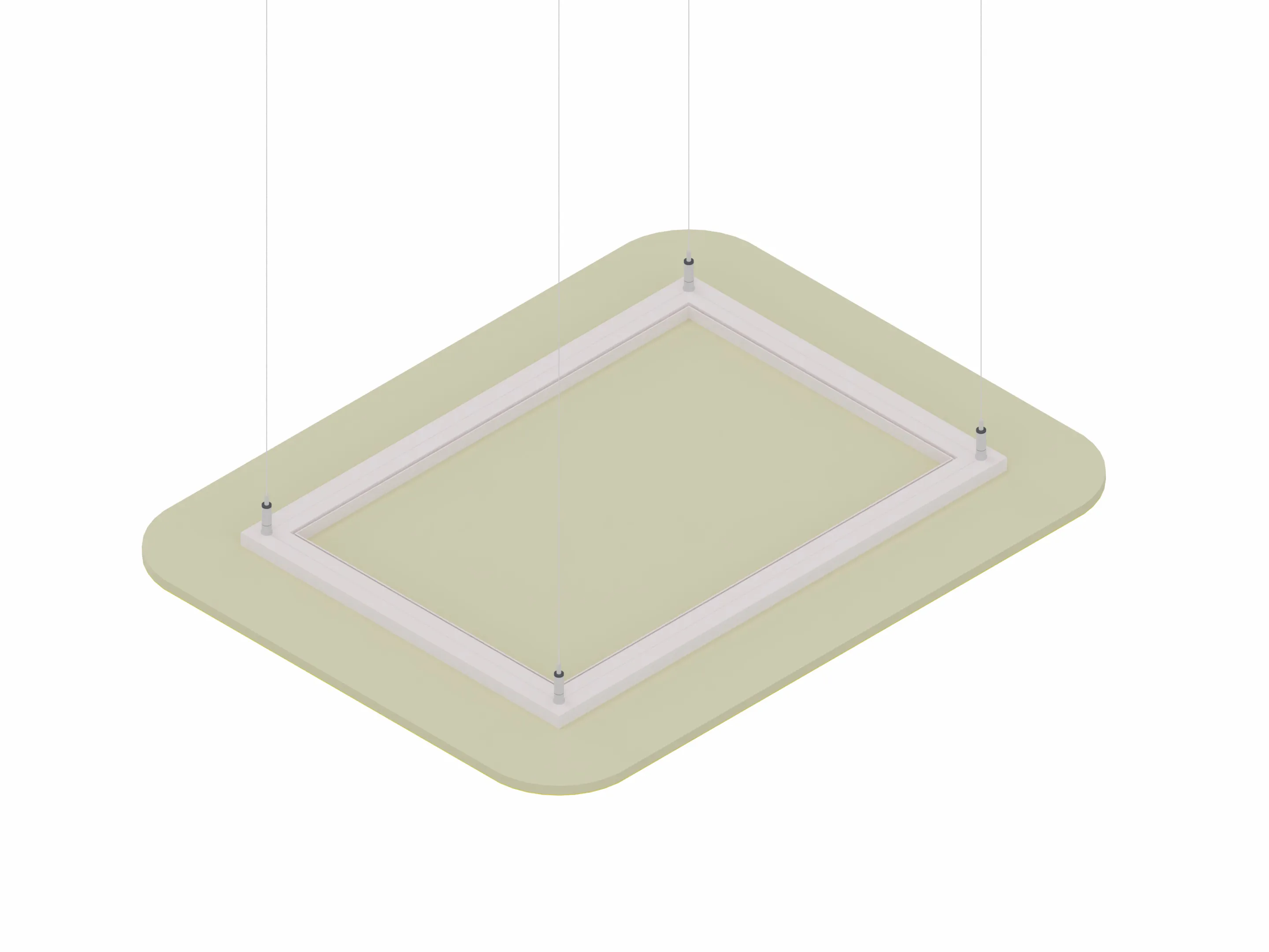 Rechthoekig akoestisch plafondpaneel incl. frame, hangend aan het plafond en een NRC Waarde van 0,80. Incl. frame, ophangset incl. verstelbare staalkabels van 300cm per kabel en installatiehandleiding