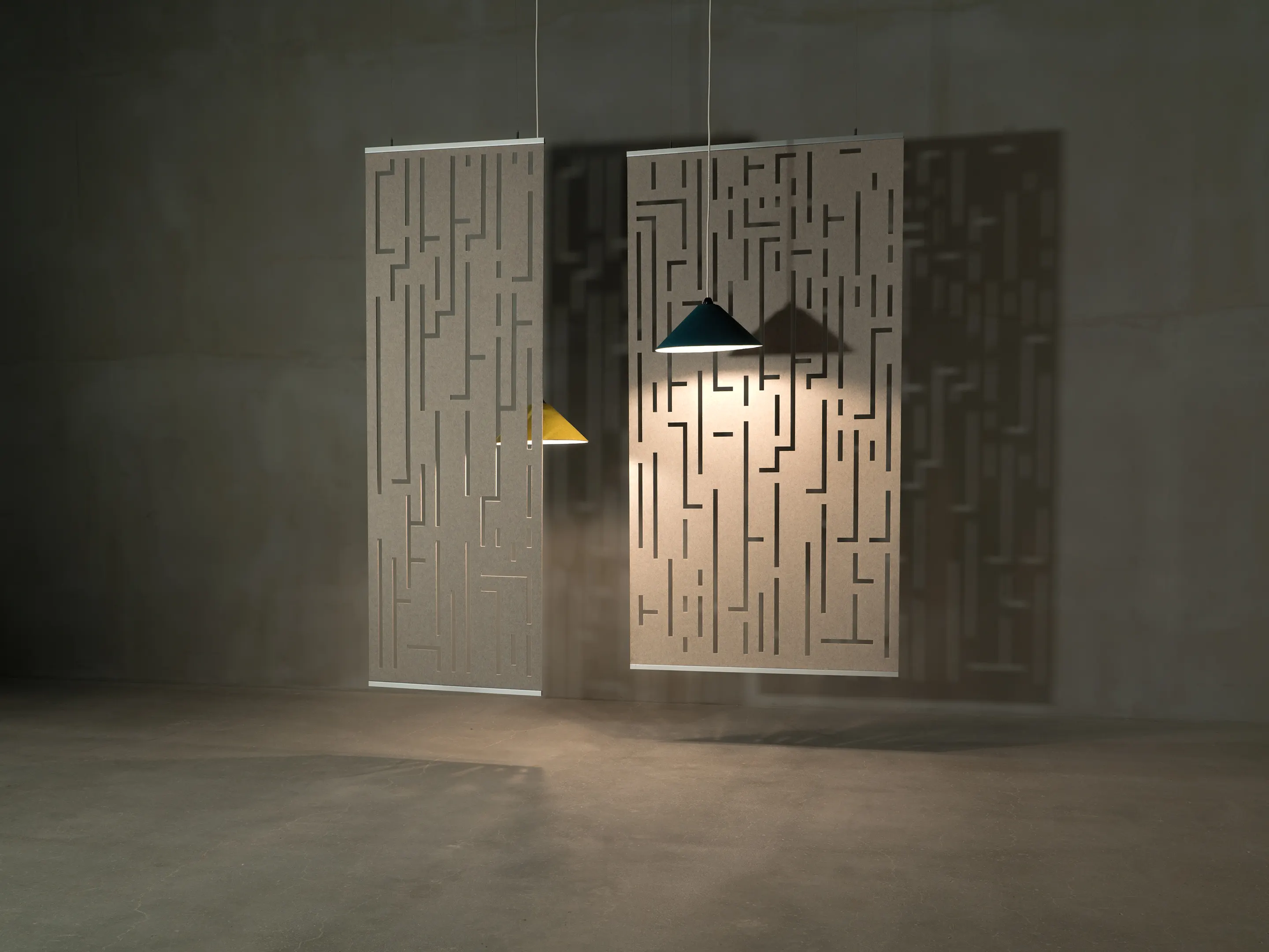 Akoestisch paneel hangend vanaf het plafond met een mesh Afrikaans patroon en een NRC Waarde van 0,23. Incl. 1,5m verstelbare staalkabel, aluminium U-profiel aan boven- en onderkant van paneel en installatiehandleiding.