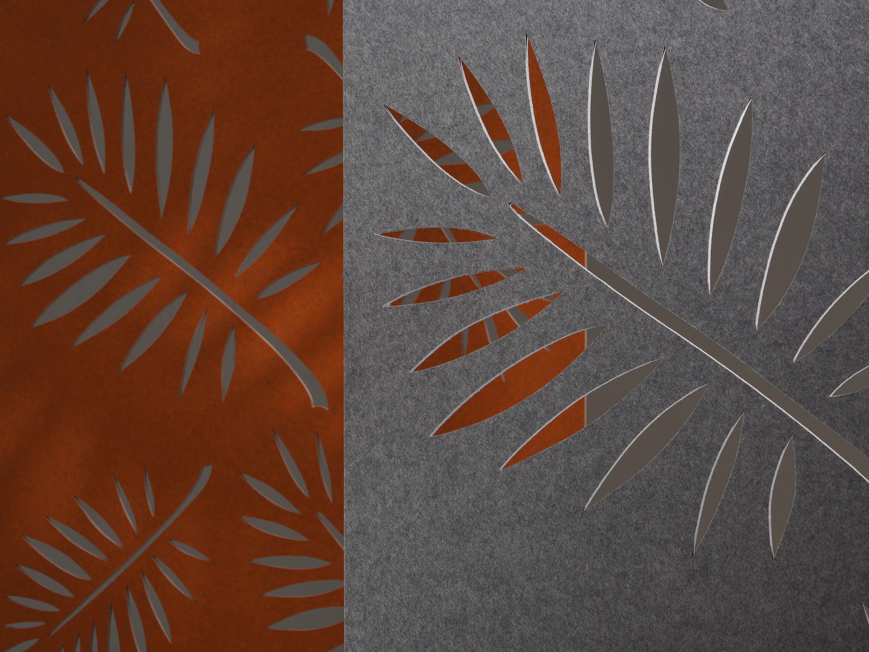 Akoestisch paneel hangend vanaf het plafond met een mesh bladeren patroon en een NRC Waarde van 0,23. Incl. 1,5m verstelbare staalkabel, aluminium U-profiel aan boven- en onderkant van paneel en installatiehandleiding.