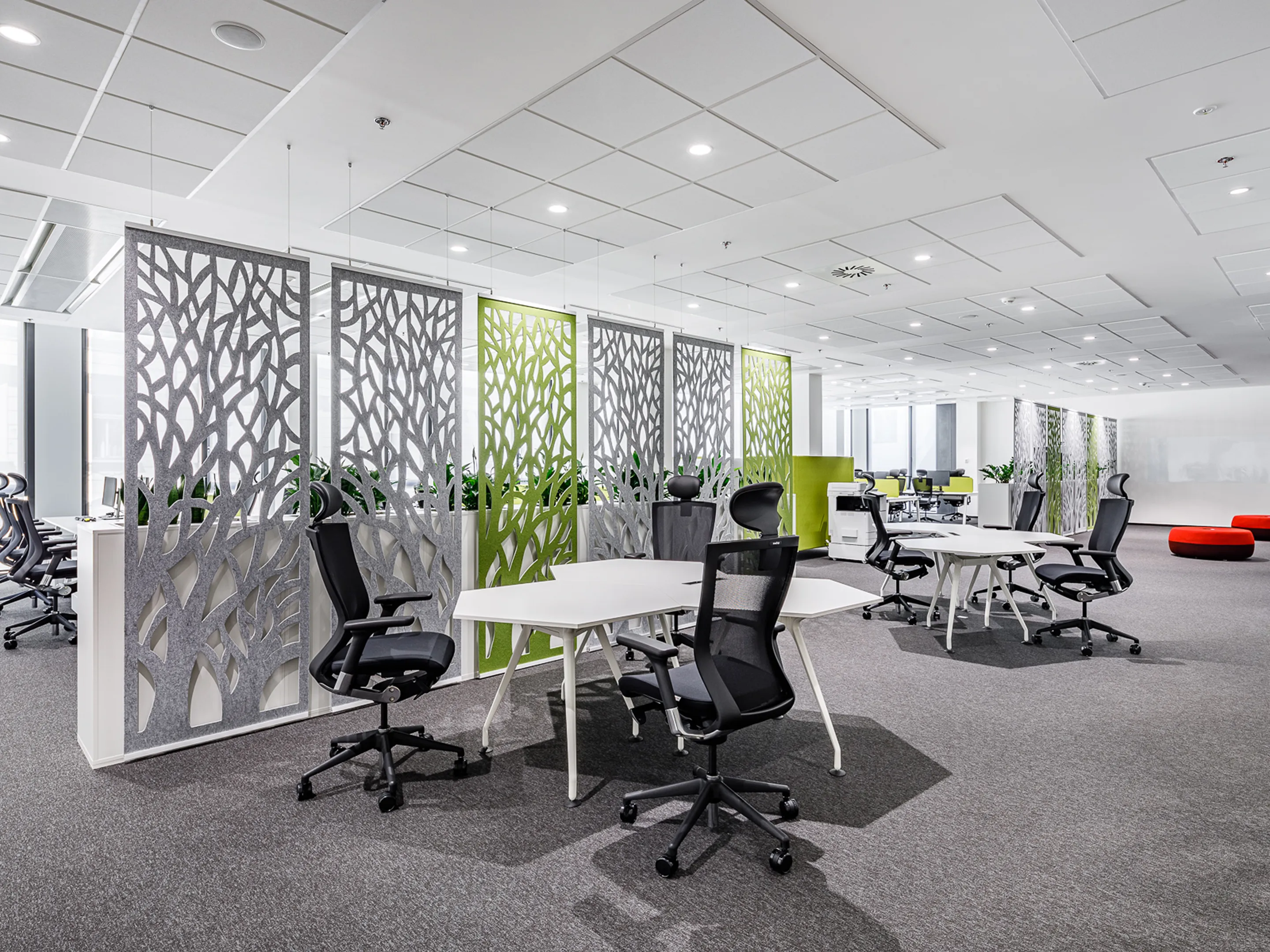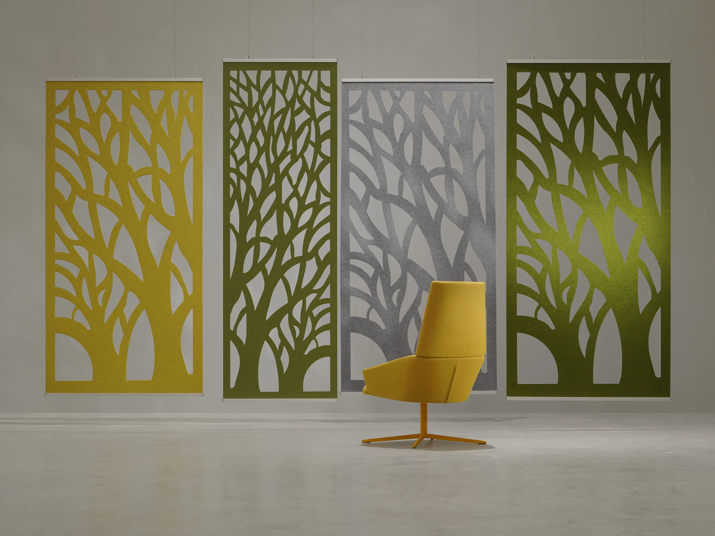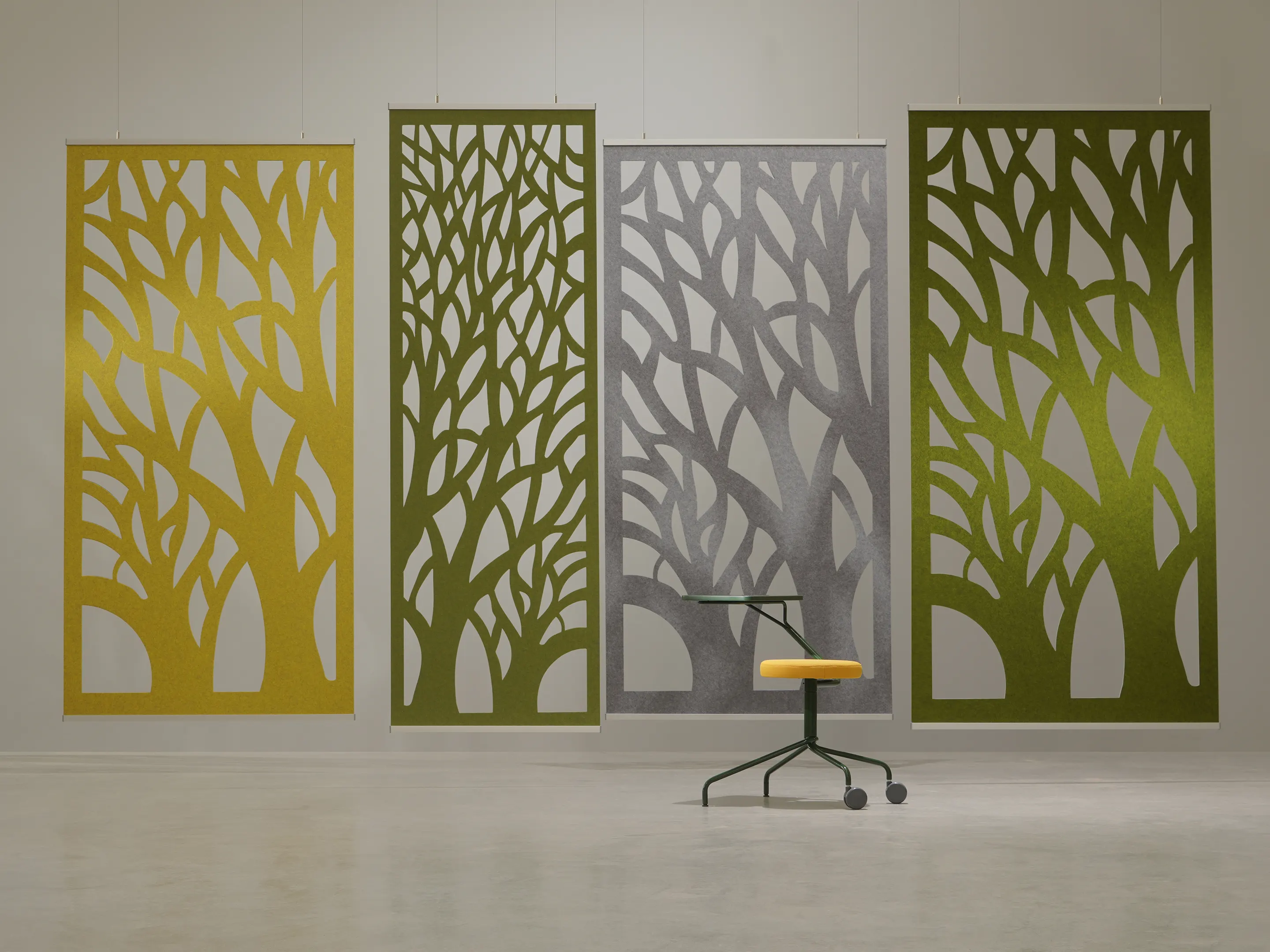 Akoestisch paneel hangend vanaf het plafond met een mesh boom patroon en een NRC Waarde van 0,23. Incl. 1,5m verstelbare staalkabel, aluminium U-profiel aan boven- en onderkant van paneel en installatiehandleiding.