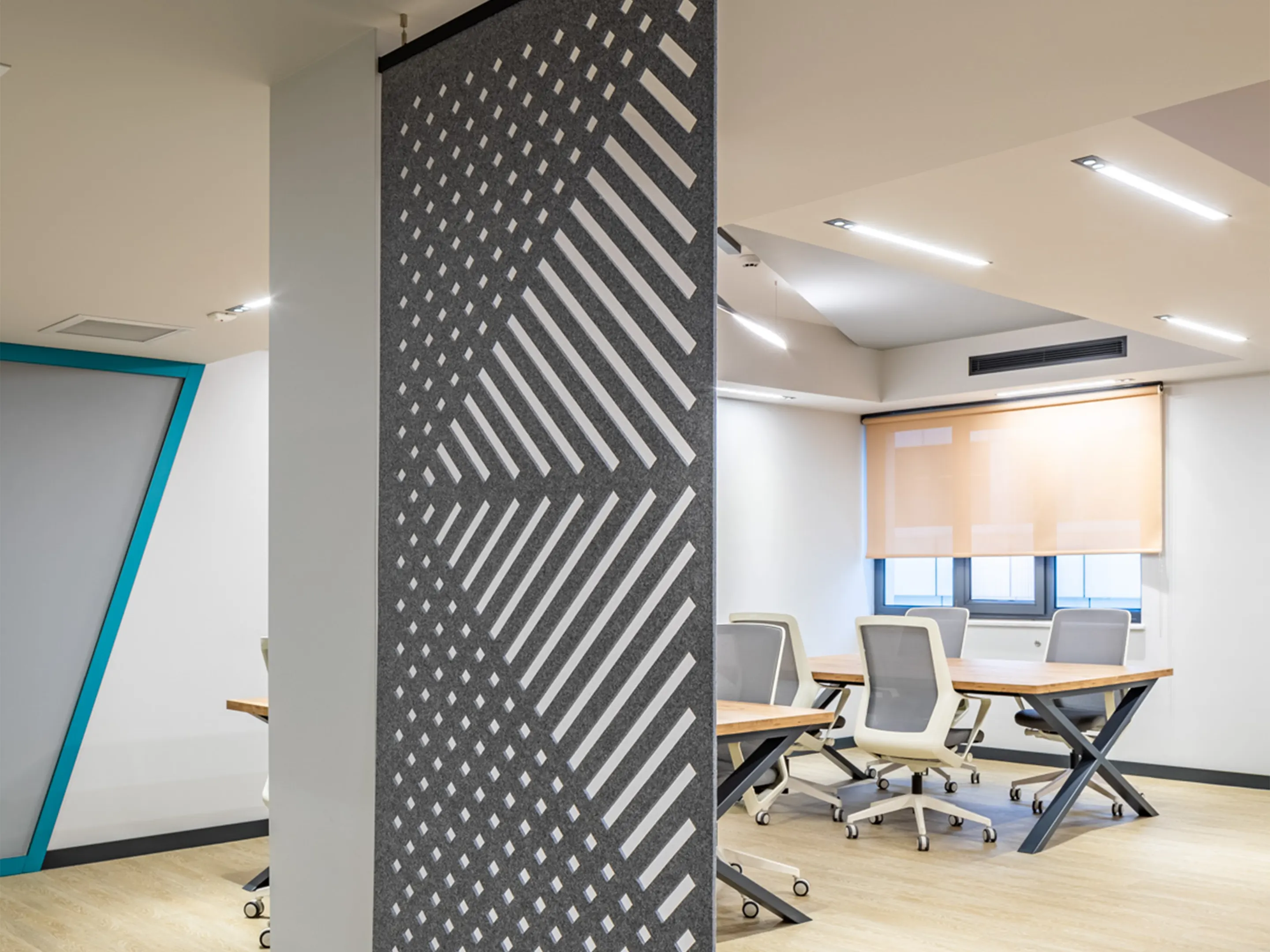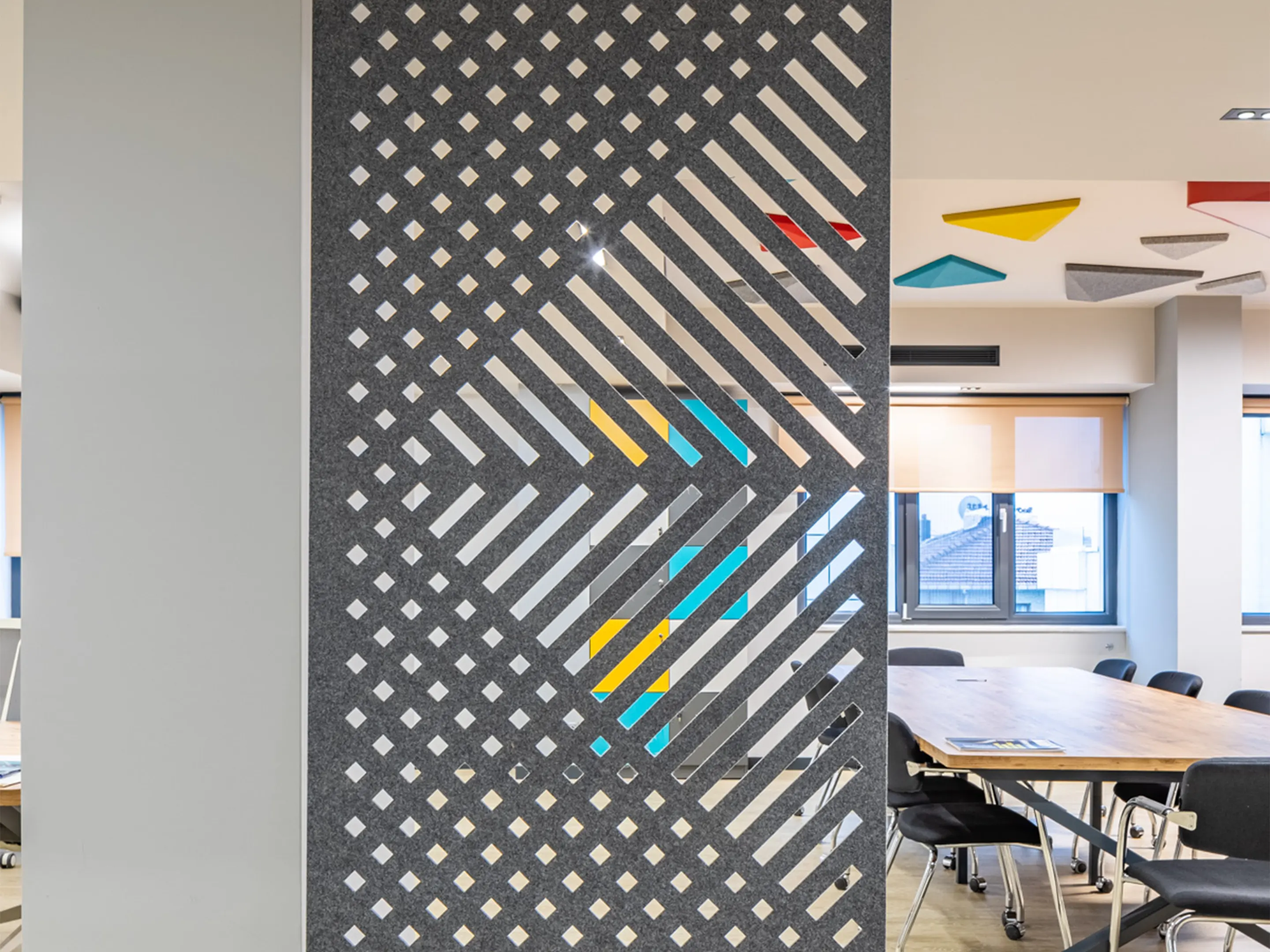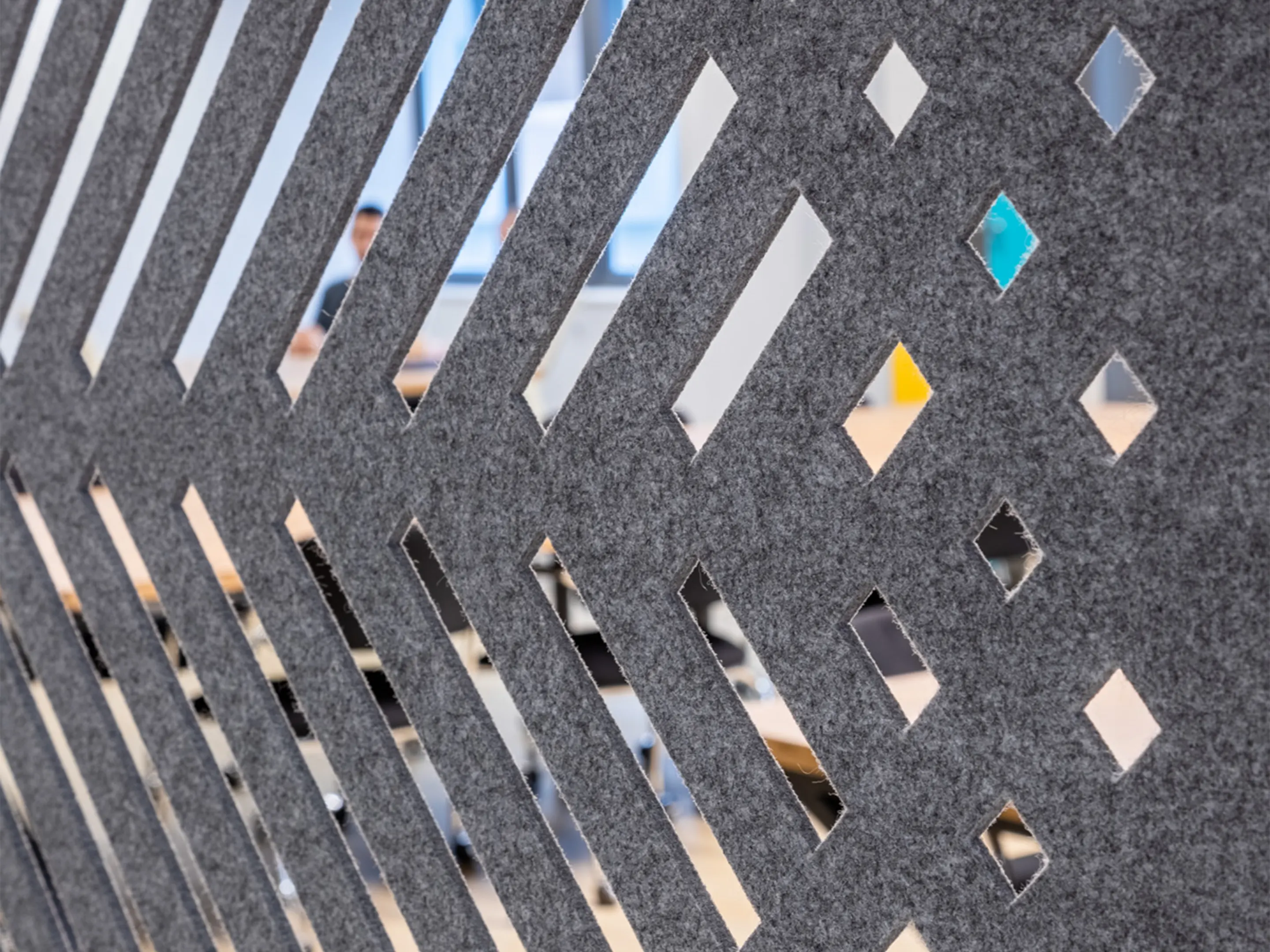 Akoestisch paneel hangend vanaf het plafond met een mesh line patroon en een NRC Waarde van 0,23. Incl. 1,5m verstelbare staalkabel, aluminium U-profiel aan boven- en onderkant van paneel en installatiehandleiding.