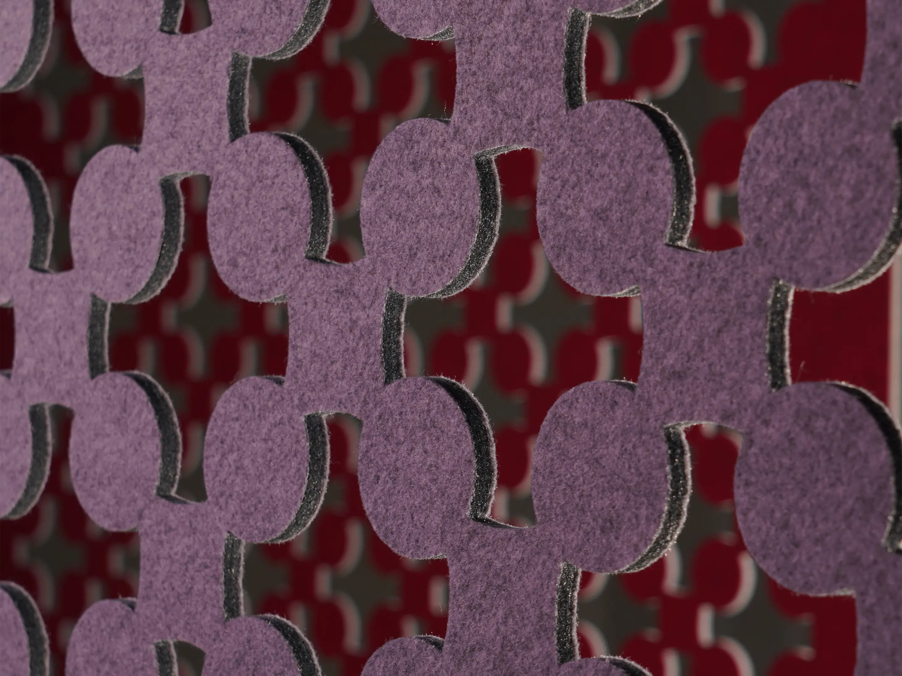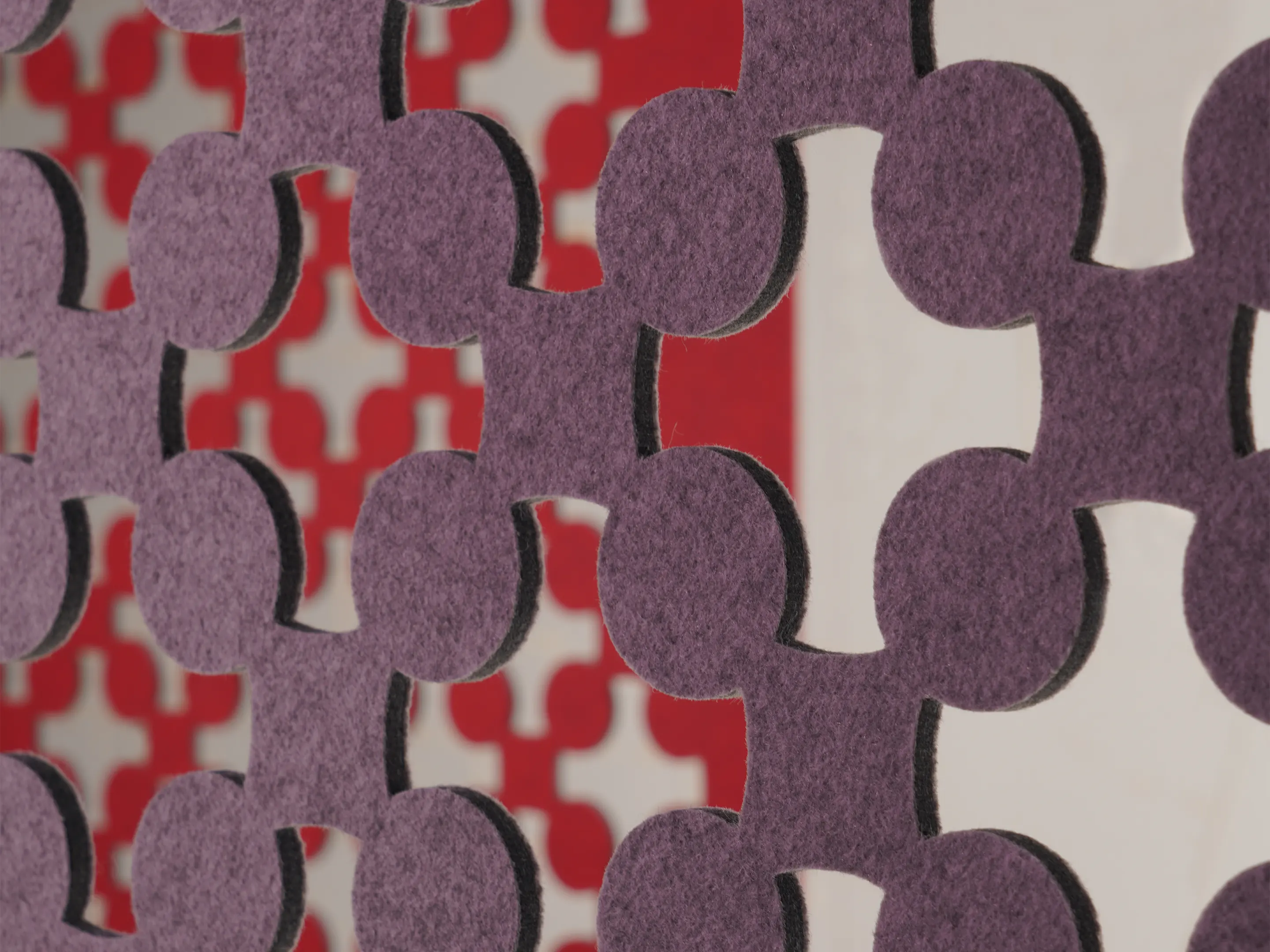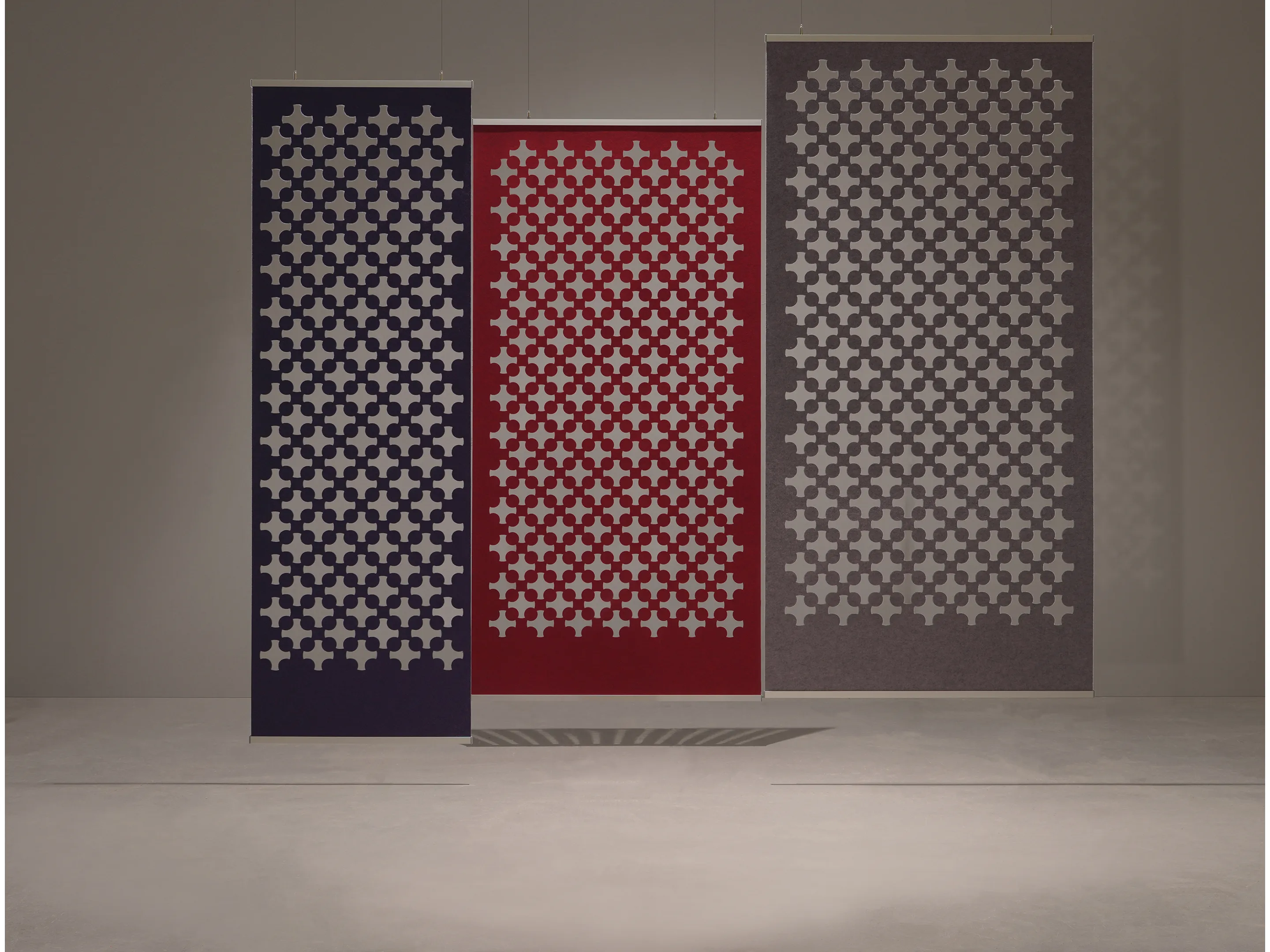 Akoestisch paneel hangend vanaf het plafond met een mesh kruisjes patroon en een NRC Waarde van 0,23. Incl. 1,5m verstelbare staalkabel, aluminium U-profiel aan boven- en onderkant van paneel en installatiehandleiding.