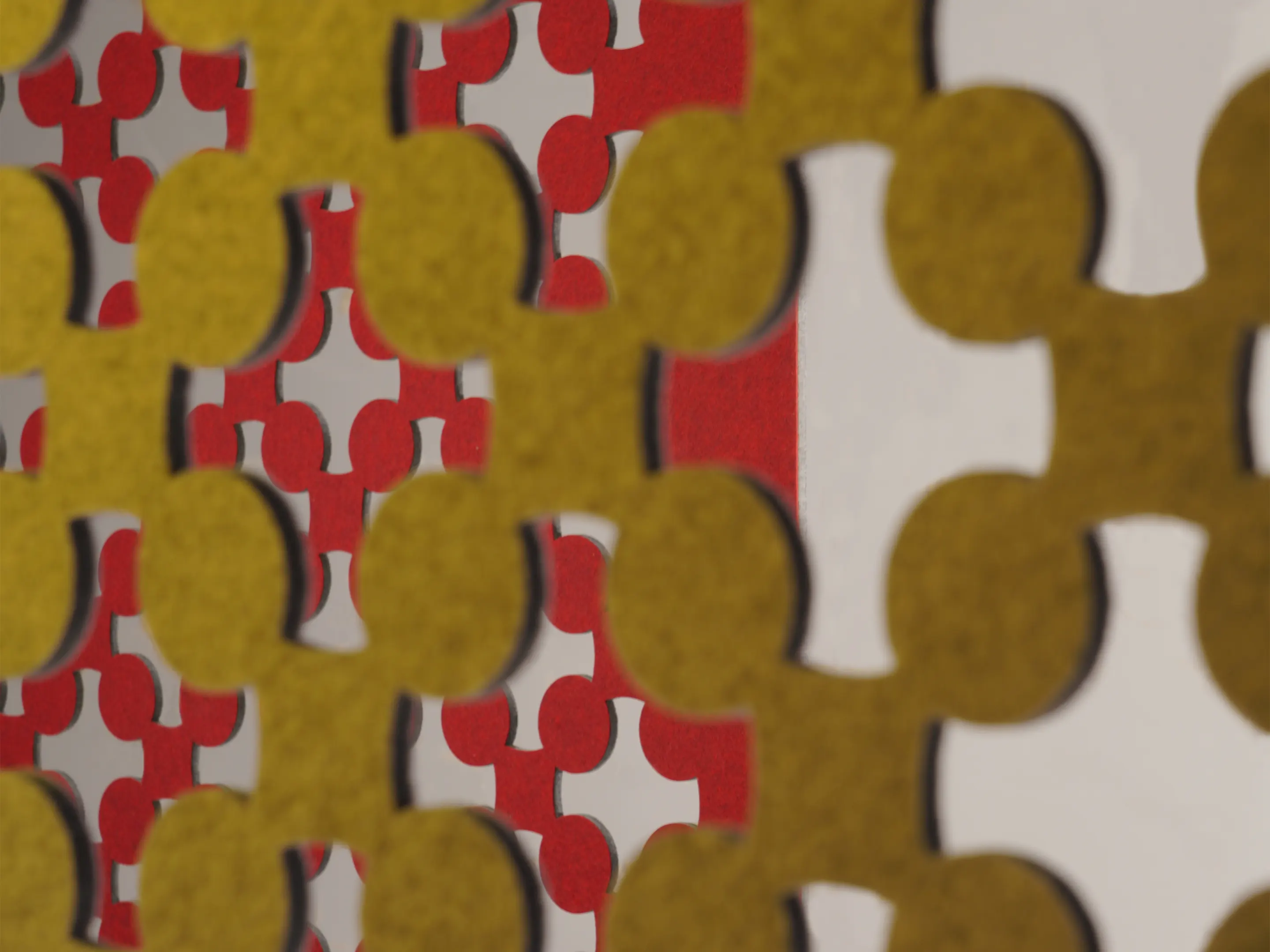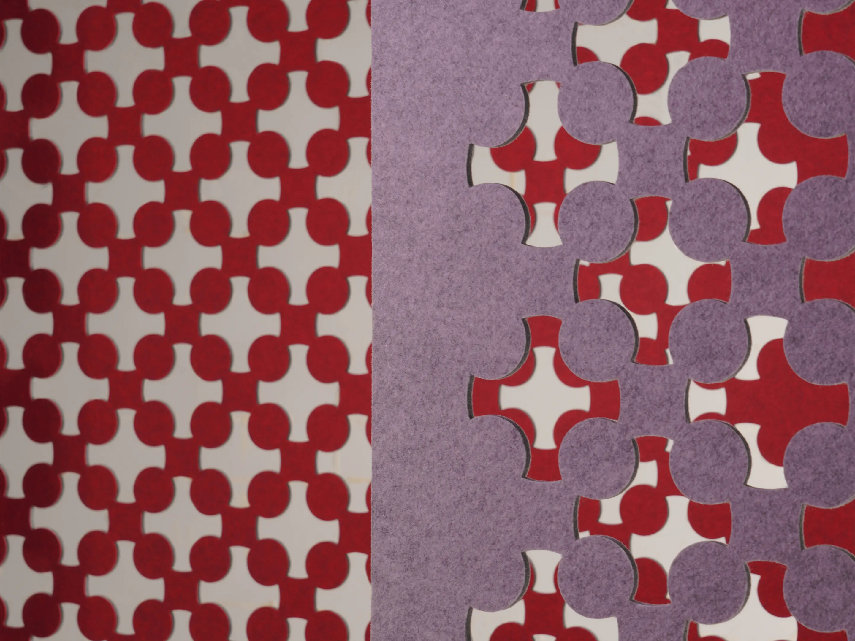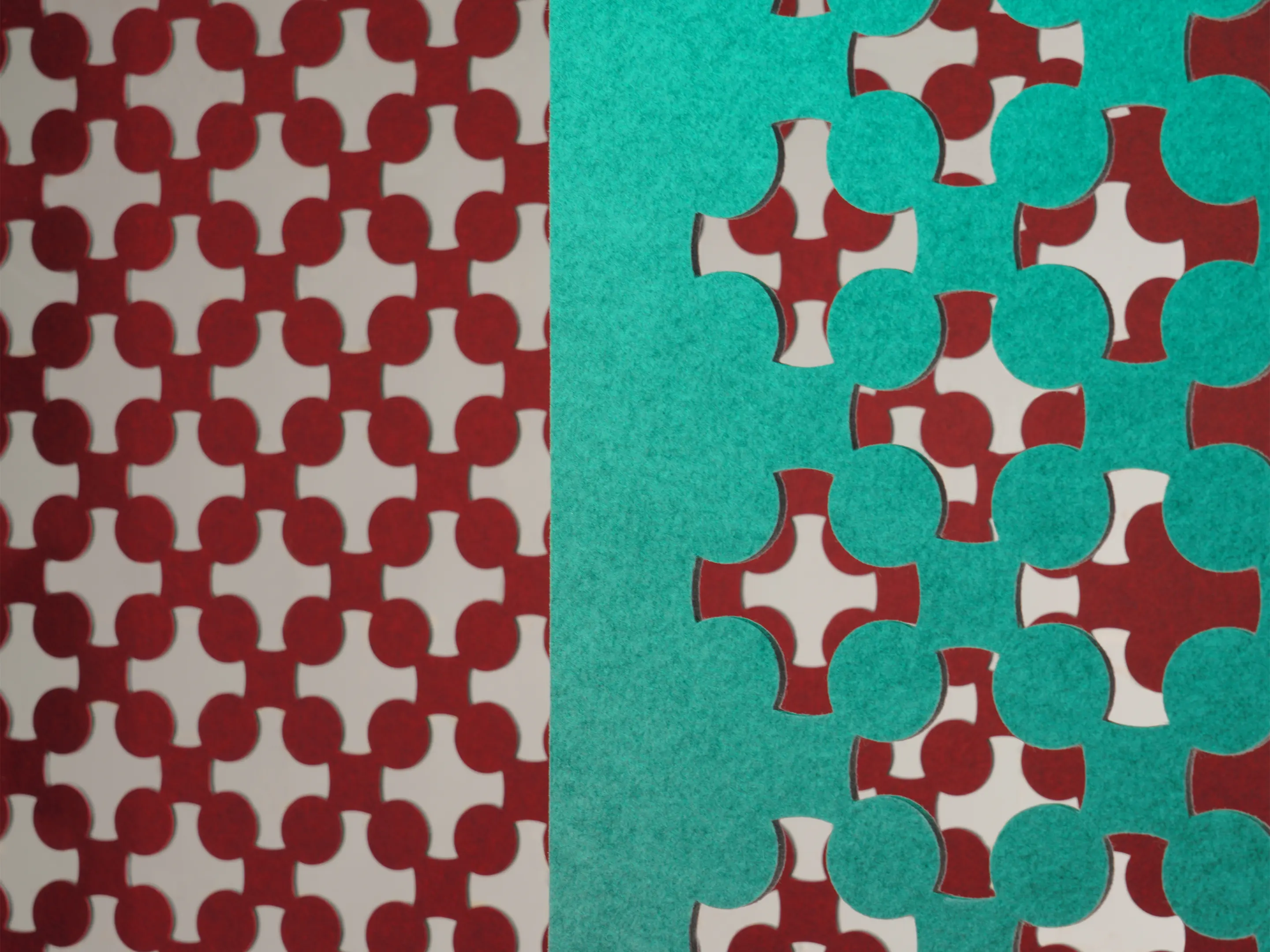 Akoestisch paneel hangend vanaf het plafond met een mesh kruisjes patroon en een NRC Waarde van 0,23. Incl. 1,5m verstelbare staalkabel, aluminium U-profiel aan boven- en onderkant van paneel en installatiehandleiding.