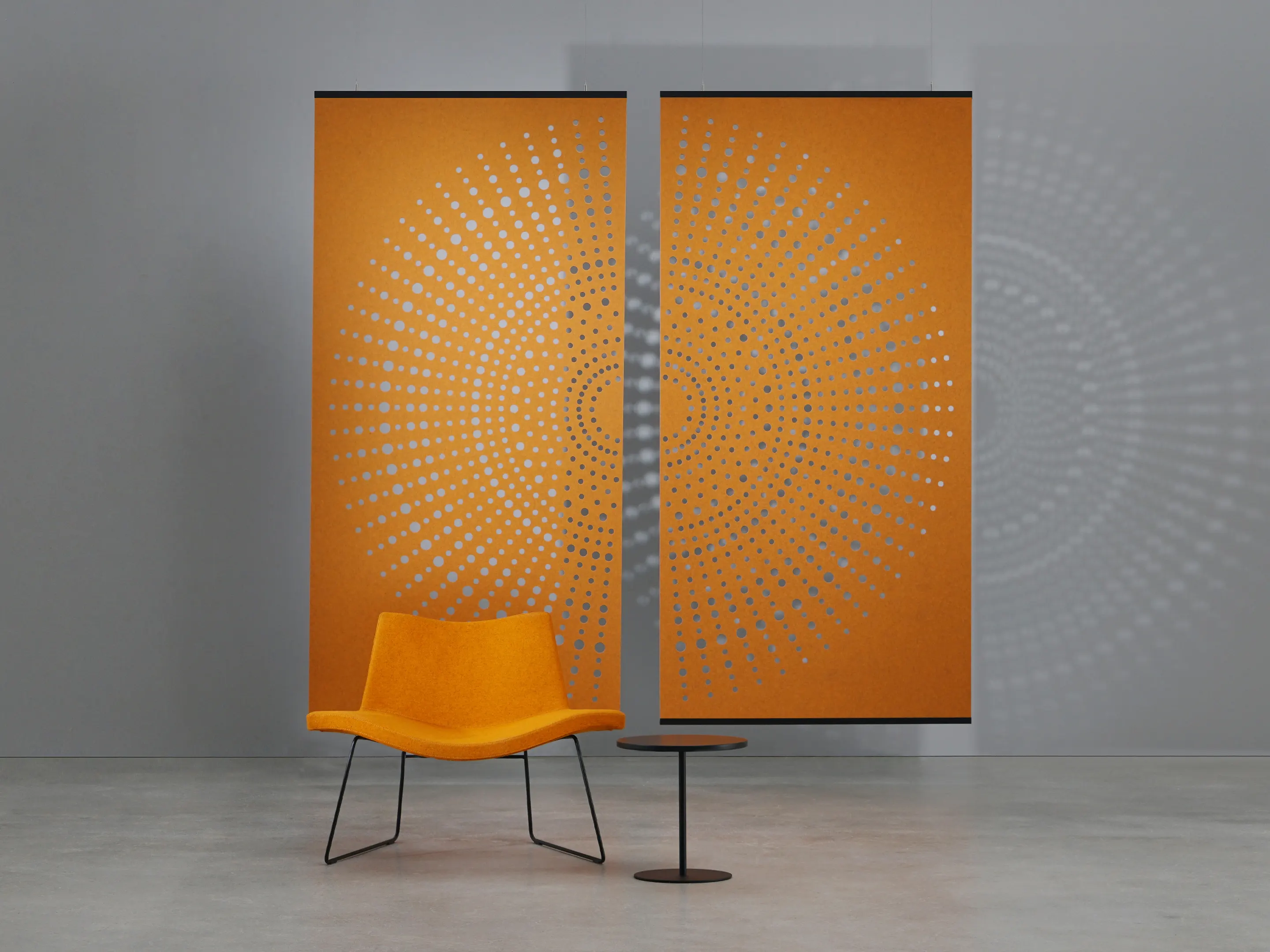 Akoestisch paneel hangend vanaf het plafond met een mesh zon patroon en een NRC Waarde van 0,23. Voor complete opstelling zijn 2 panelen nodig. Incl. 1,5m verstelbare staalkabel, aluminium U-profiel aan beide zijden paneel en installatiehandleiding.