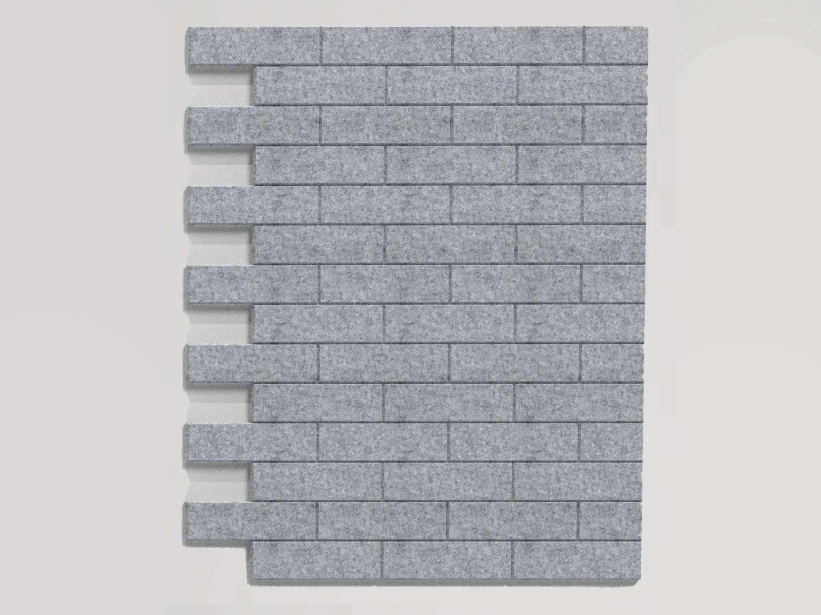 Akoestisch paneel met baksteen patroon die links is uitgelijnd en een NRC Waarde van 0,45. Met een V-vormige uitsnede in de rand. Bestellen per set/kleur/soort. Zonder installatieset. Voor montage zonder installatieset wordt Pattex geadviseerd.