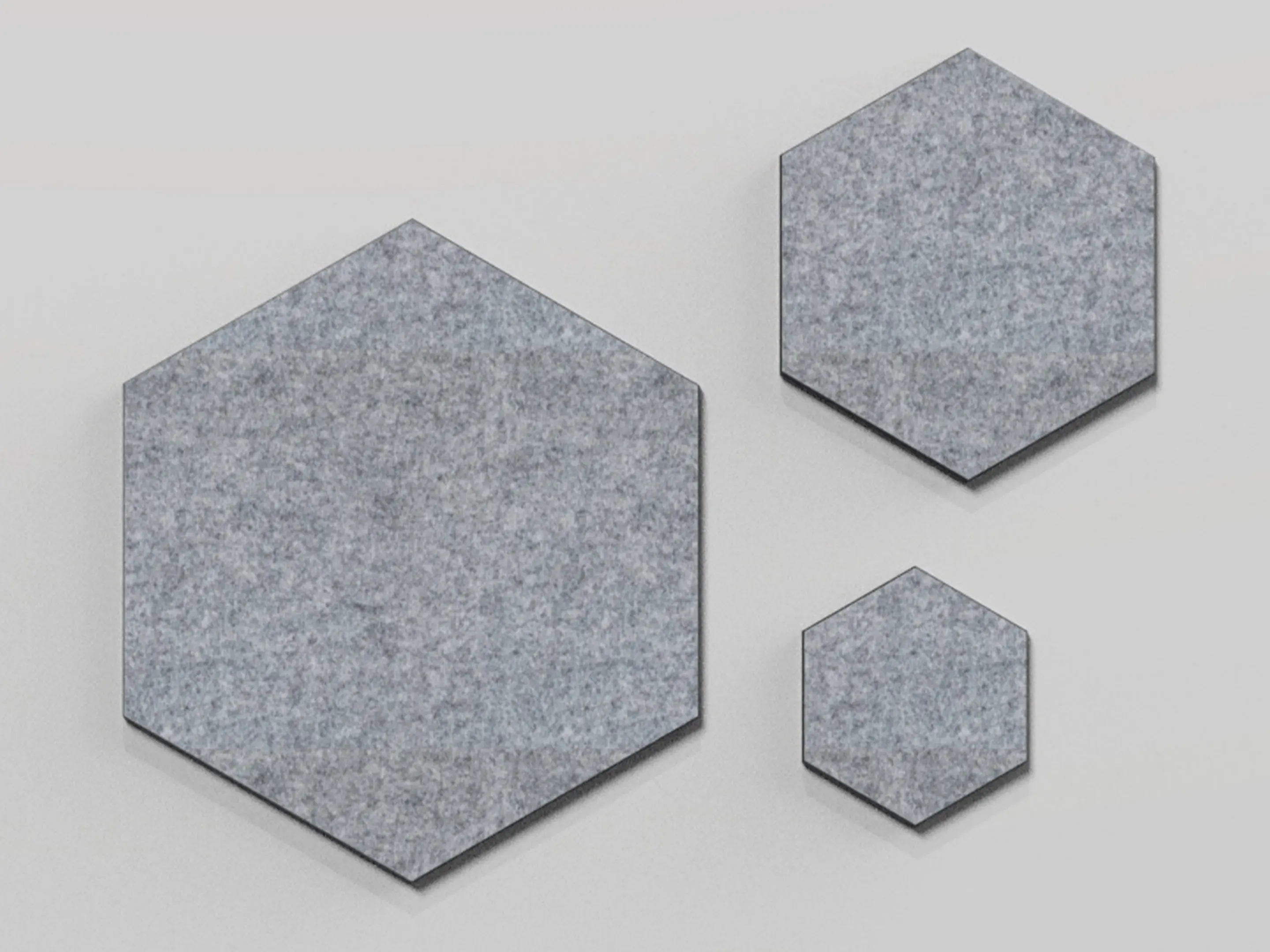 Zeshoekige akoestische tegels met totale breedte 30cm en zijdes 15cm met een NRC Waarde van 0,23. Met een V-vormige uitsnede in de rand. Bestellen als set in 1 kleur. Prijs per set.. Zonder installatieset. Voor montage wordt Pattex geadviseerd.
