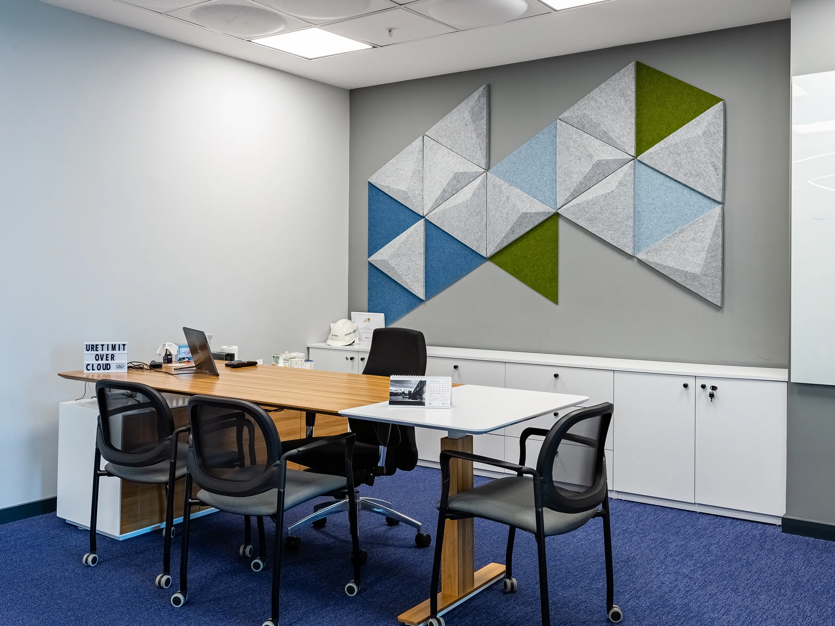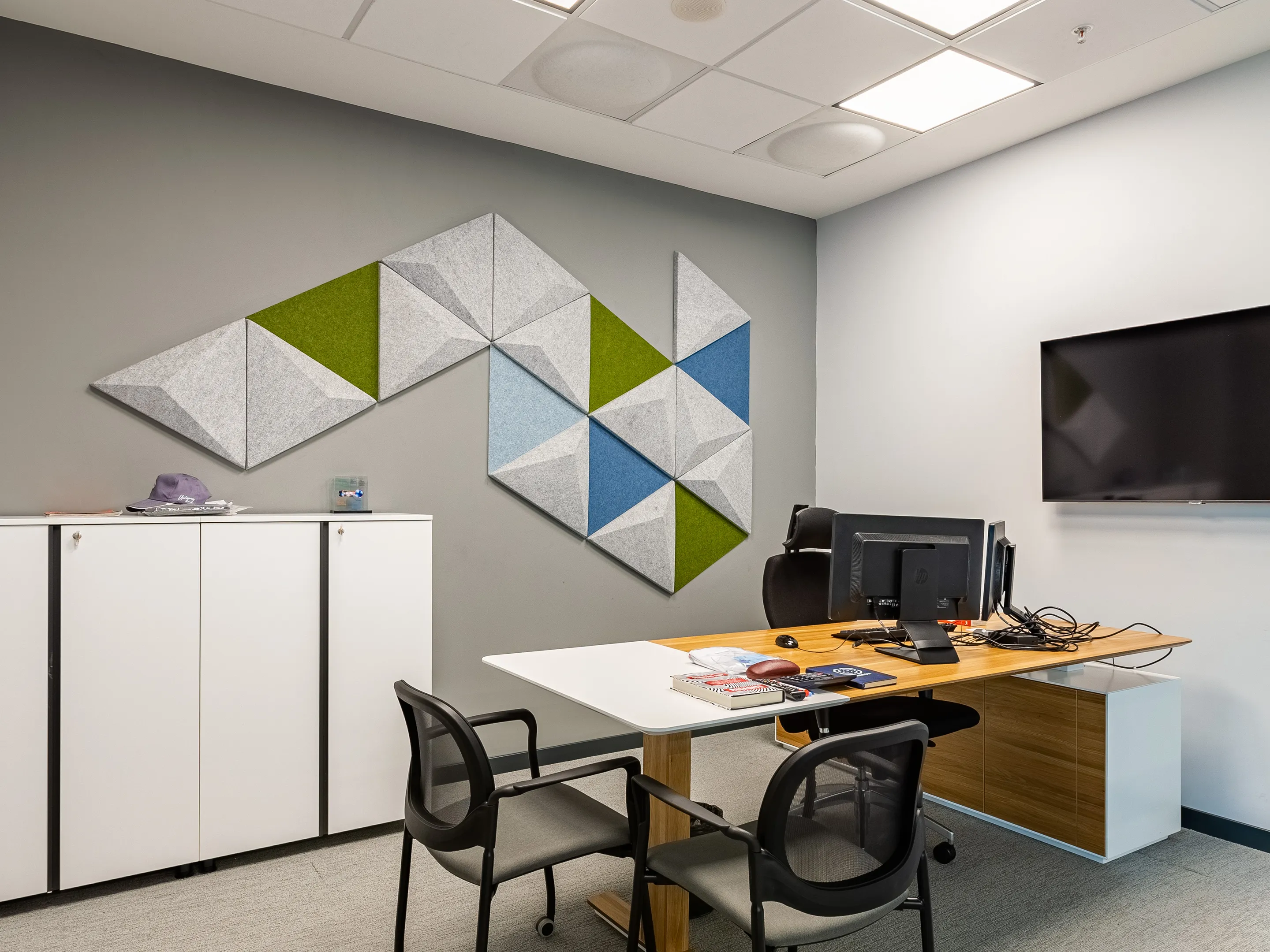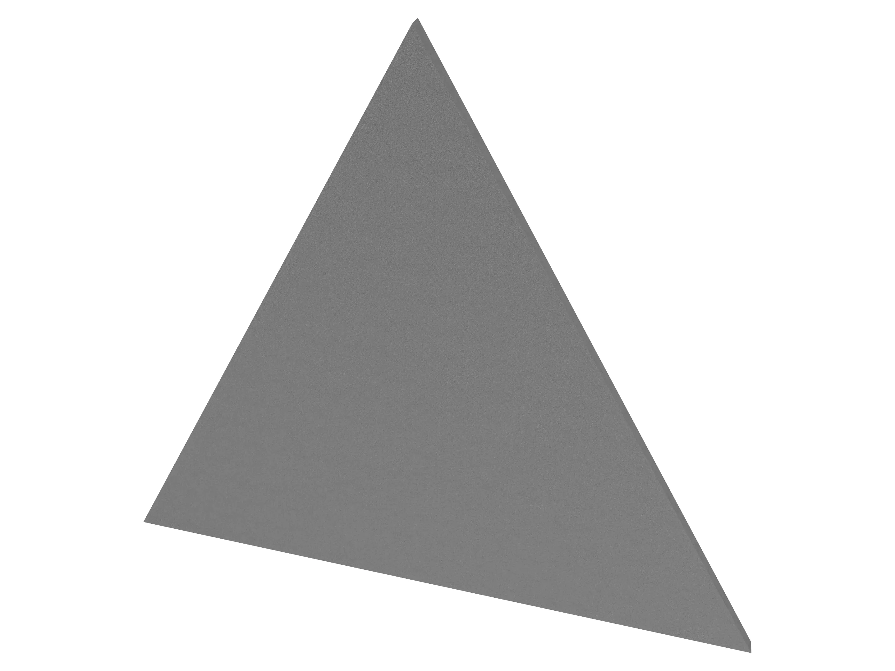 Driehoekige (rechthoekige driehoek) akoestische tegels met een NRC Waarde van 0,23. Met een V-vormige uitsnede in de rand. Bestellen als set in 1 kleur. Prijs per set.. Zonder installatieset. Voor montage zonder installatieset wordt Pattex geadviseerd.