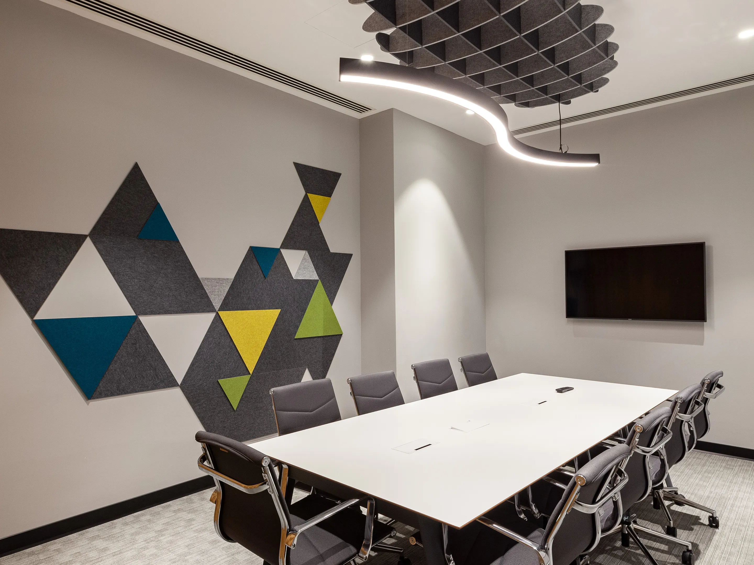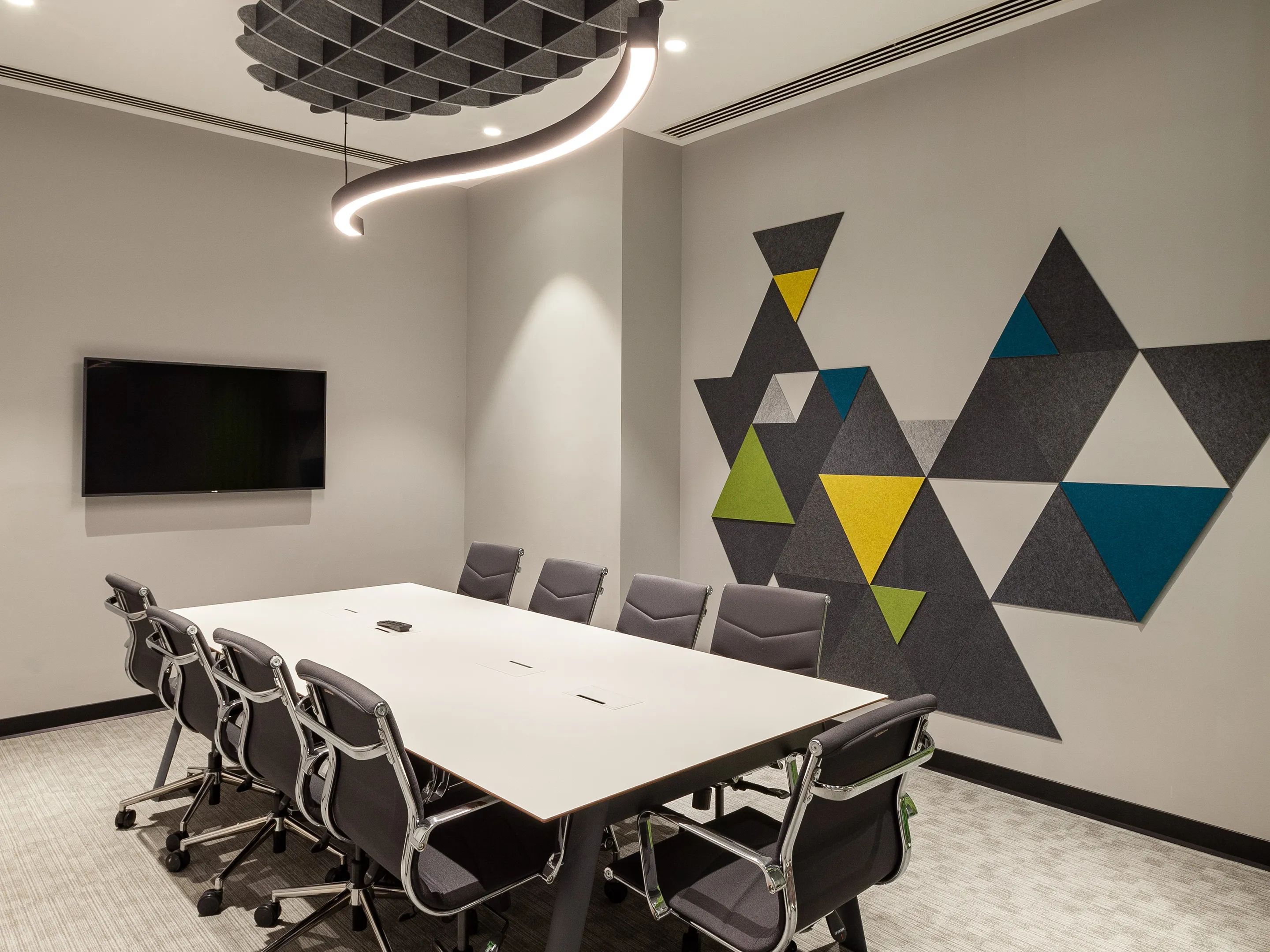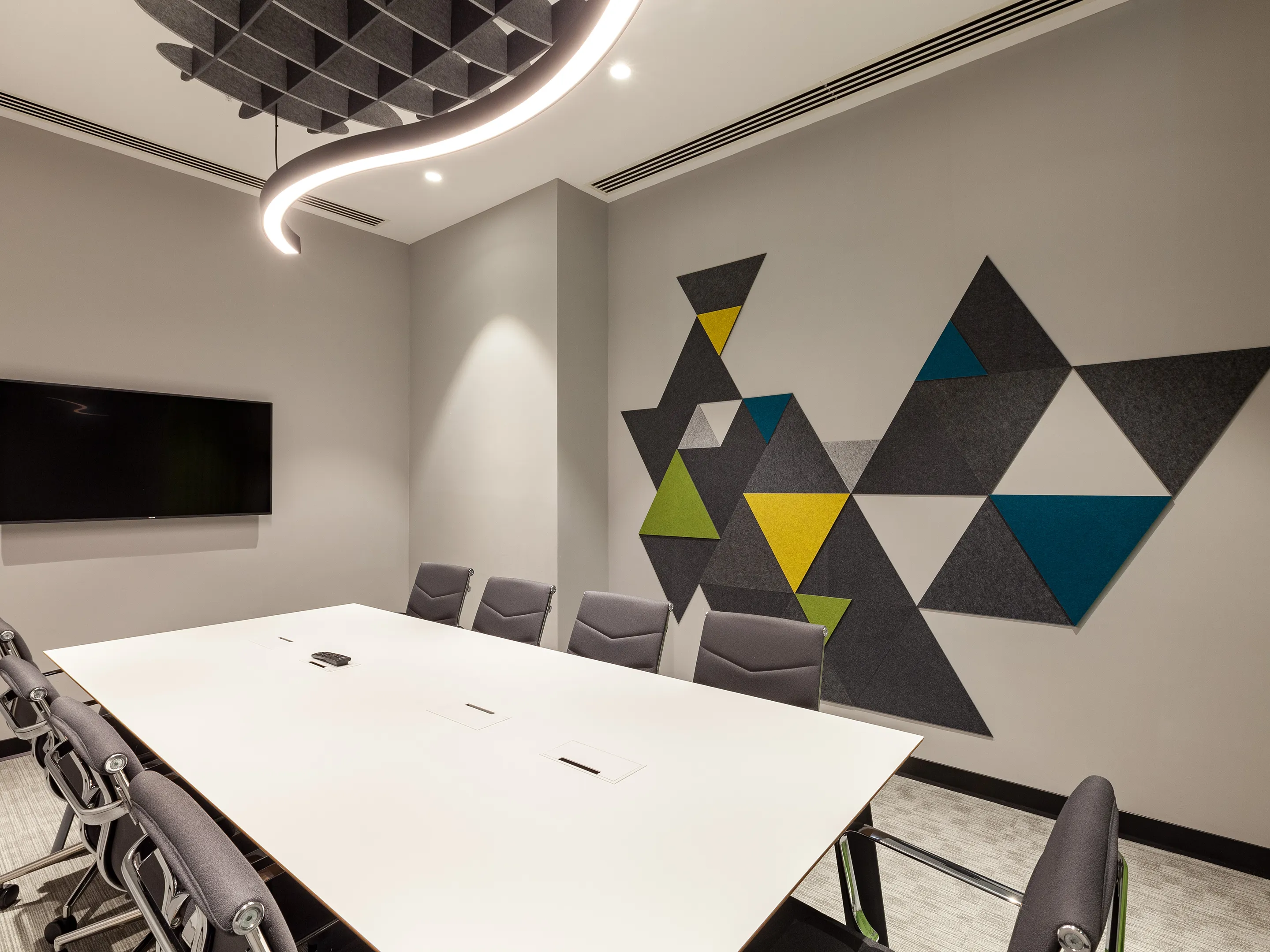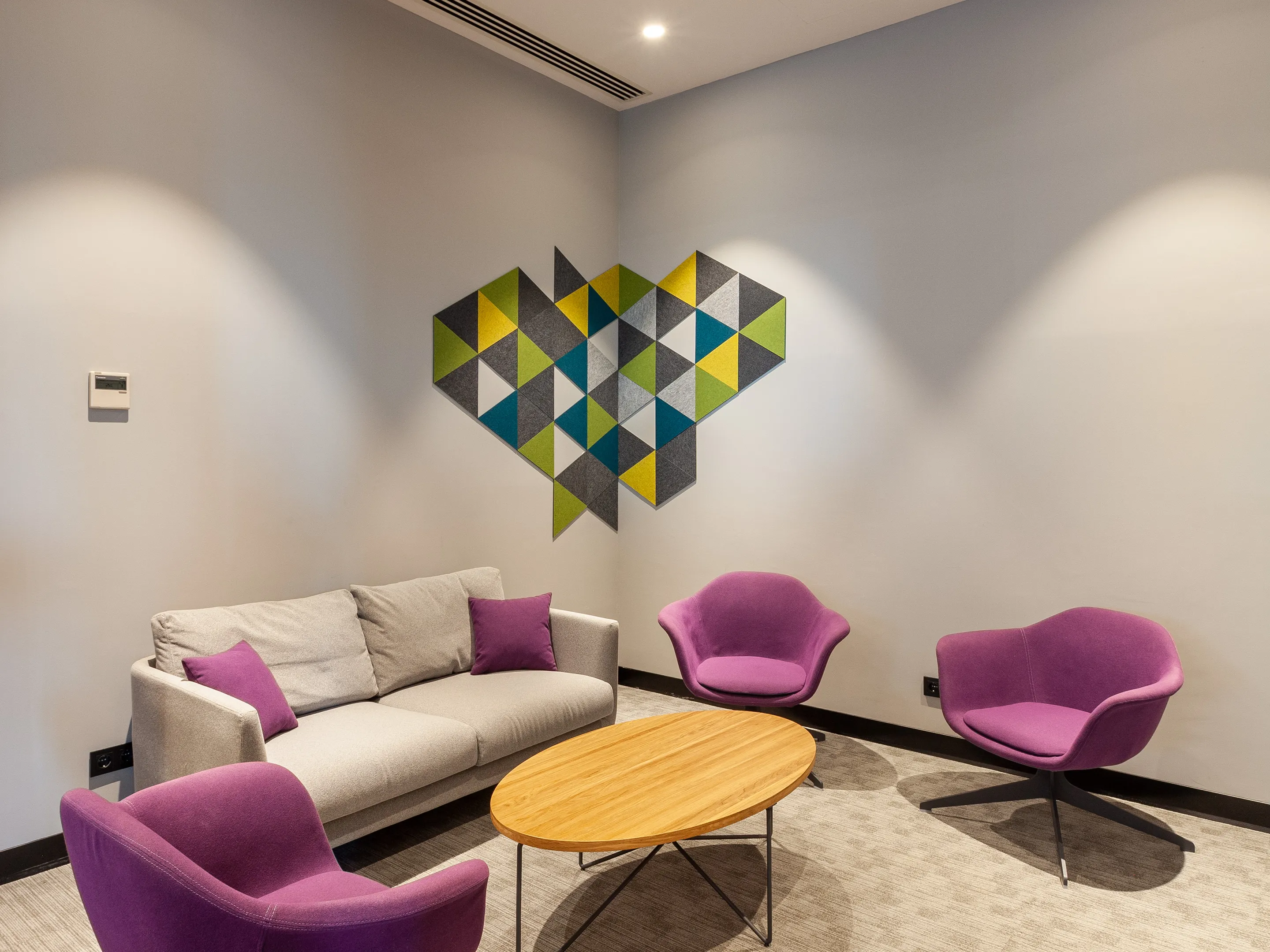 Driehoekige (rechthoekige driehoek) akoestische tegels met een NRC Waarde van 0,23. Met een V-vormige uitsnede in de rand. Bestellen als set in 1 kleur. Prijs per set.. Zonder installatieset. Voor montage zonder installatieset wordt Pattex geadviseerd.