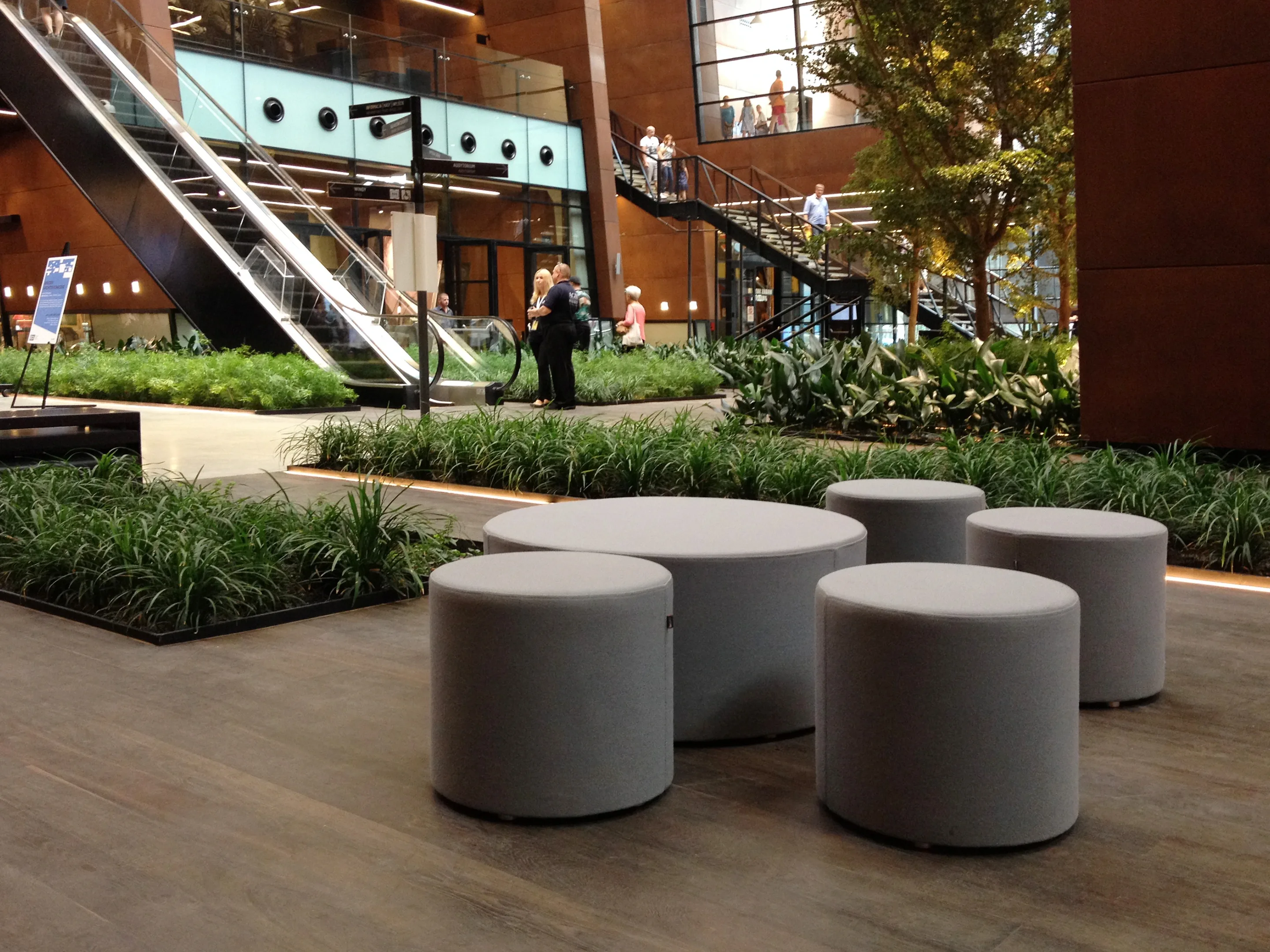 Volledig gestoffeerde ronde poef met een Ø1200mm op doppen, 410mm hoog