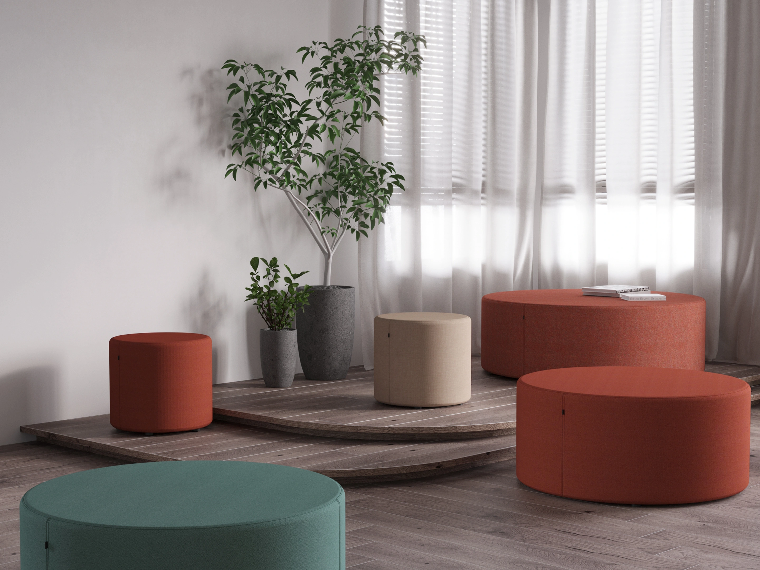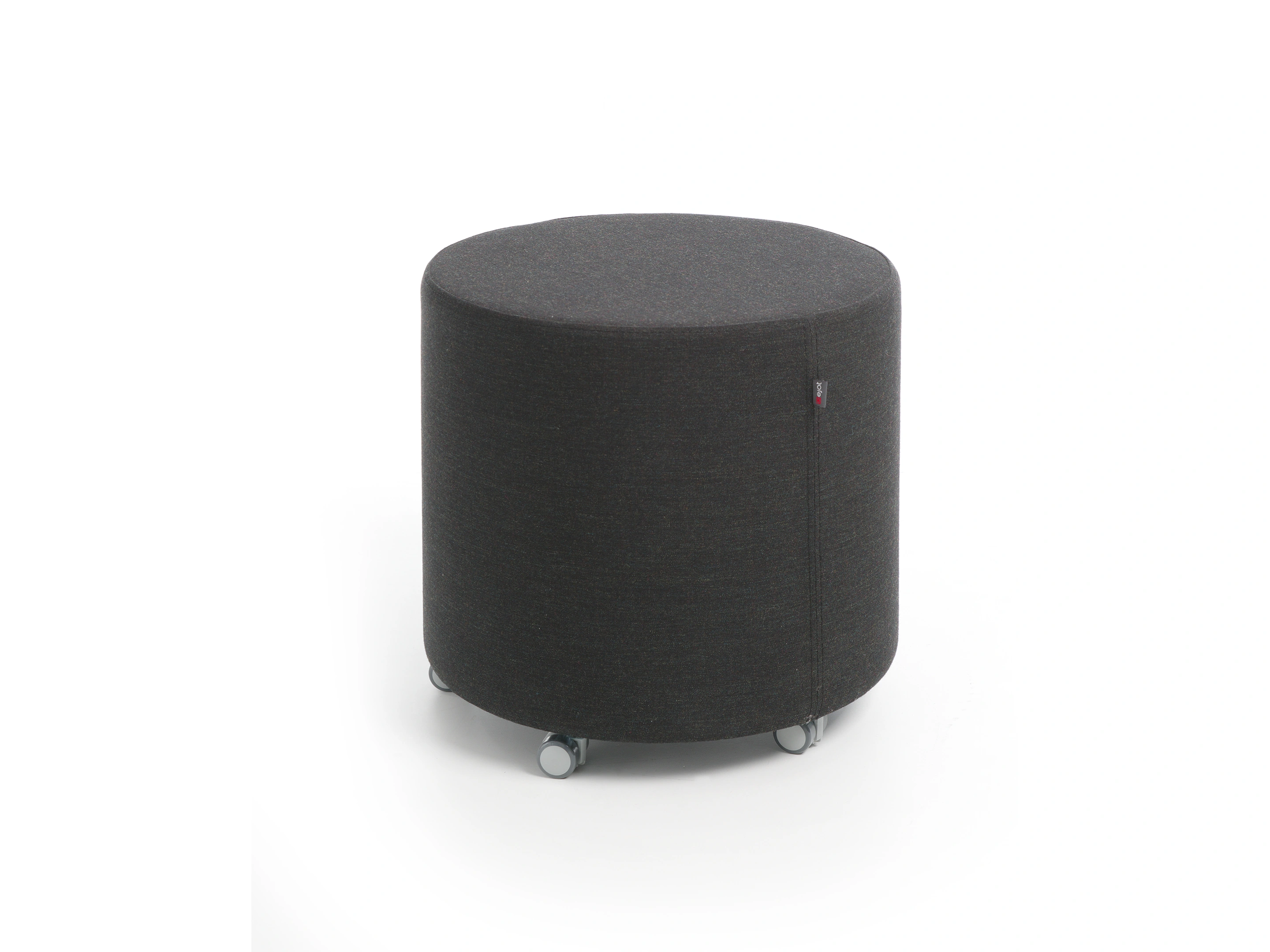 Volledig gestoffeerde ronde poef met een Ø450mm op Ø37mm wielen, 455mm hoog