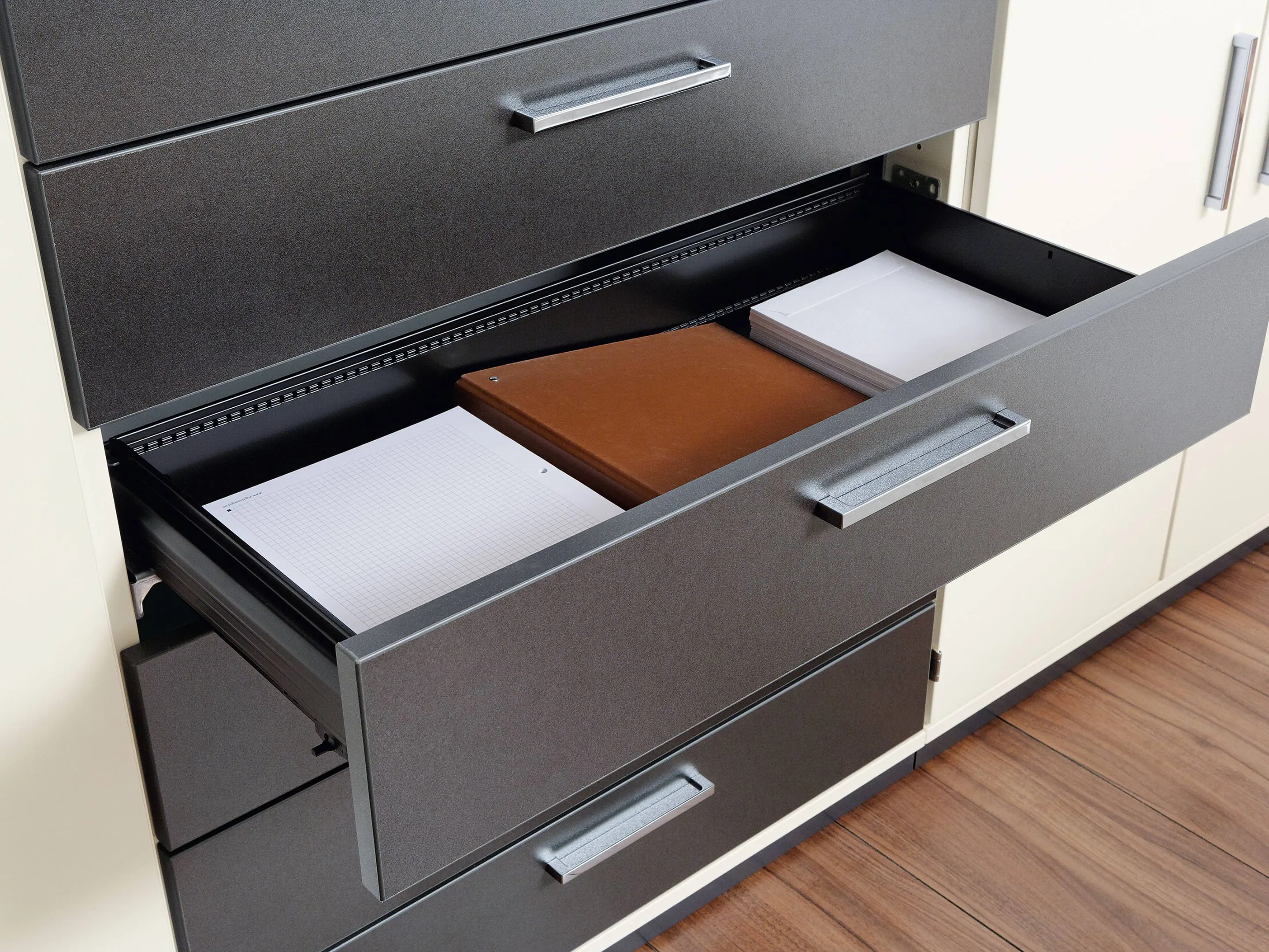 Ladenkast met uittrekbare hangmappenframes, compleet met uitrekbeveiliging, contragewicht en metalen sokkel. Ladeconfiguratie: beneden: 5HE, midden: 5,5HE, boven 6HE. Afmeting: 1000 x 1141 x 661mm (BxHxD)
