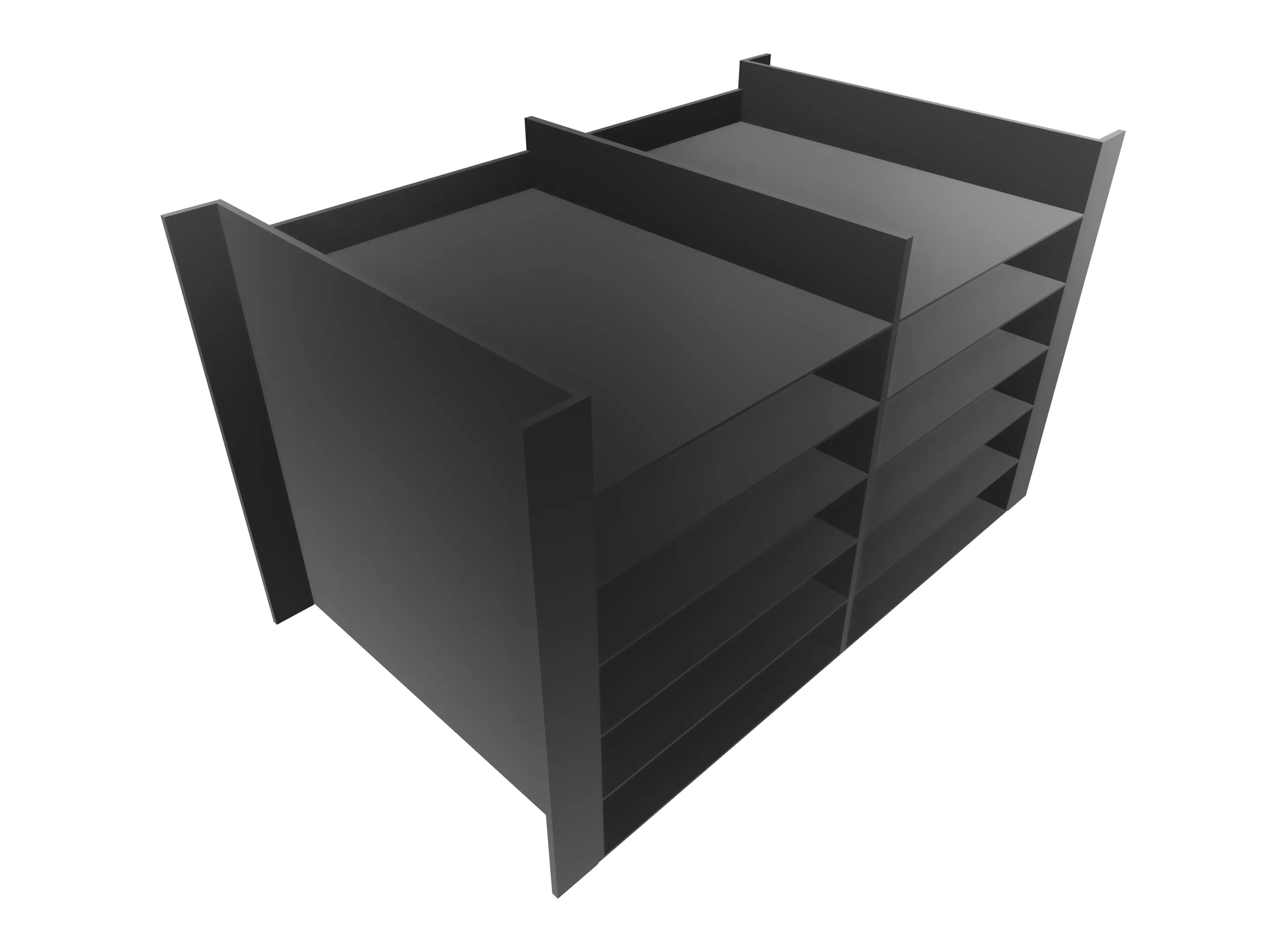 12 laden à 275 mm open, incl. tekstplaatjes, 2 zijwanden, 1 tussenwand, 4 vullijsten à 48 mm Afmeting: 660 x 325 x 320mm (BxHxD)