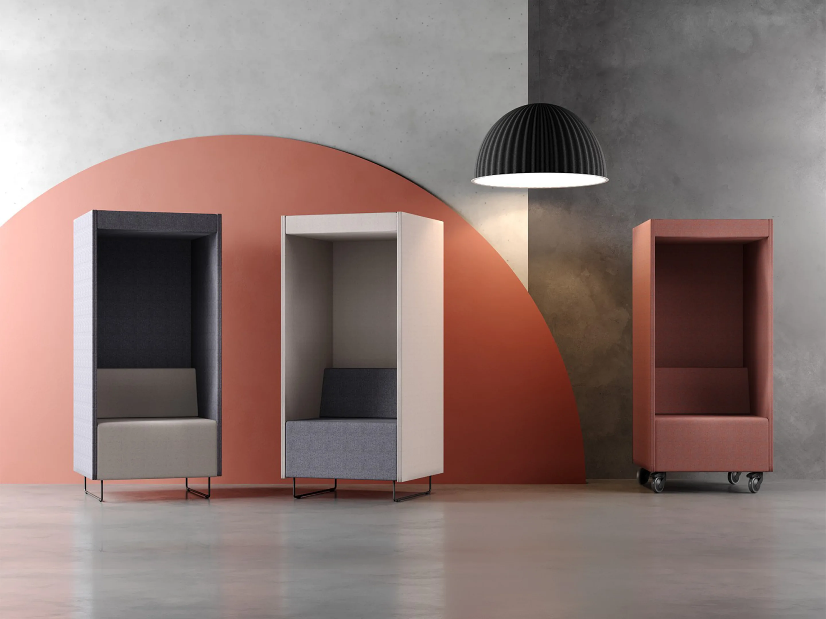 Volledig gestoffeerde akoestische bank, volledig omsloten, op 4 wielen, waarvan 2 geremd zijn