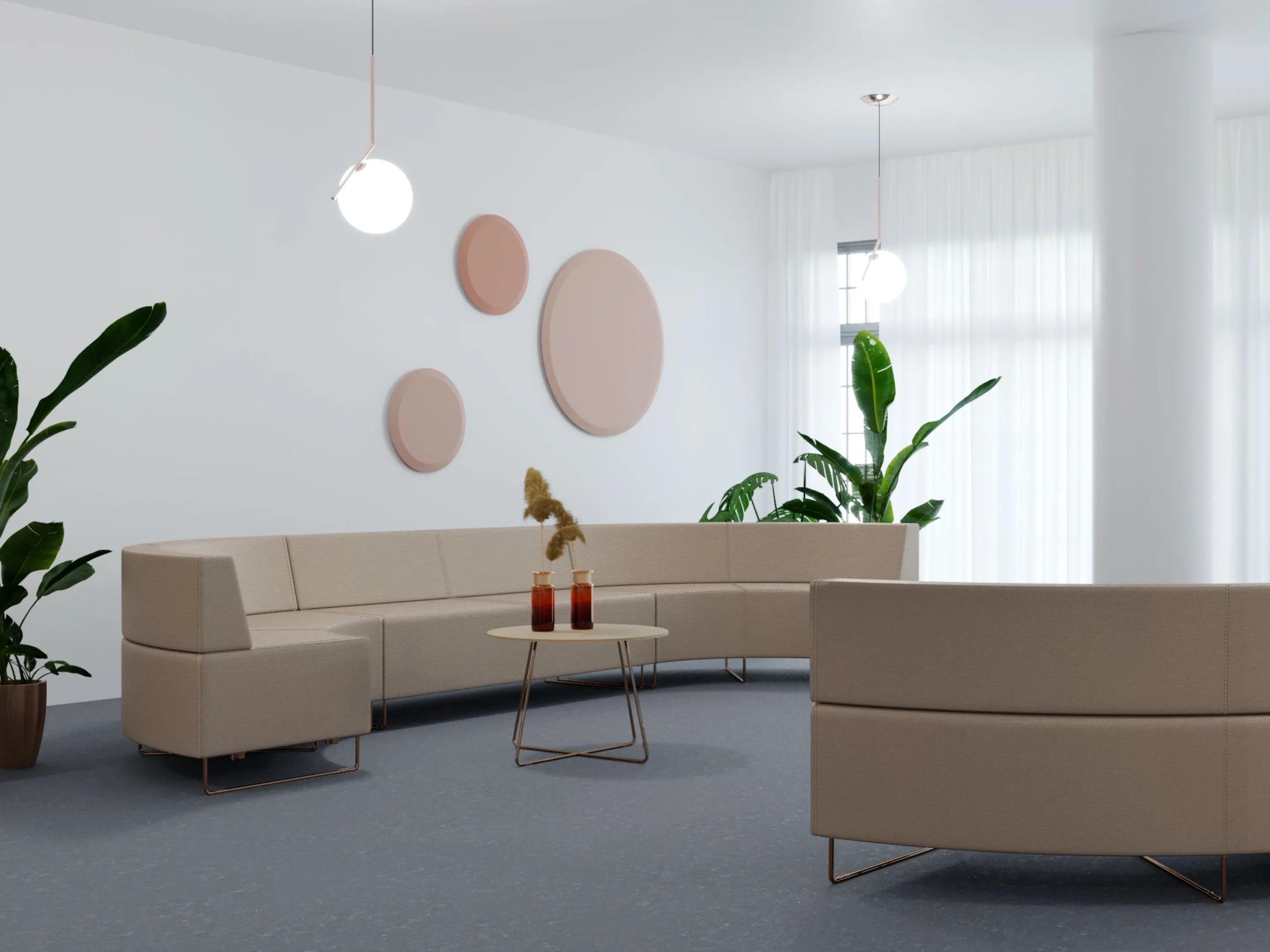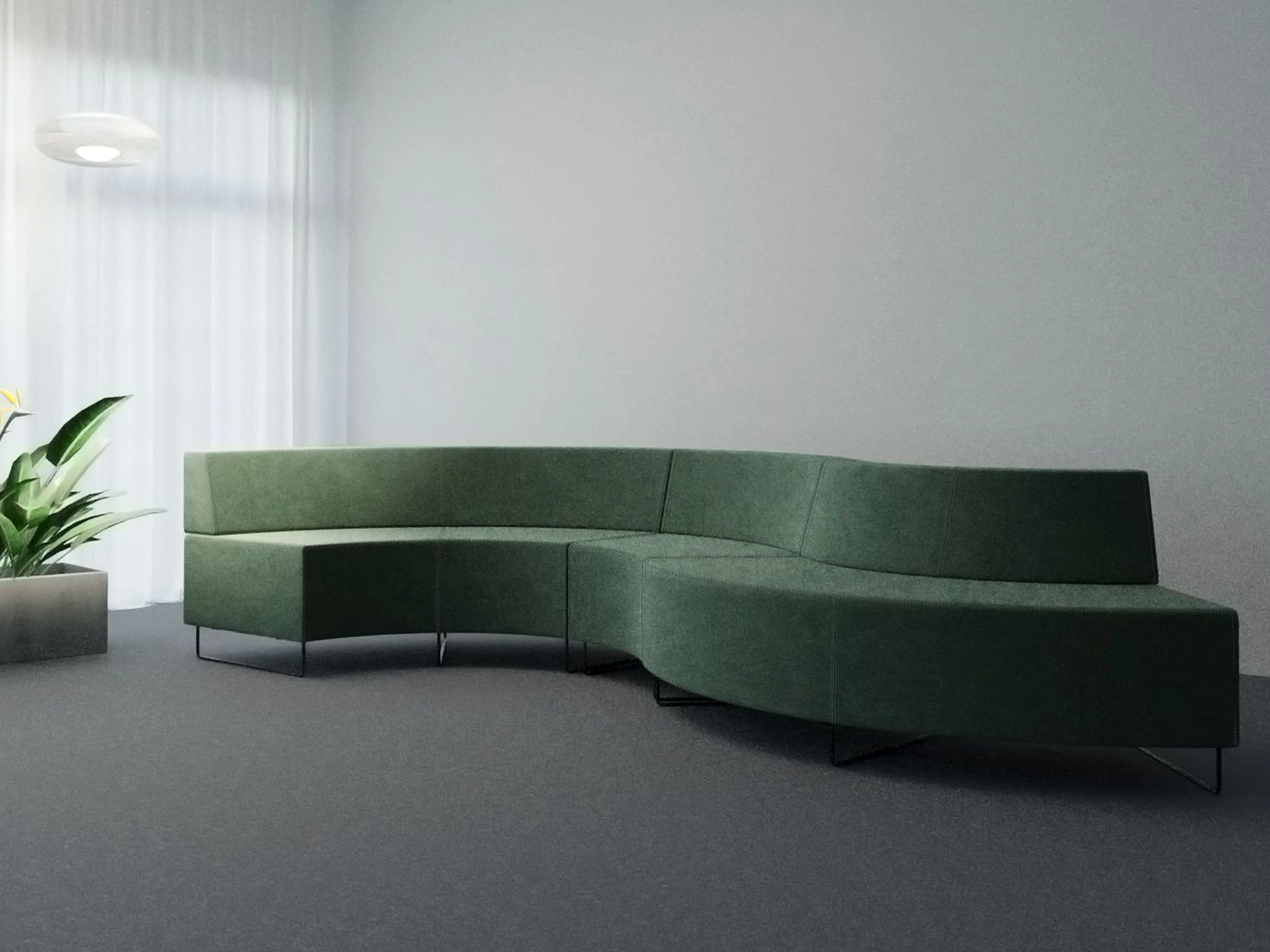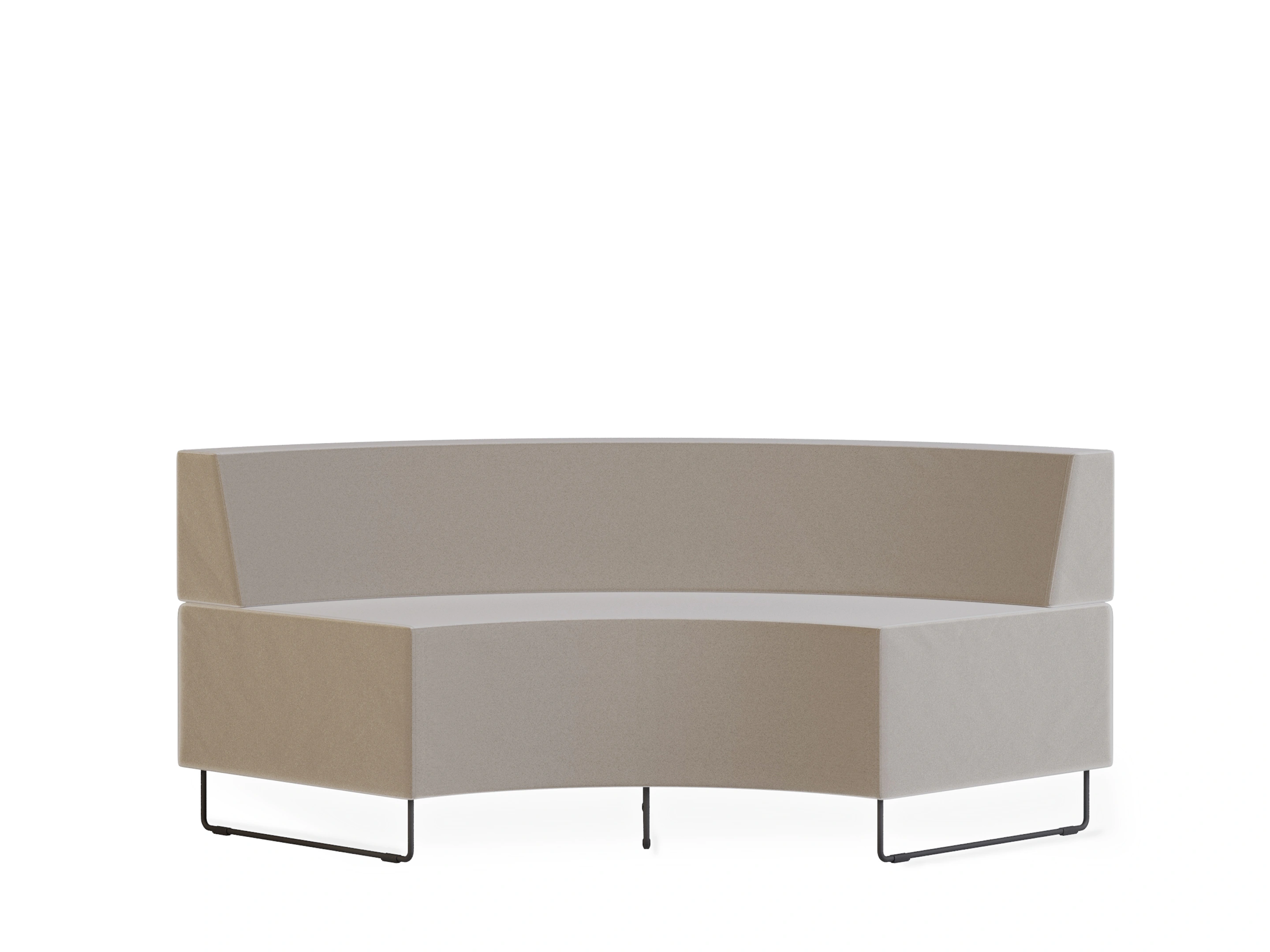 Naar binnen geronde gestoffeerde 2-zits bank met sledeframe en een hoek van 45°. Buitendiameter: 2780mm, Binnendiameter 1400mm (genoteerde diameters van toepassing bij een volledig gesloten opstelling en dezelfde type banken). Inclusief rugleuning
