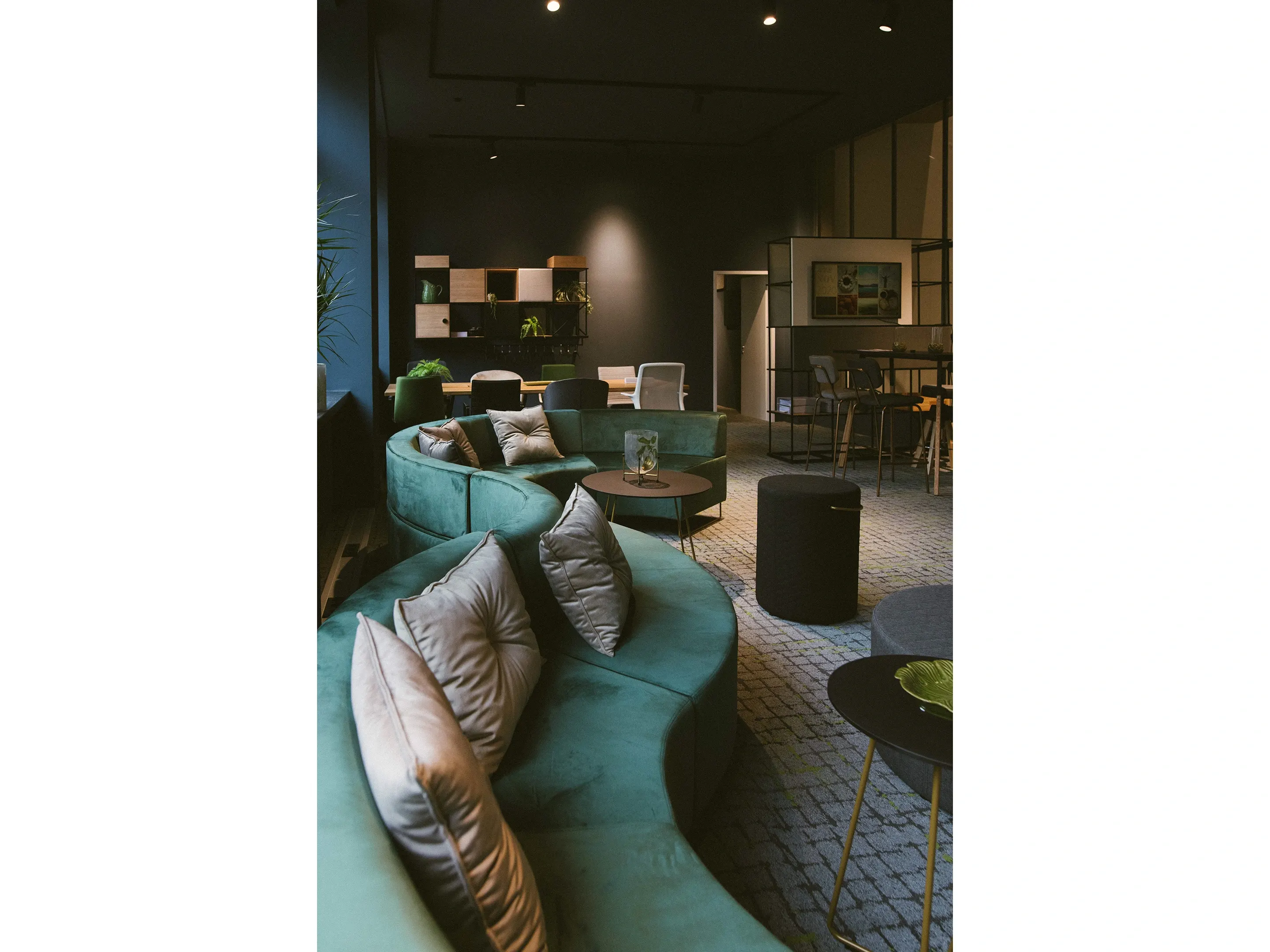 Naar binnen geronde gestoffeerde 2-zits bank met sledeframe en een hoek van 45°. Buitendiameter: 4380mm, Binnendiameter 3000mm (genoteerde diameters van toepassing bij een volledig gesloten opstelling en dezelfde type banken). Inclusief rugleuning