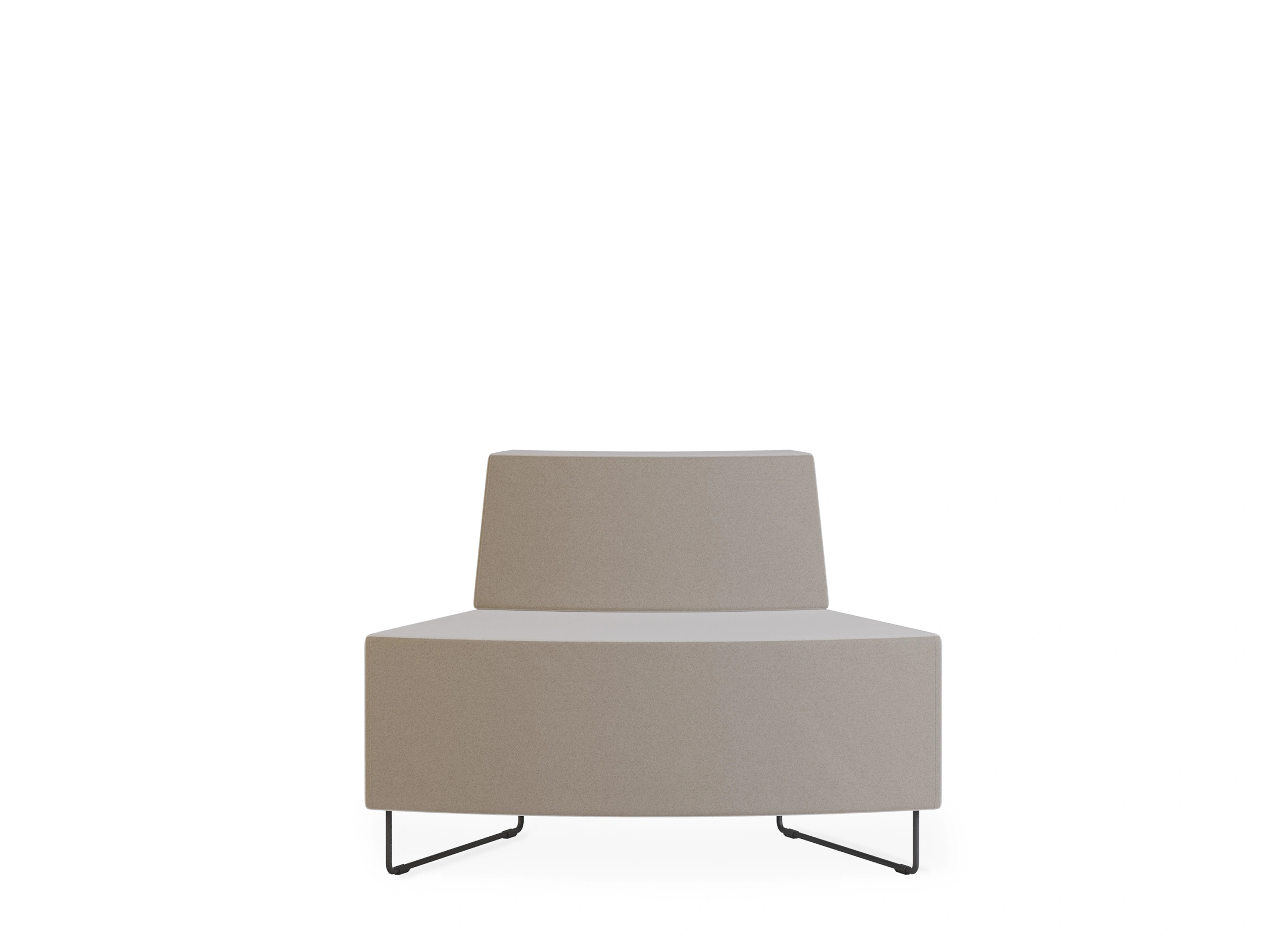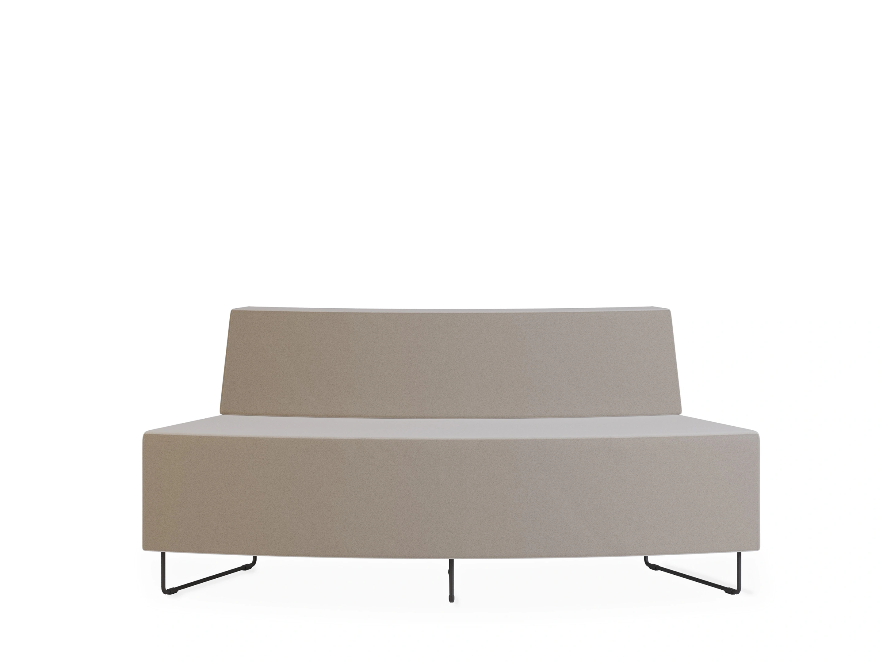 Naar buiten geronde gestoffeerde 2-zits bank met sledeframe en een hoek van 45°. Buitendiameter: 4380mm, Binnendiameter 3000mm (genoteerde diameters van toepassing bij een volledig gesloten opstelling en dezelfde type banken). Inclusief rugleuning
