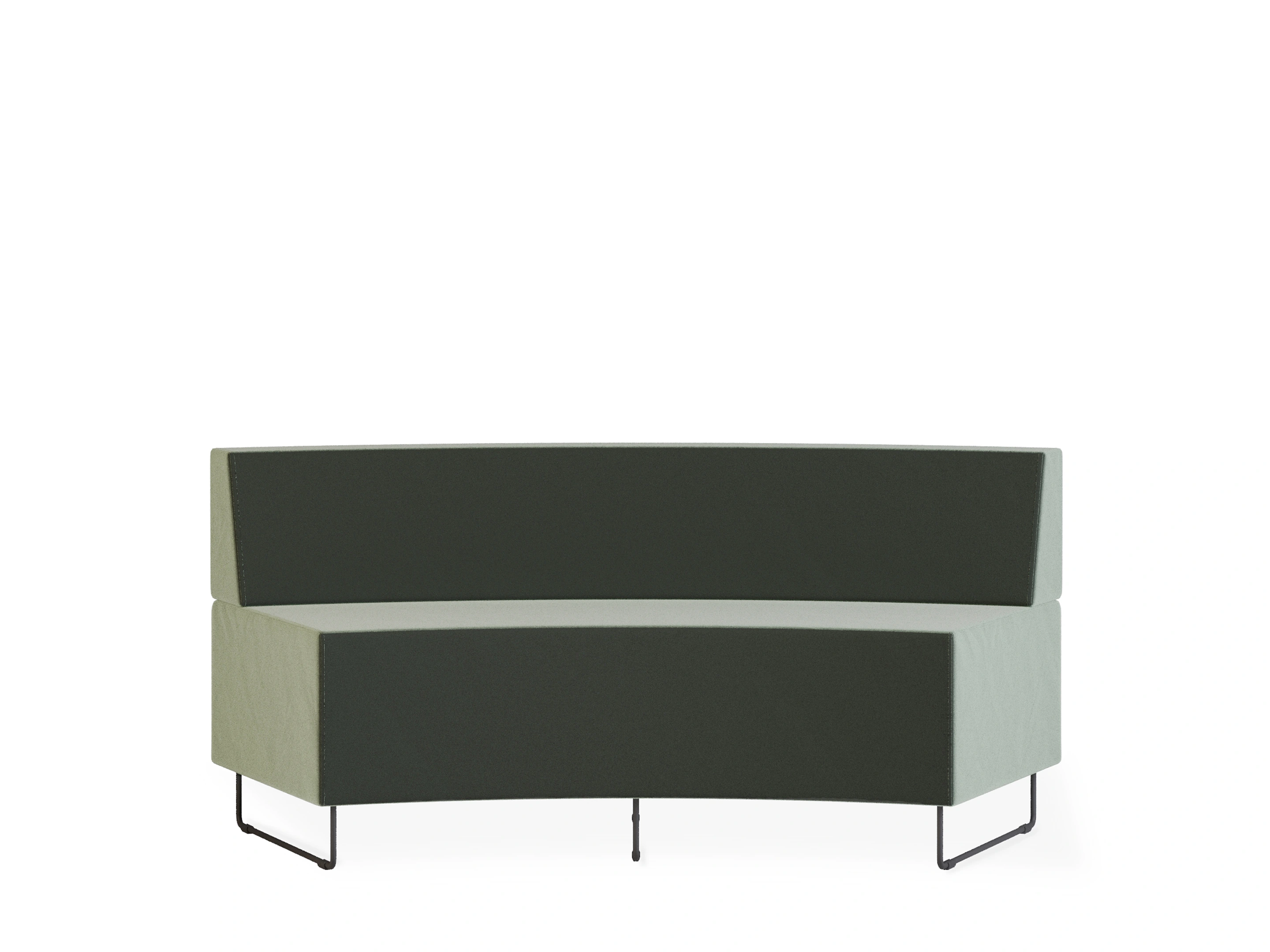 Naar binnen geronde gestoffeerde 2-zits bank met sledeframe en een hoek van 90°. Buitendiameter: 2580mm, Binnendiameter 1200mm (genoteerde diameters van toepassing bij een volledig gesloten opstelling en dezelfde type banken). Inclusief rugleuning