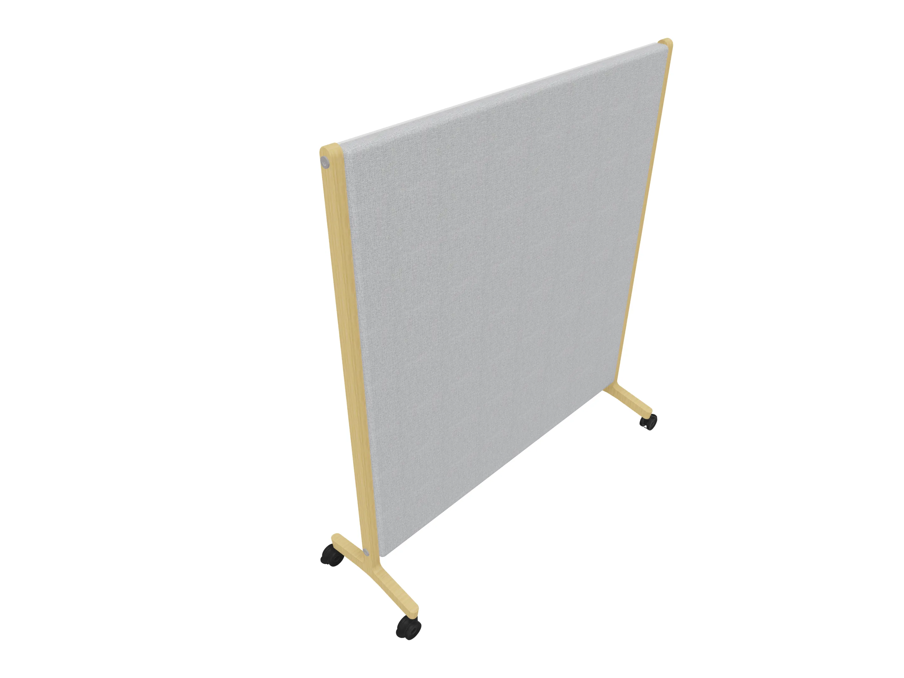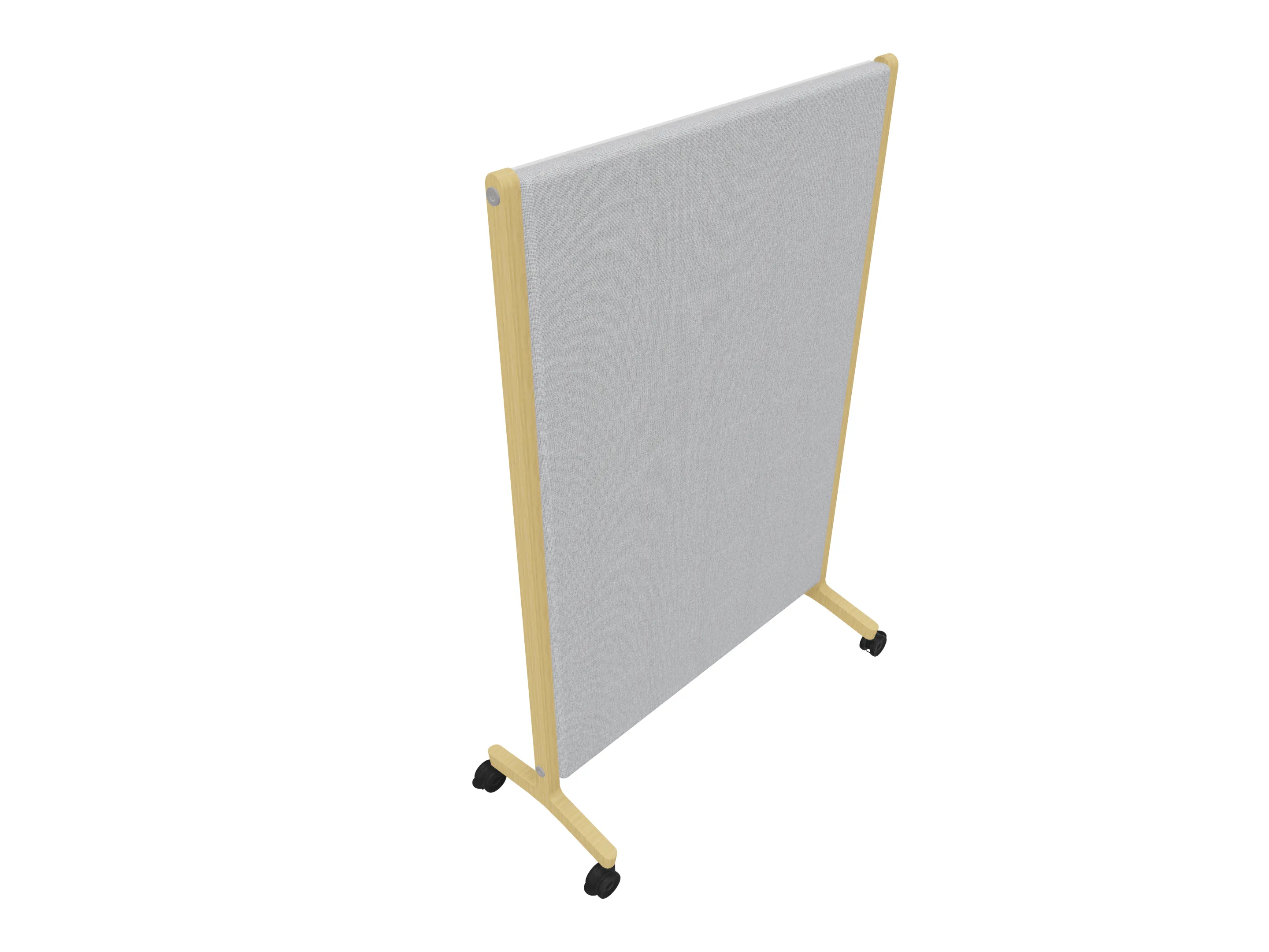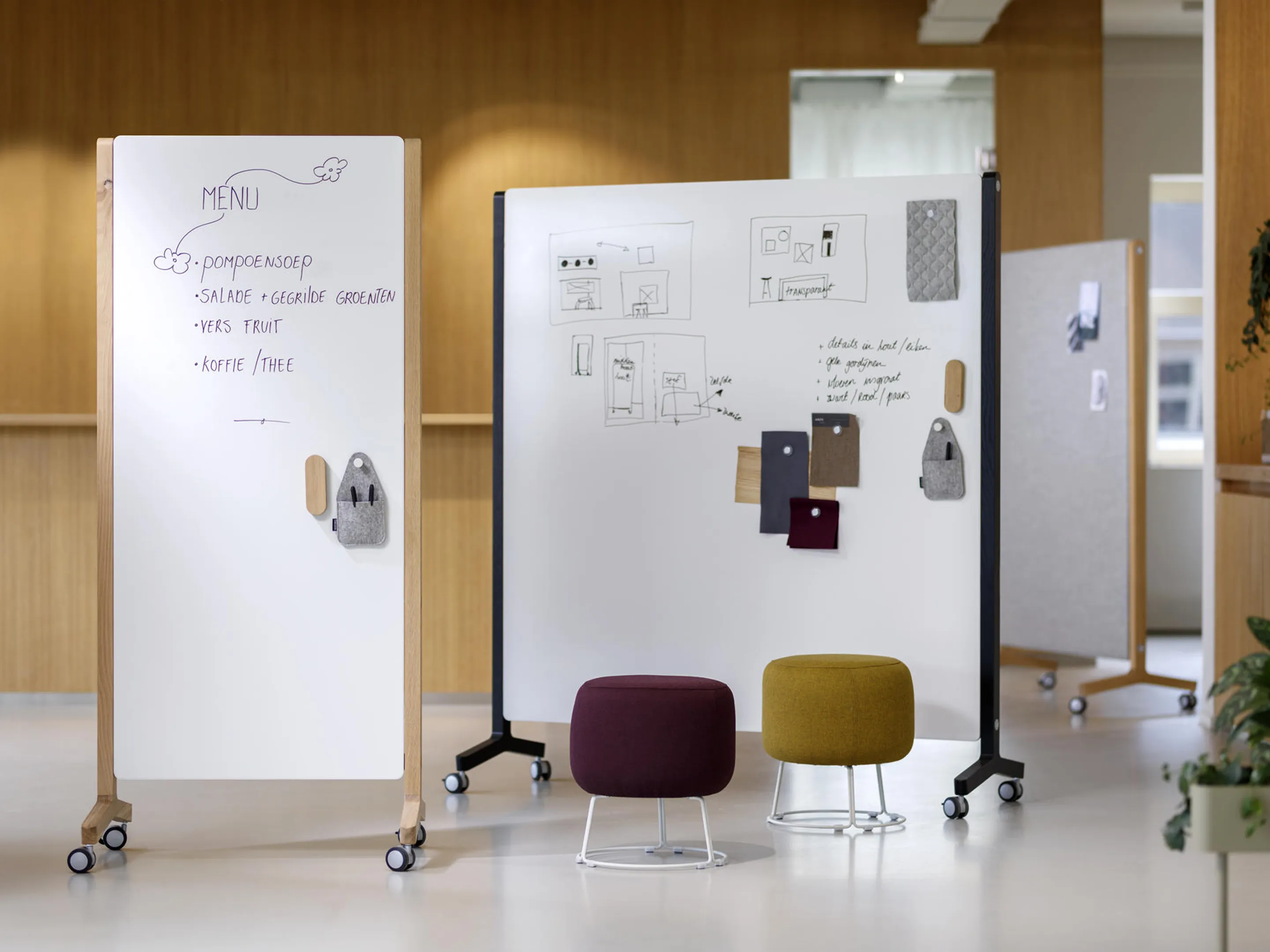 Verrijdbare akoestische whiteboard met houten frame. Uitgevoerd als "premium akoestisch". Afmeting: 900 x 500 x 1800mm (BxDxH).