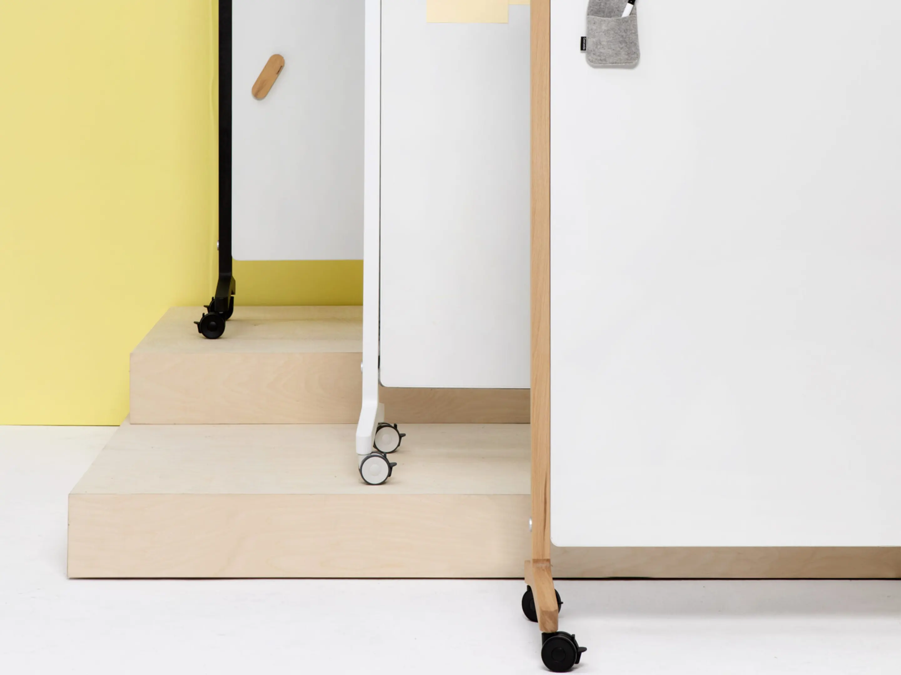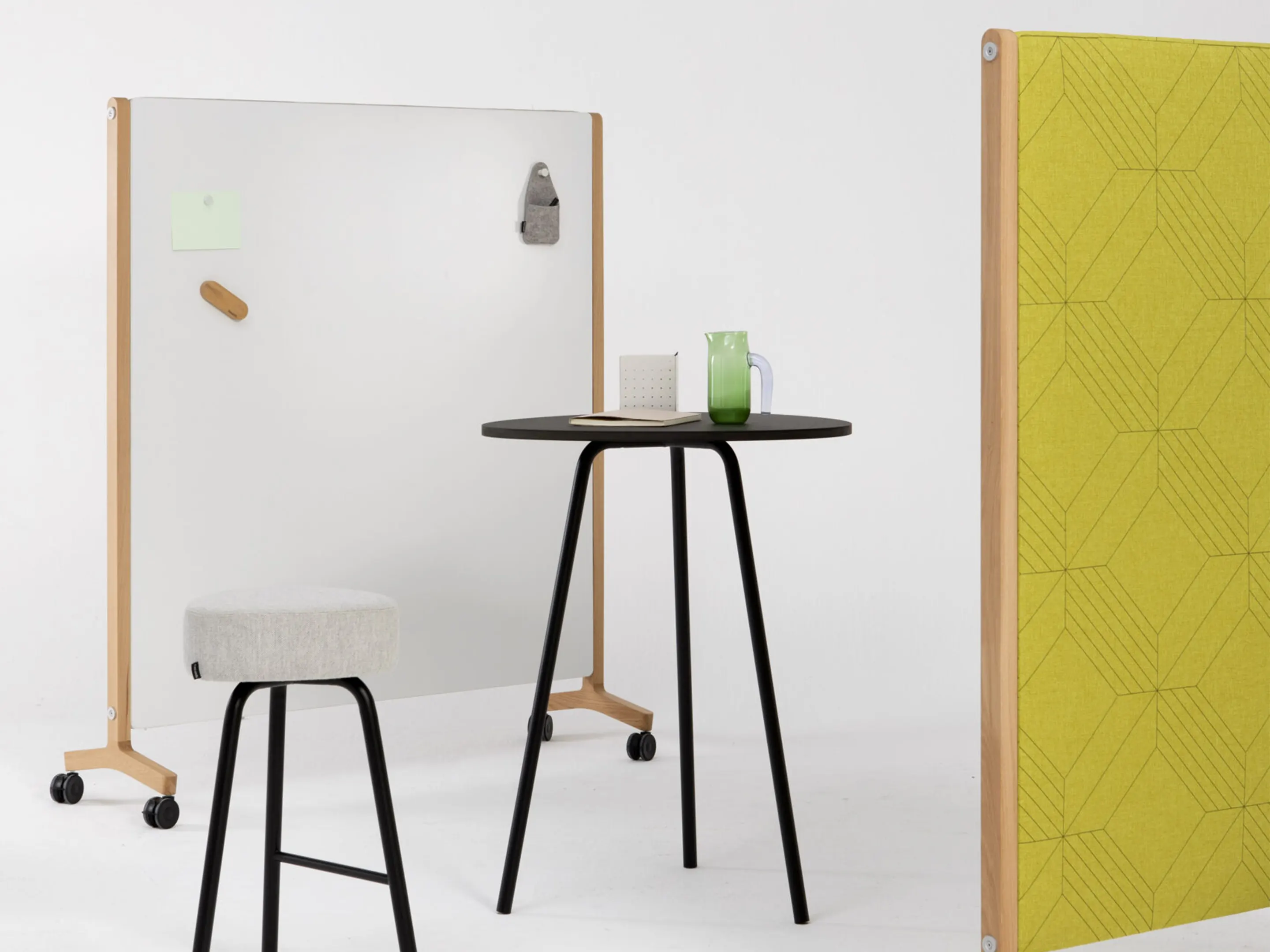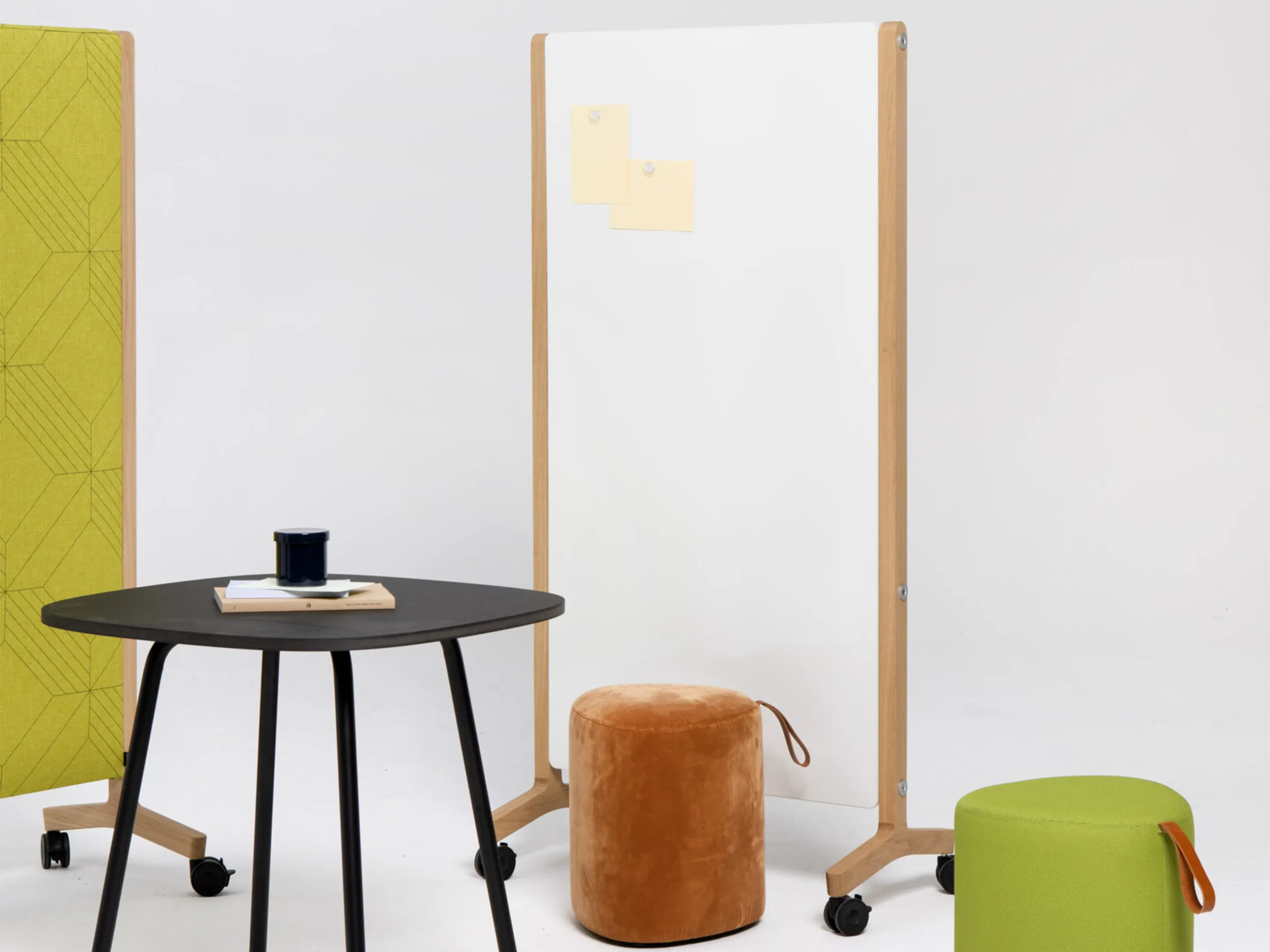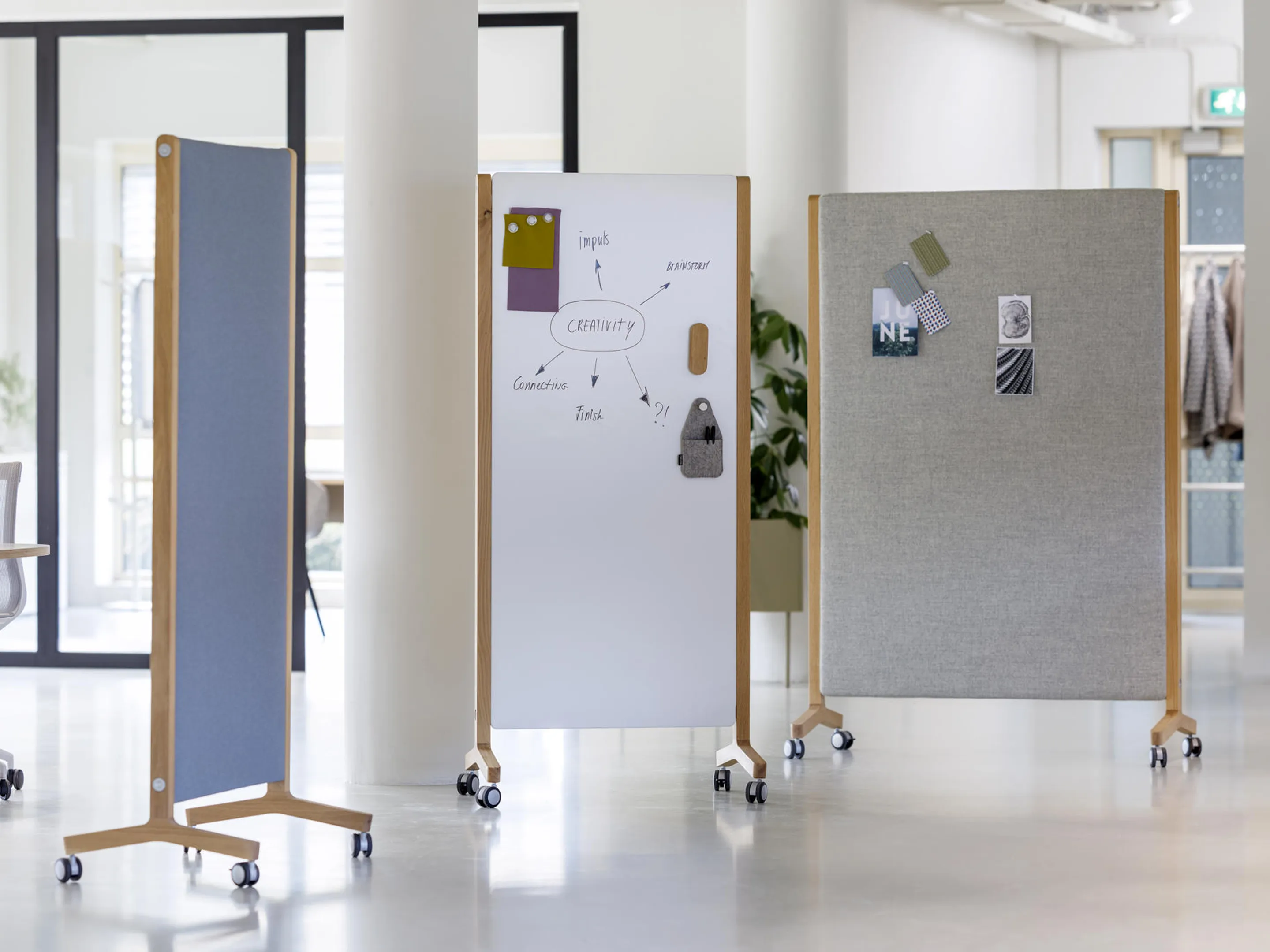 Verrijdbare akoestische whiteboard met houten frame. Uitgevoerd als "premium akoestisch". Afmeting: 900 x 500 x 1800mm (BxDxH).