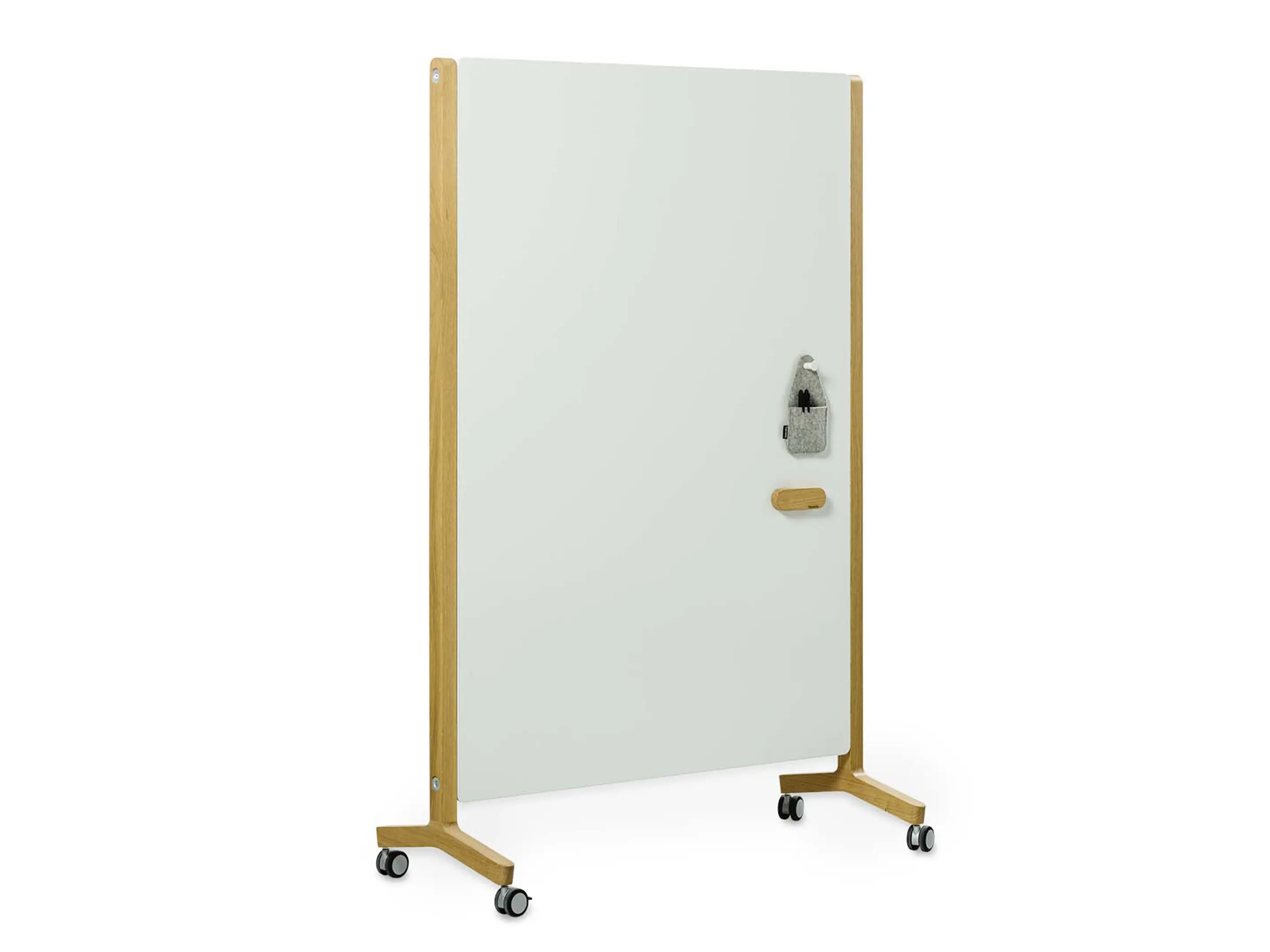 Verrijdbare akoestische whiteboard met houten frame. Uitgevoerd als "standaard akoestisch". Afmeting: 900 x 500 x 1800mm (BxDxH).
